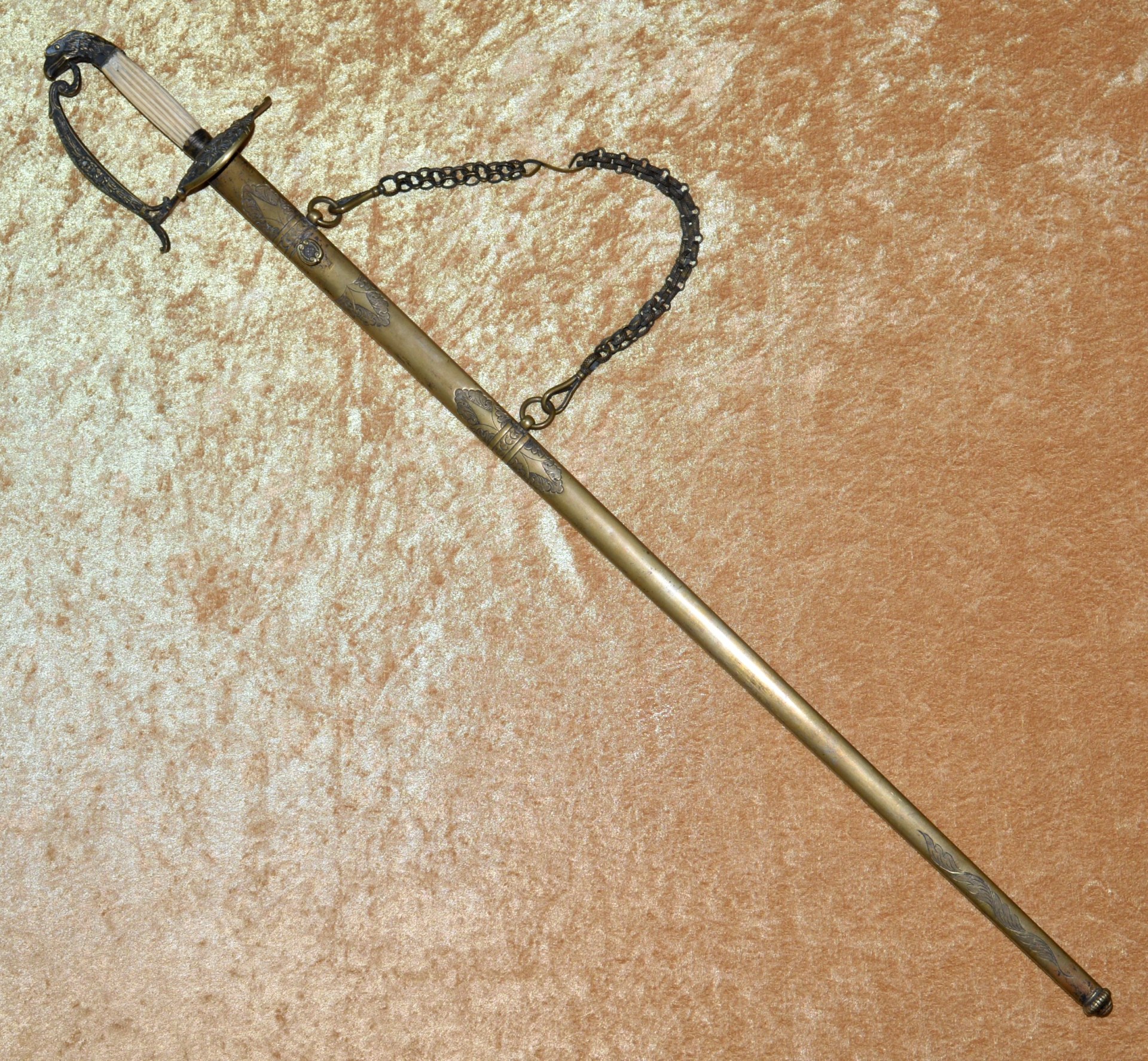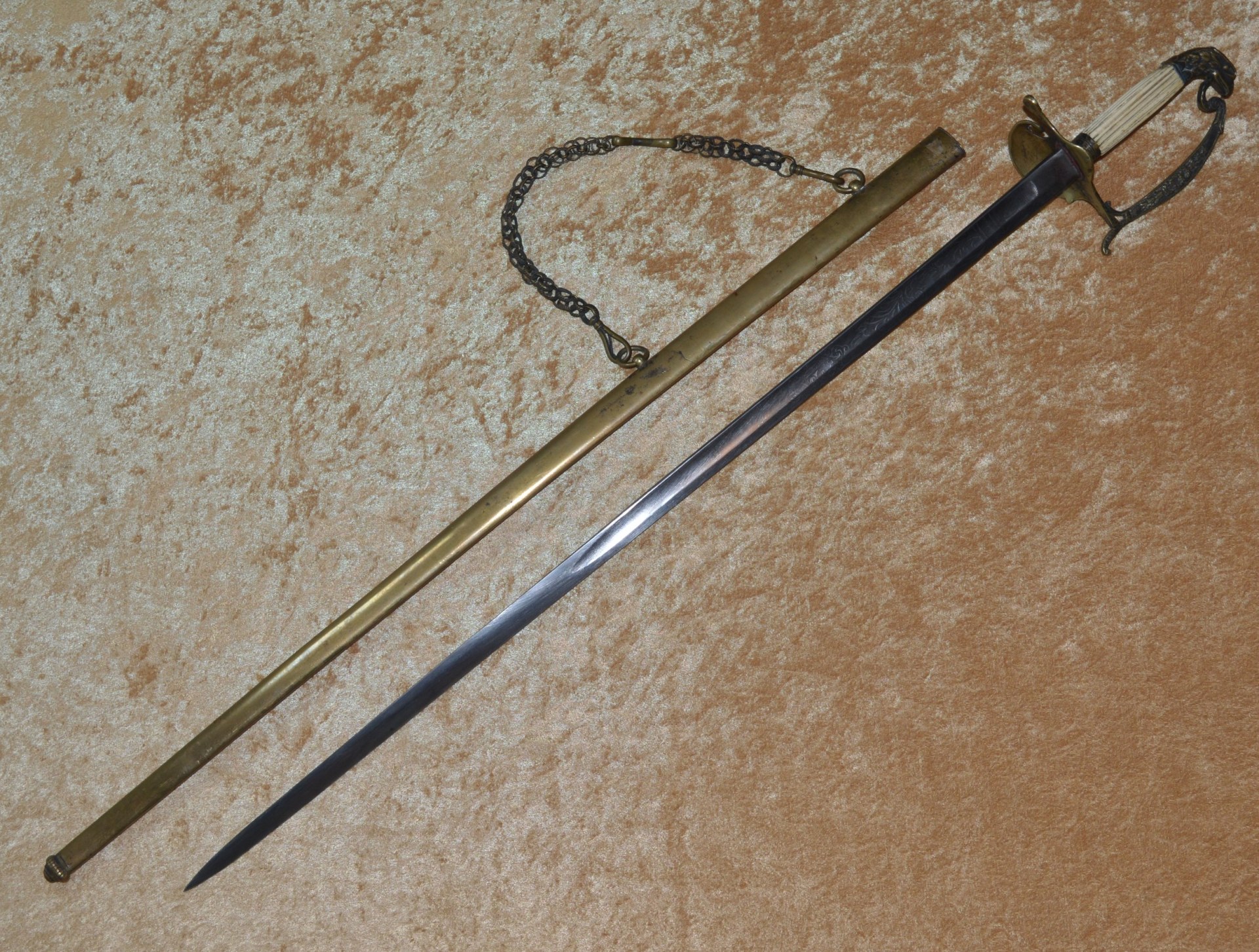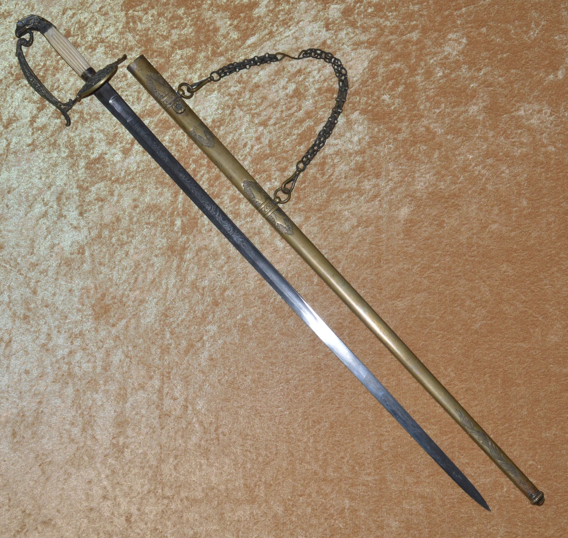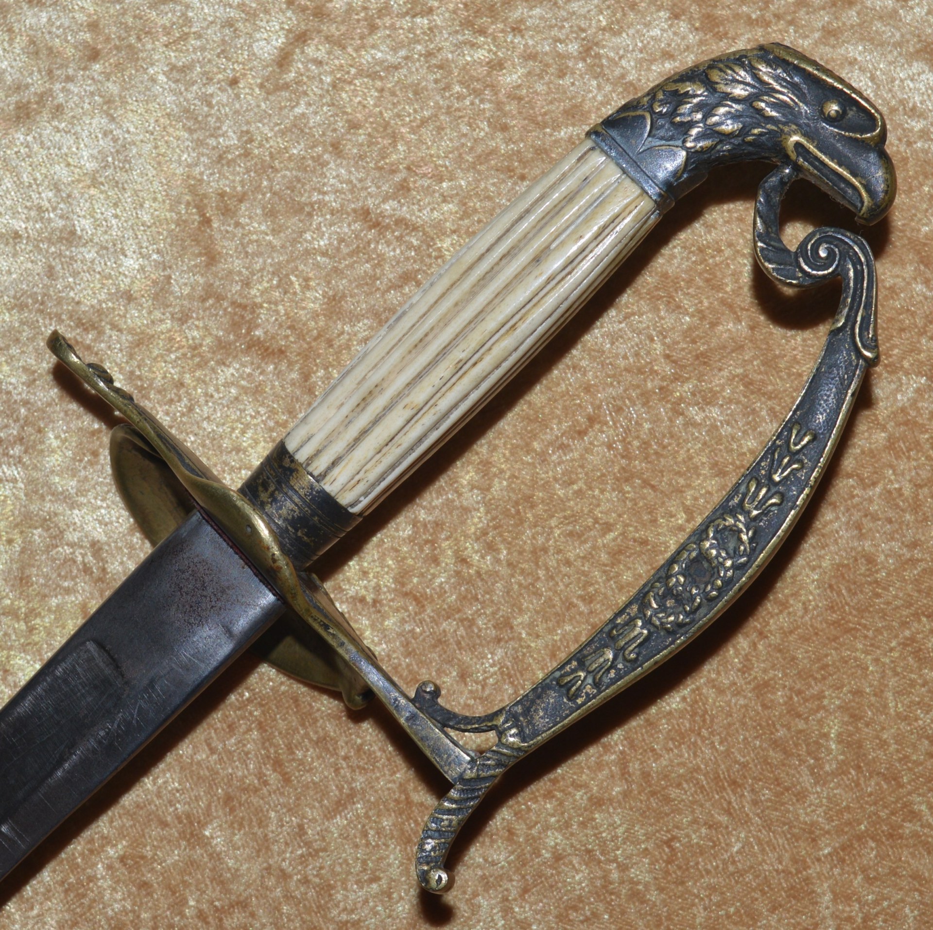 Featuring cast brass hilt with Widmann Type VI eagle head pommel, downcurved shell guard with spread-wing eagle in relief, rear quillon with flat shell terminal, and elaborate knuckle bow. Reeded bone grip (small defect on top obverse) with decorative brass base ferrule. Straight 27 3/4” (70.5 cm) single-edged blade, likely a German import, with broad 2/3 length fuller, etched with scrolling foliage and stands of arms (worn). Original brass scabbard with frog stud and two carry rings, beautifully decorated with classical design; elaborate brass chain hanger. Though unsigned, this is certainly the work of Frederick William Widmann (178?-1848), a German immigrant who came to Philadelphia in 1816. Already trained as a sword cutler, with connections to the Solingen blade market, he set up shop in Philadelphia, where he worked until his death in 1848. Very good condition, the brass with pleasing patina. Overall length 32 5/8”, not including scabbard. Similar examples illustrated and described in E. Andrew Mowbray=s AThe American Eagle-Pommel Sword, the Early Years- 1794-1830″, pages 190-191.