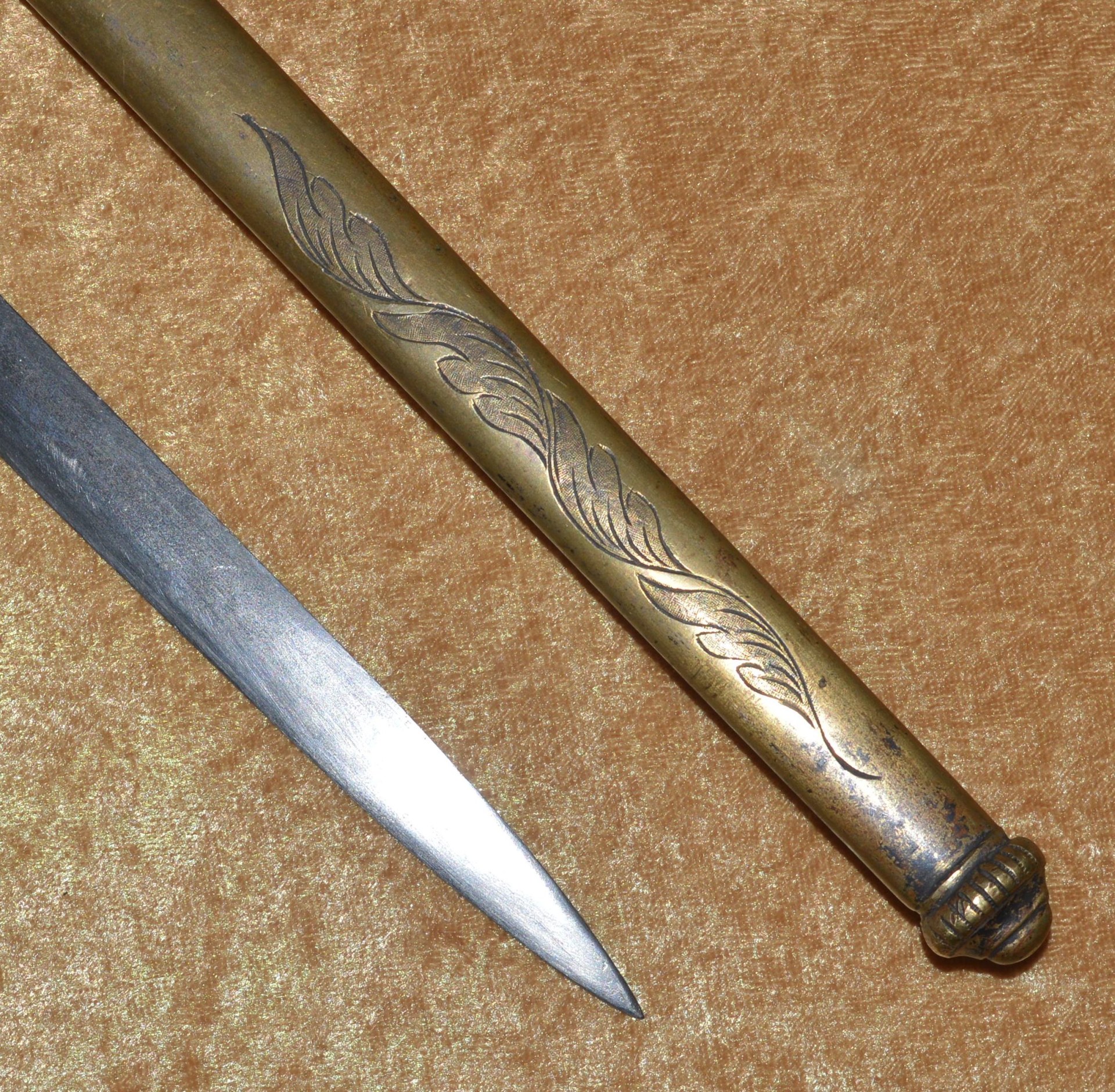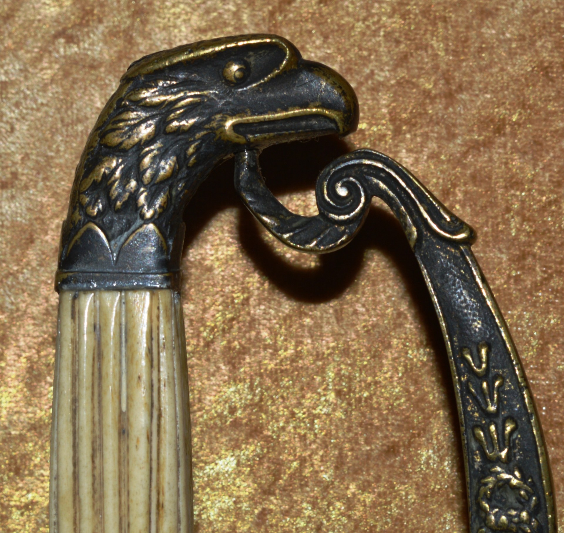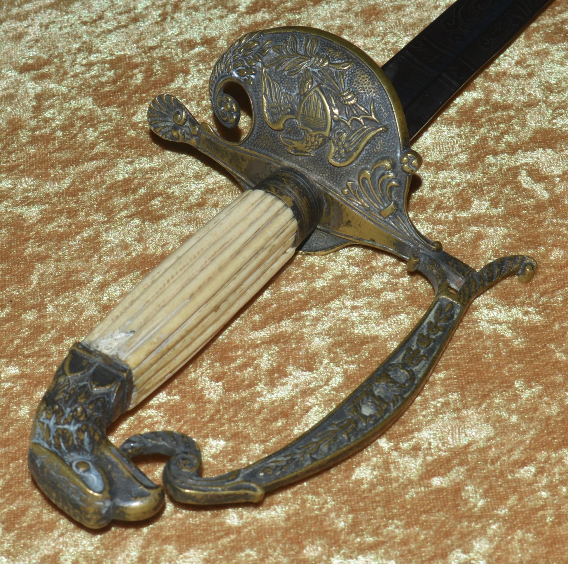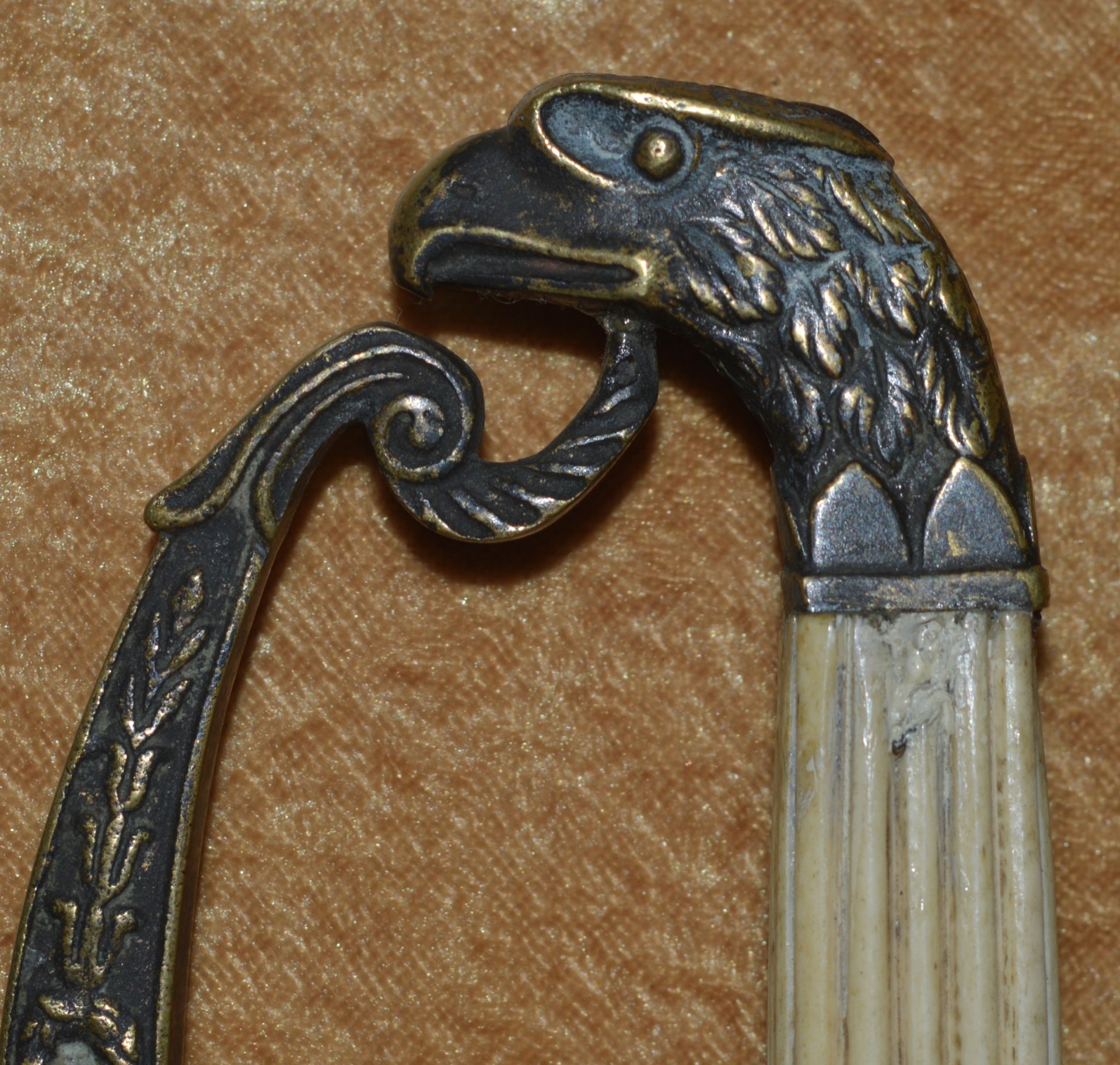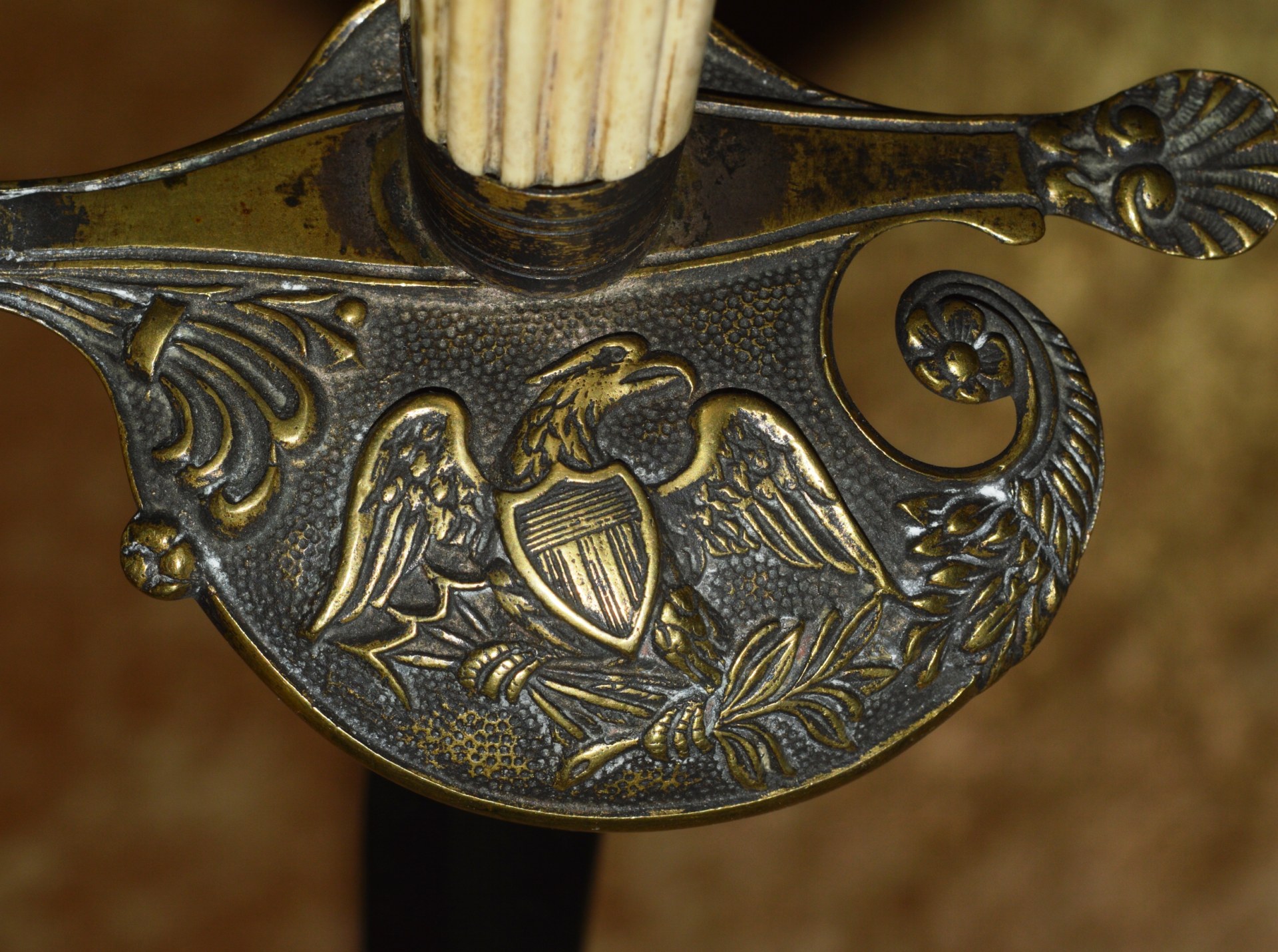 Featuring cast brass hilt with Widmann Type VI eagle head pommel, downcurved shell guard with spread-wing eagle in relief, rear quillon with flat shell terminal, and elaborate knuckle bow. Reeded bone grip (small defect on top obverse) with decorative brass base ferrule. Straight 27 3/4” (70.5 cm) single-edged blade, likely a German import, with broad 2/3 length fuller, etched with scrolling foliage and stands of arms (worn). Original brass scabbard with frog stud and two carry rings, beautifully decorated with classical design; elaborate brass chain hanger. Though unsigned, this is certainly the work of Frederick William Widmann (178?-1848), a German immigrant who came to Philadelphia in 1816. Already trained as a sword cutler, with connections to the Solingen blade market, he set up shop in Philadelphia, where he worked until his death in 1848. Very good condition, the brass with pleasing patina. Overall length 32 5/8”, not including scabbard. Similar examples illustrated and described in E. Andrew Mowbray=s AThe American Eagle-Pommel Sword, the Early Years- 1794-1830″, pages 190-191.