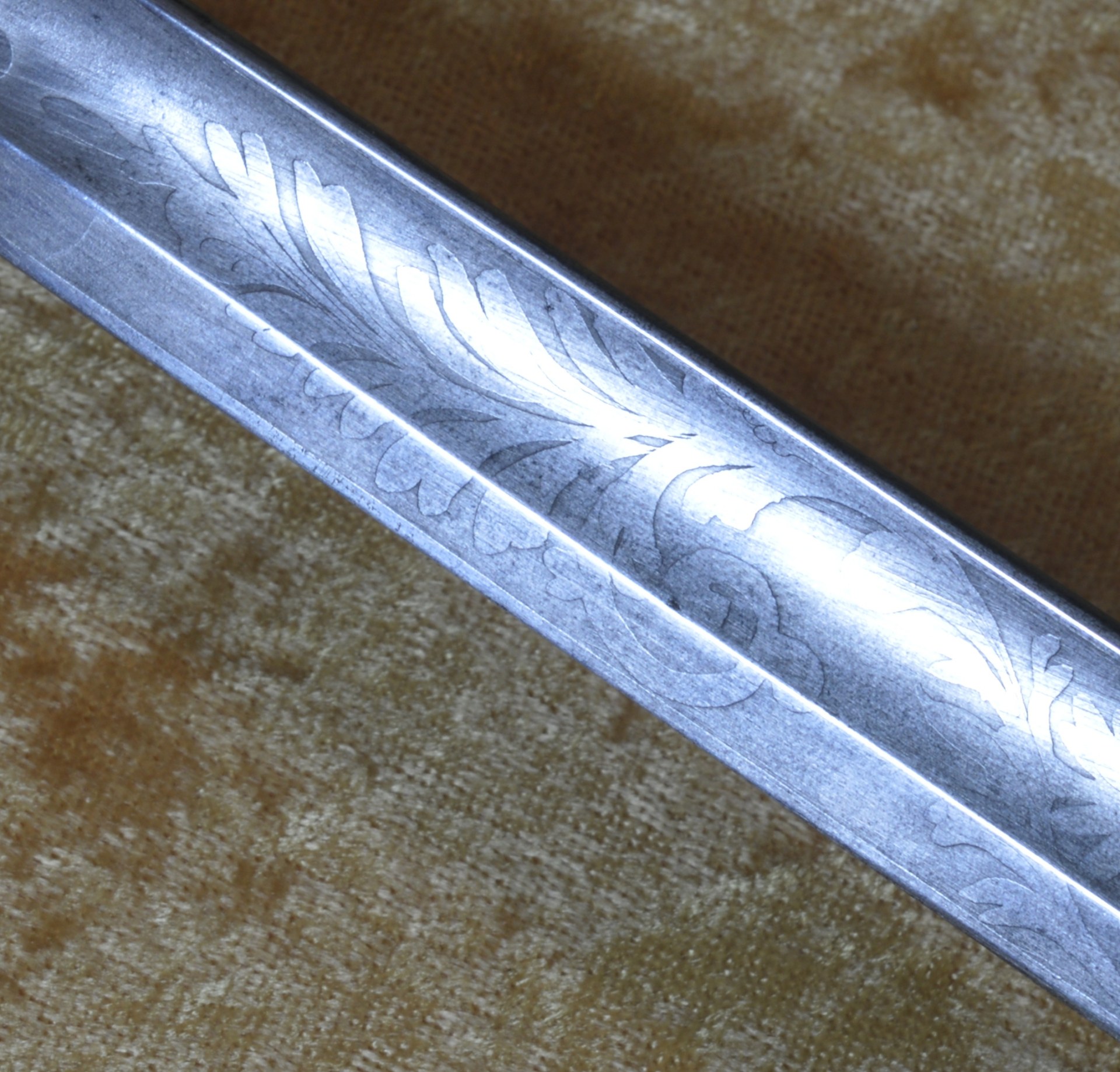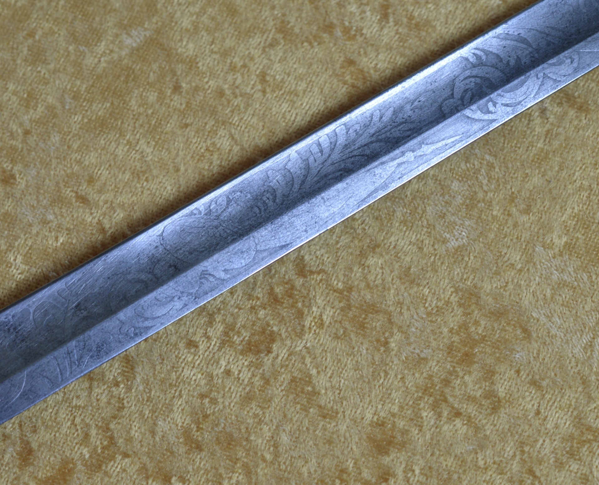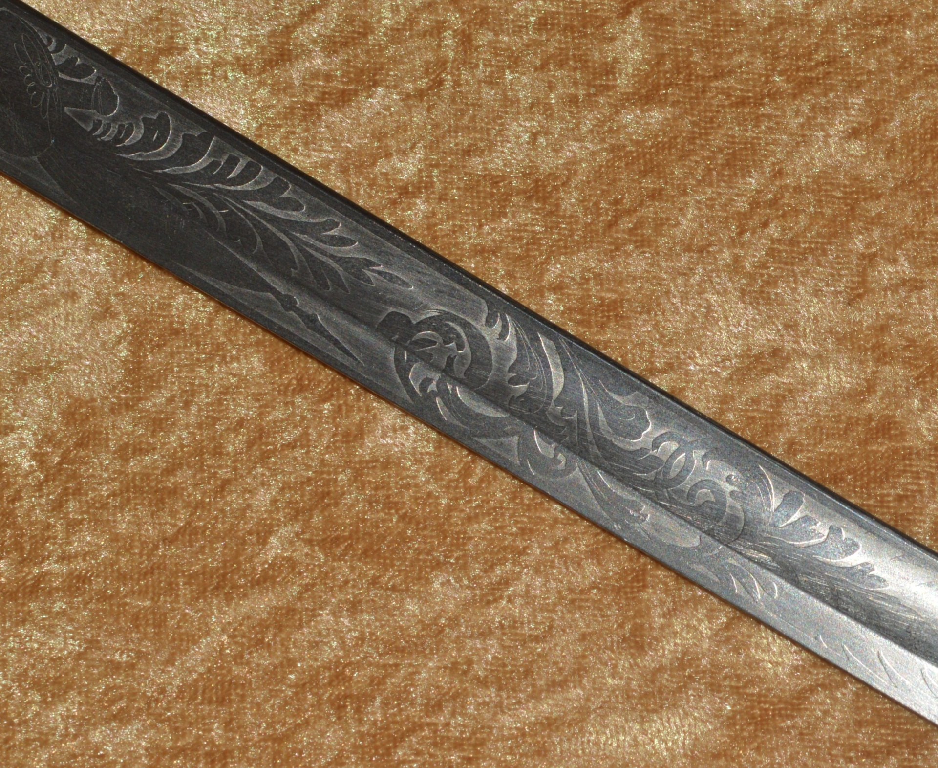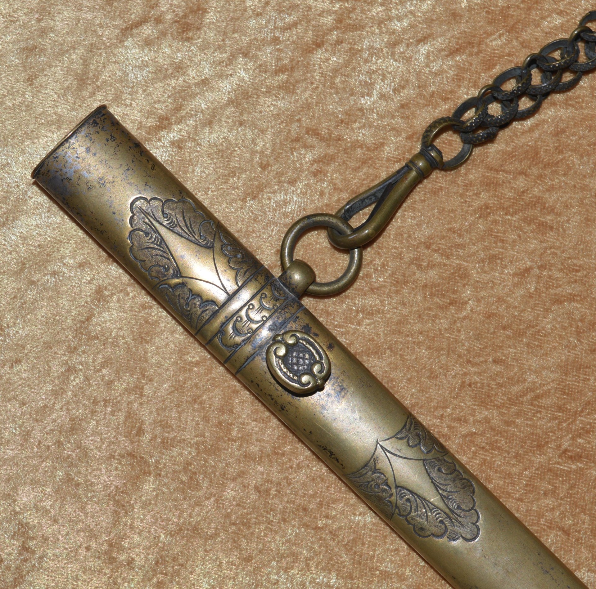 Featuring cast brass hilt with Widmann Type VI eagle head pommel, downcurved shell guard with spread-wing eagle in relief, rear quillon with flat shell terminal, and elaborate knuckle bow. Reeded bone grip (small defect on top obverse) with decorative brass base ferrule. Straight 27 3/4” (70.5 cm) single-edged blade, likely a German import, with broad 2/3 length fuller, etched with scrolling foliage and stands of arms (worn). Original brass scabbard with frog stud and two carry rings, beautifully decorated with classical design; elaborate brass chain hanger. Though unsigned, this is certainly the work of Frederick William Widmann (178?-1848), a German immigrant who came to Philadelphia in 1816. Already trained as a sword cutler, with connections to the Solingen blade market, he set up shop in Philadelphia, where he worked until his death in 1848. Very good condition, the brass with pleasing patina. Overall length 32 5/8”, not including scabbard. Similar examples illustrated and described in E. Andrew Mowbray=s AThe American Eagle-Pommel Sword, the Early Years- 1794-1830″, pages 190-191.