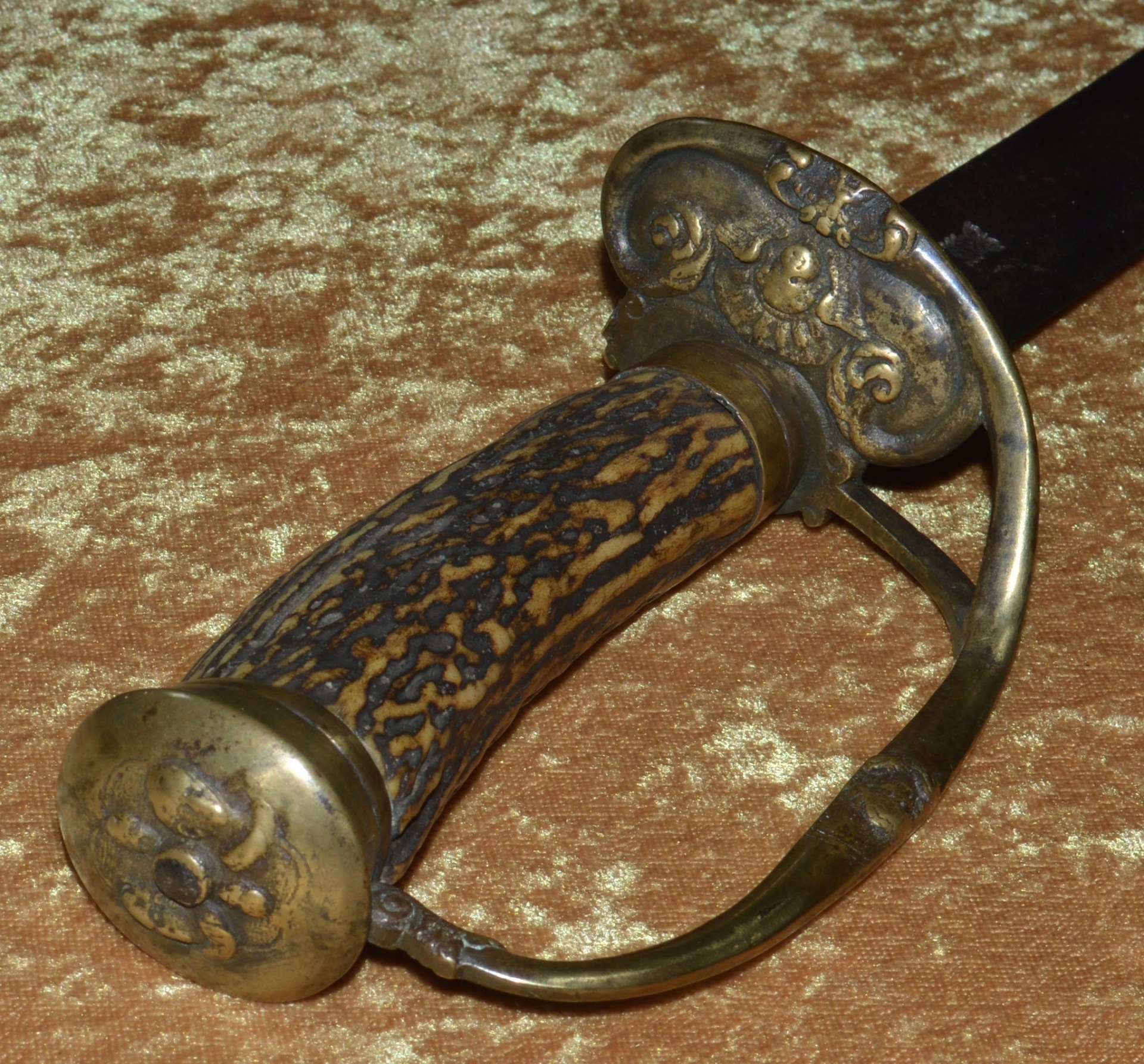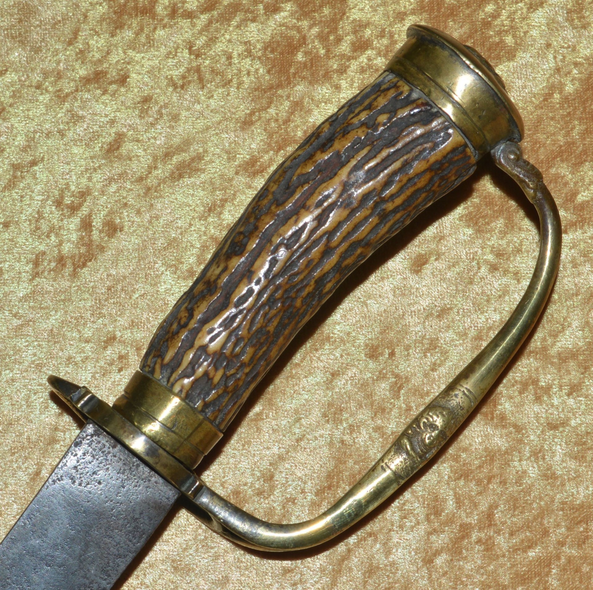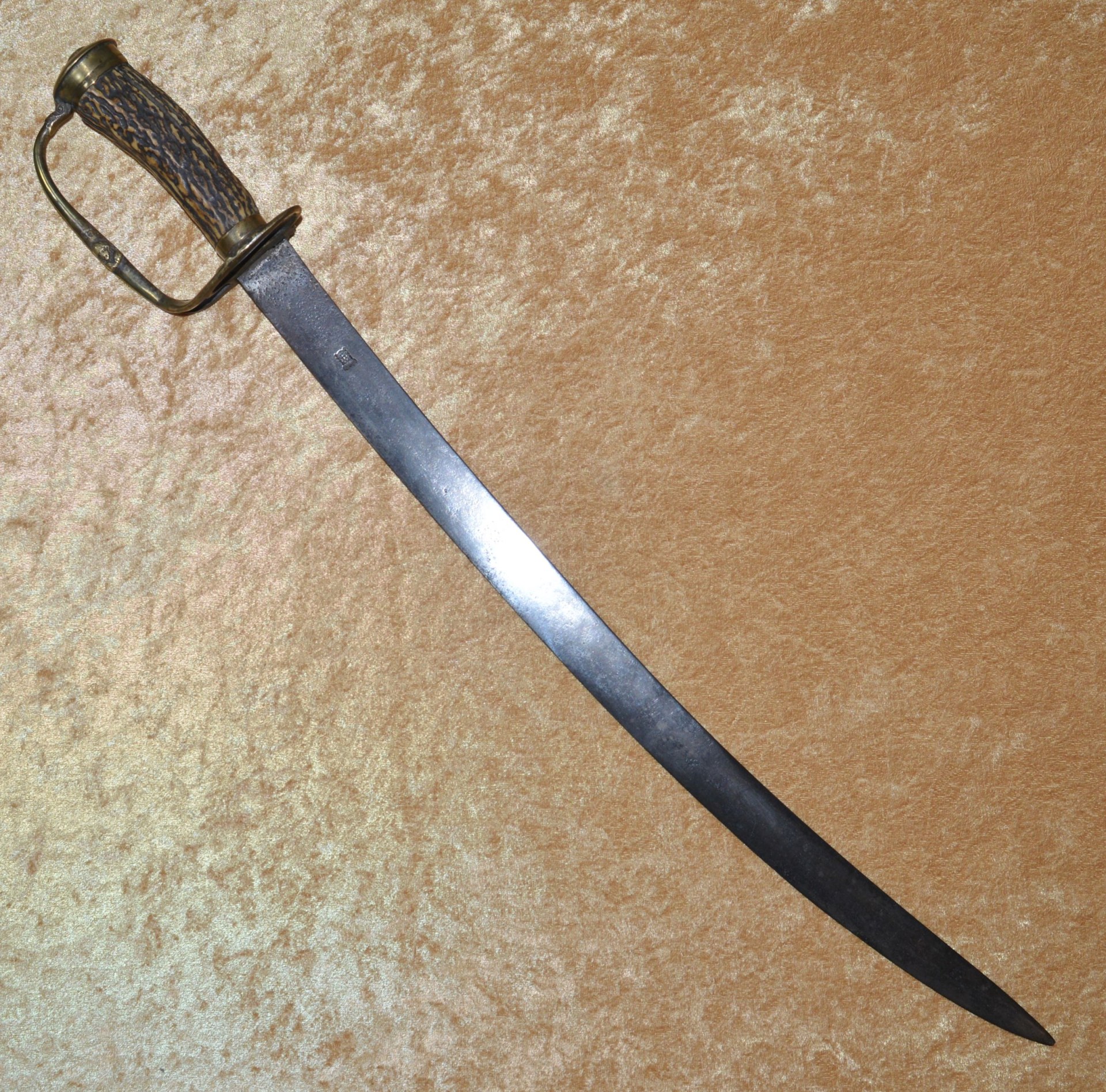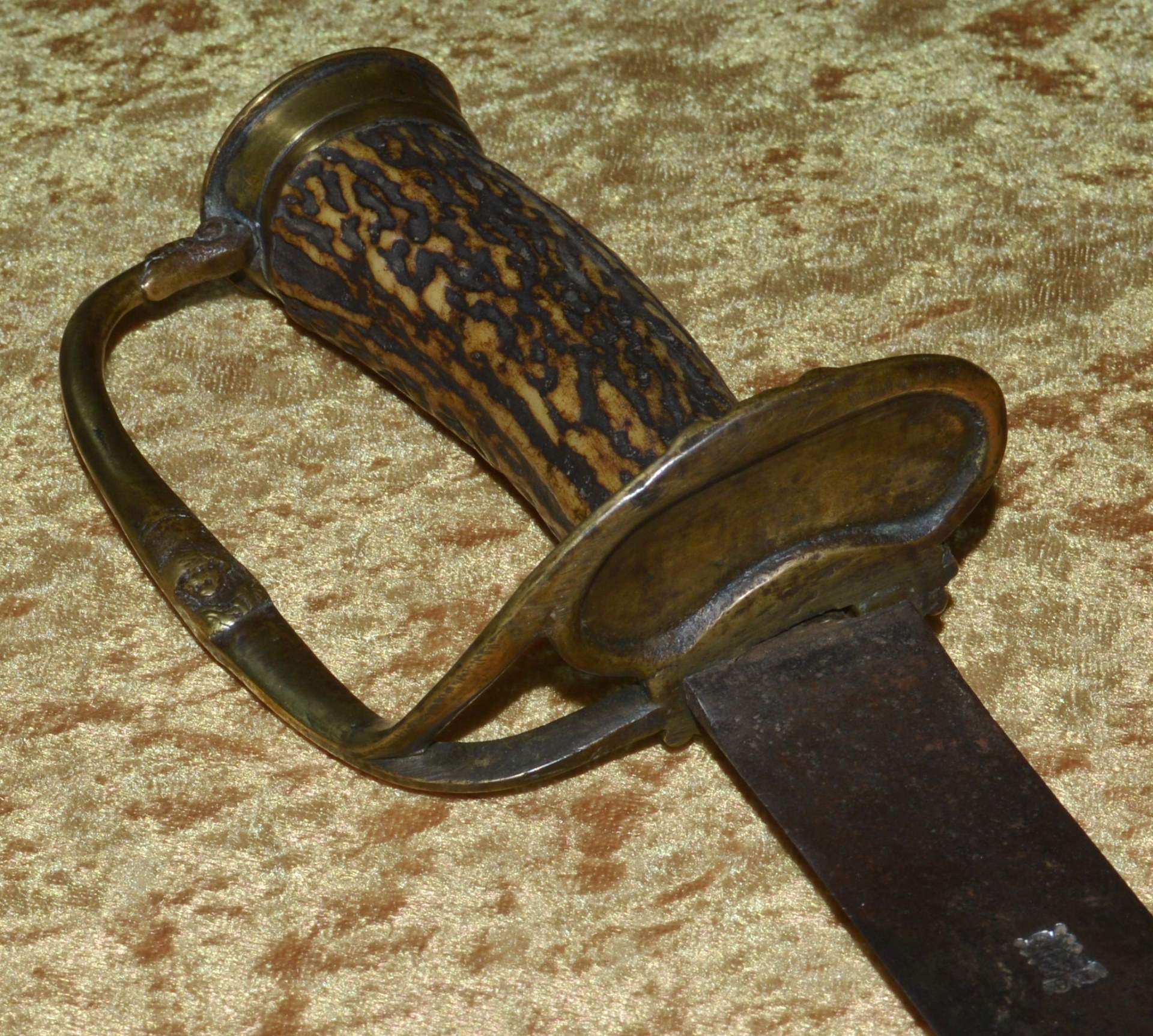 figures; rear quillon removed, as often found. One-piece stag horn grip. Curved 20 1/4″
