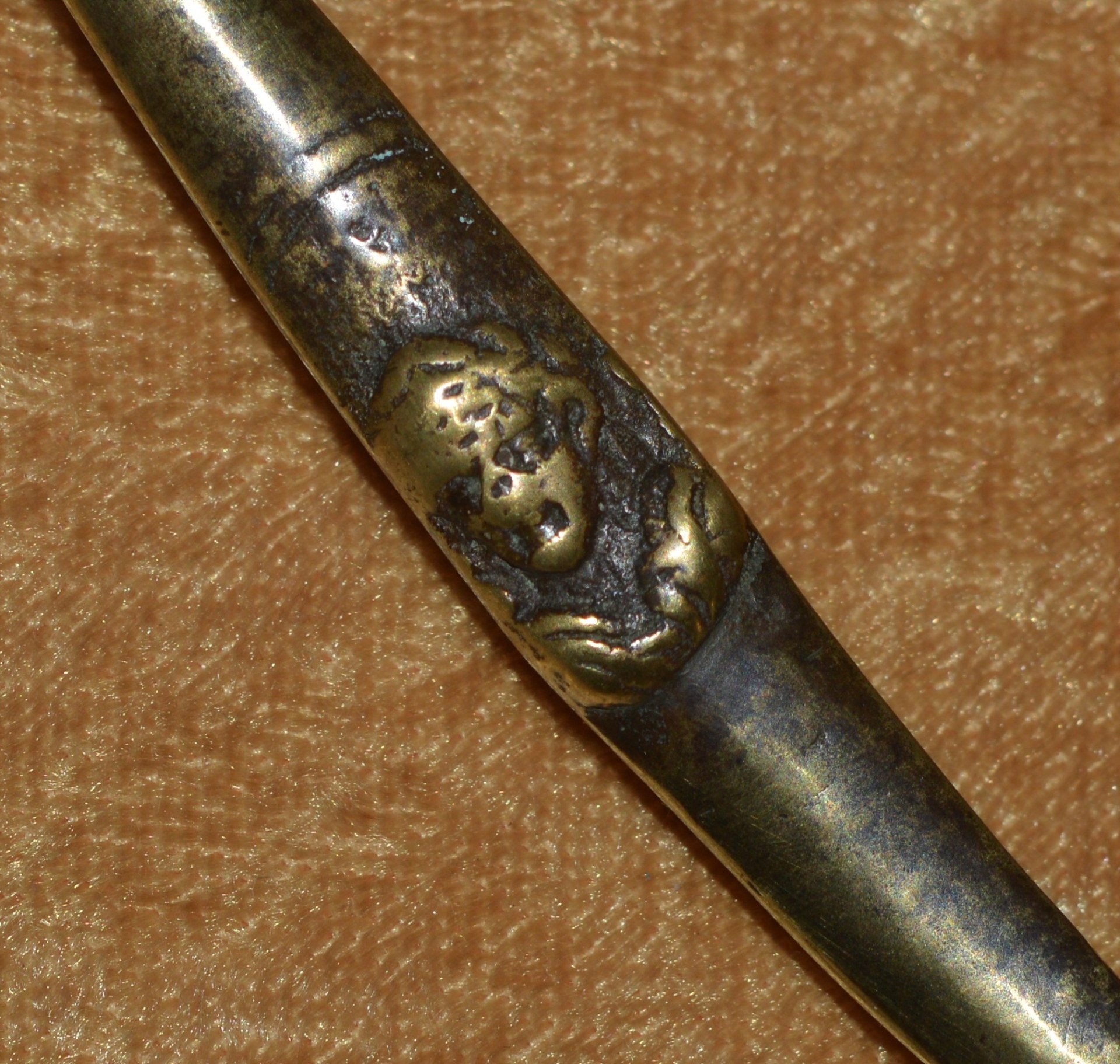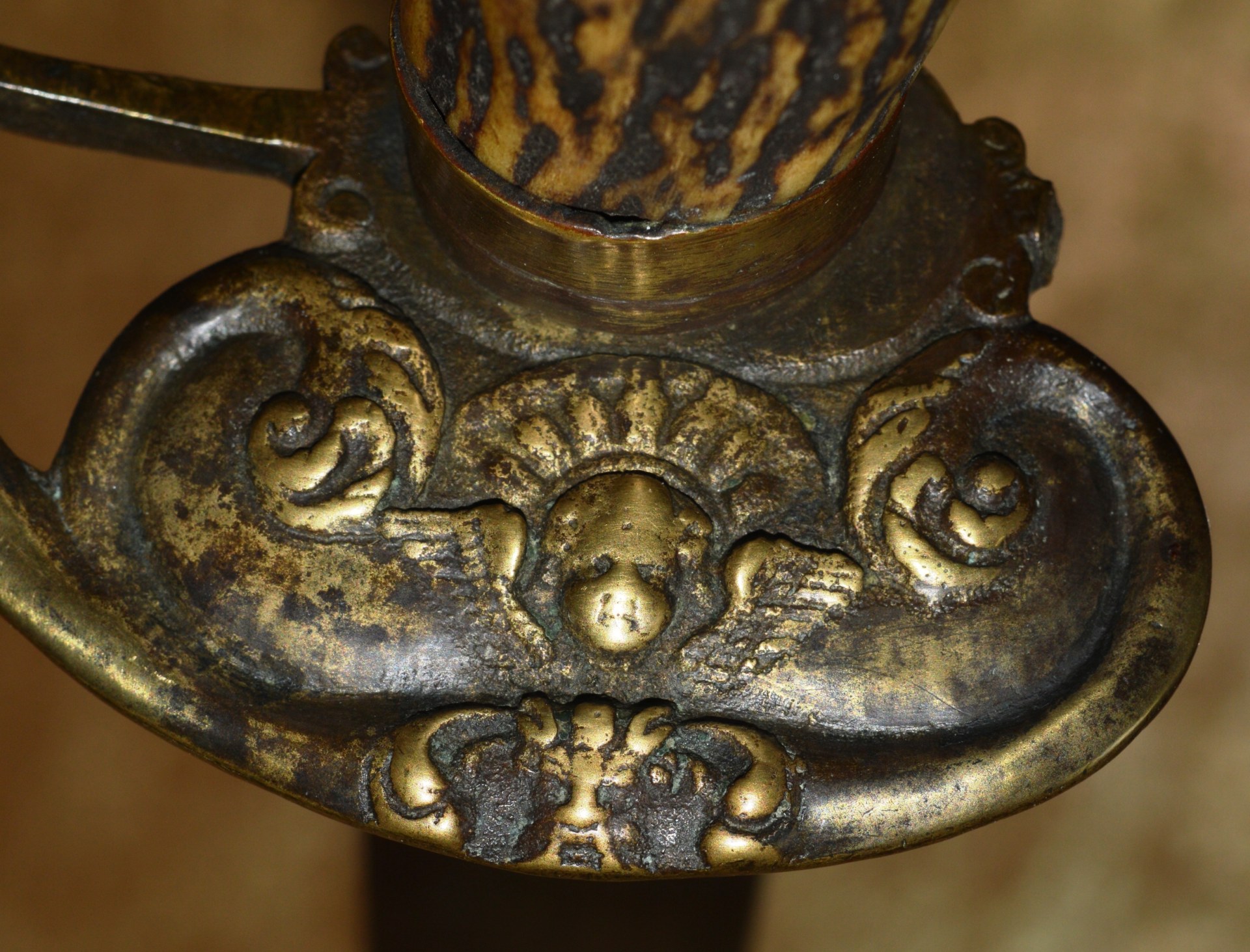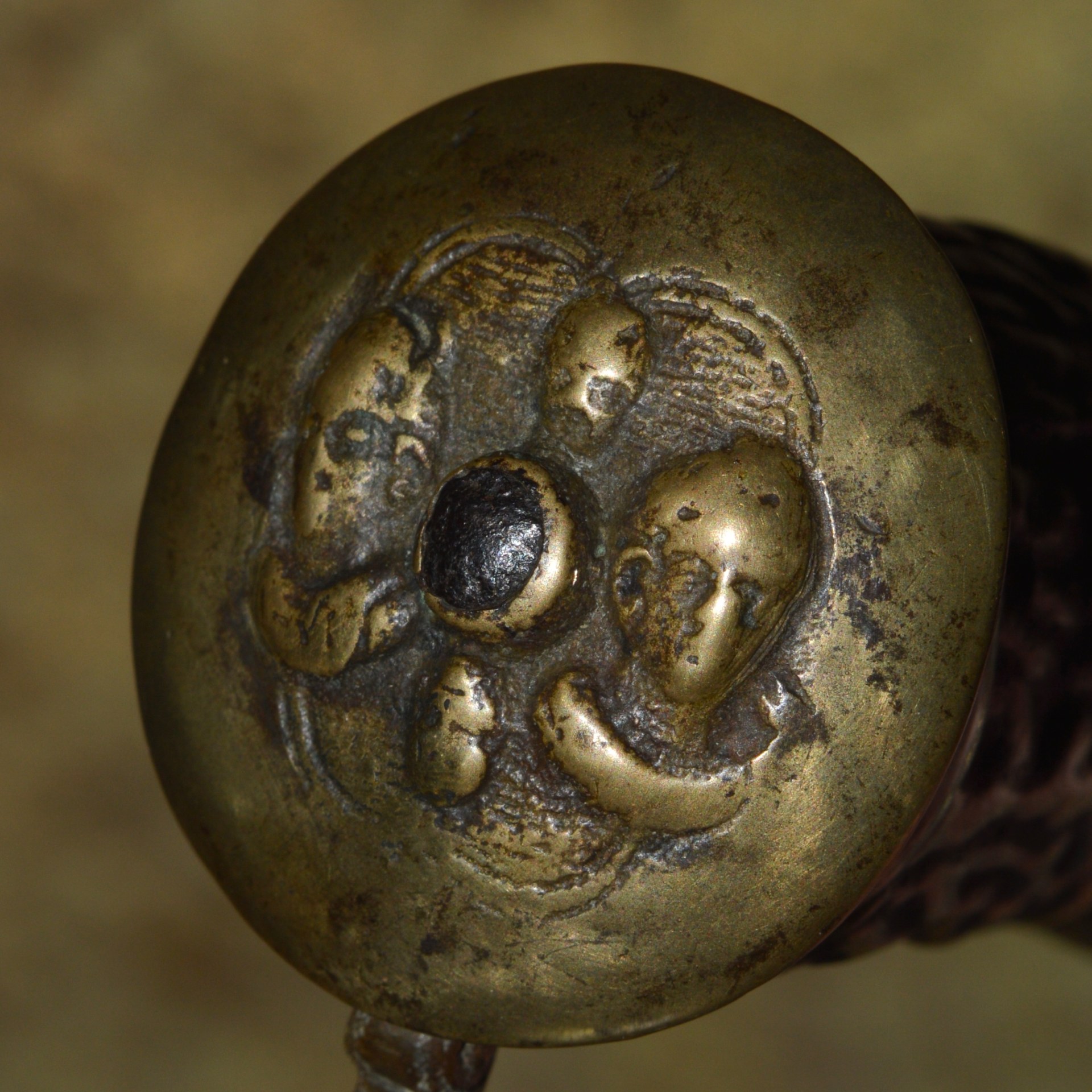 Featuring cast brass hilt comprising single shell guard depicting a cherub in low relief