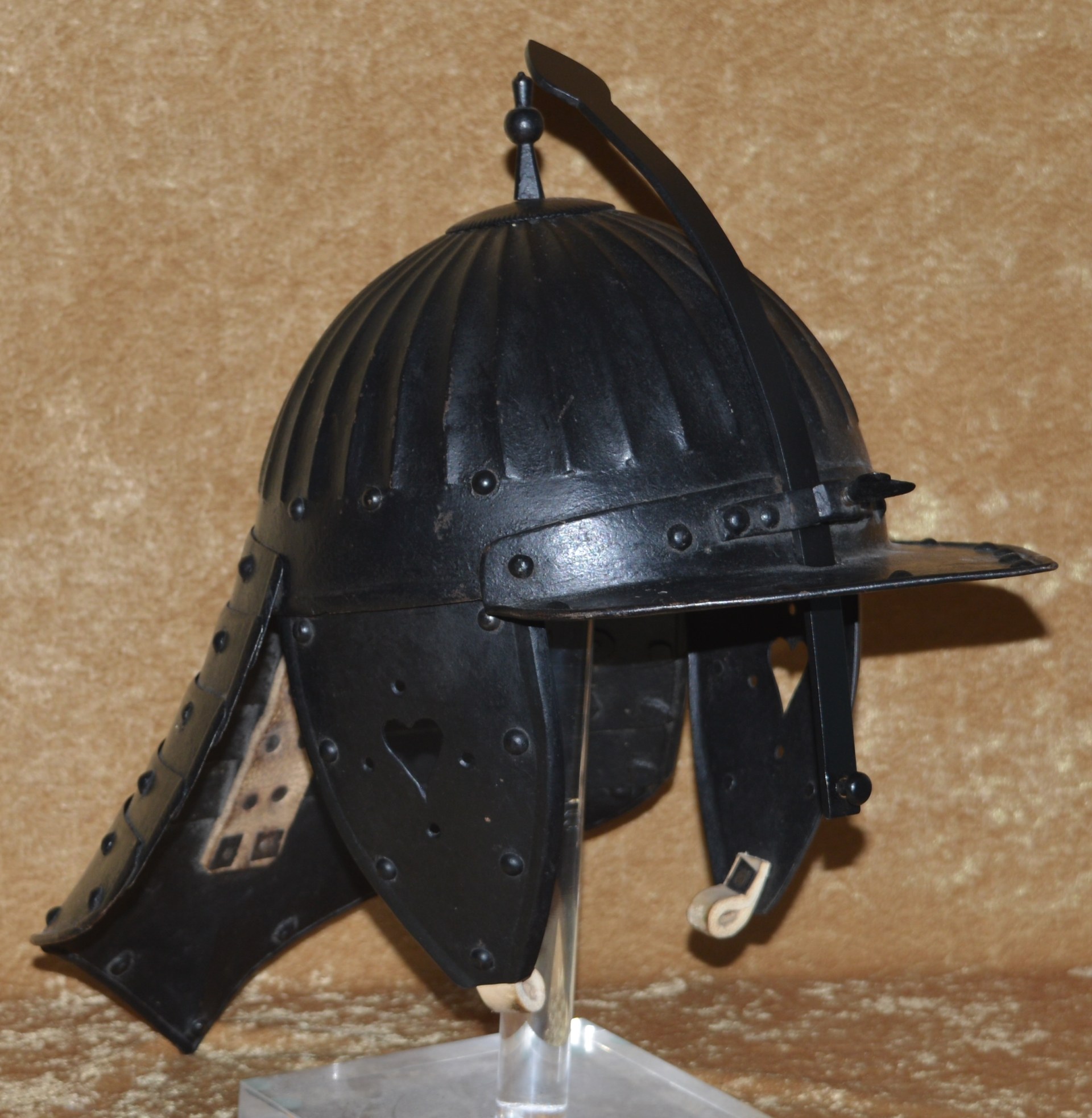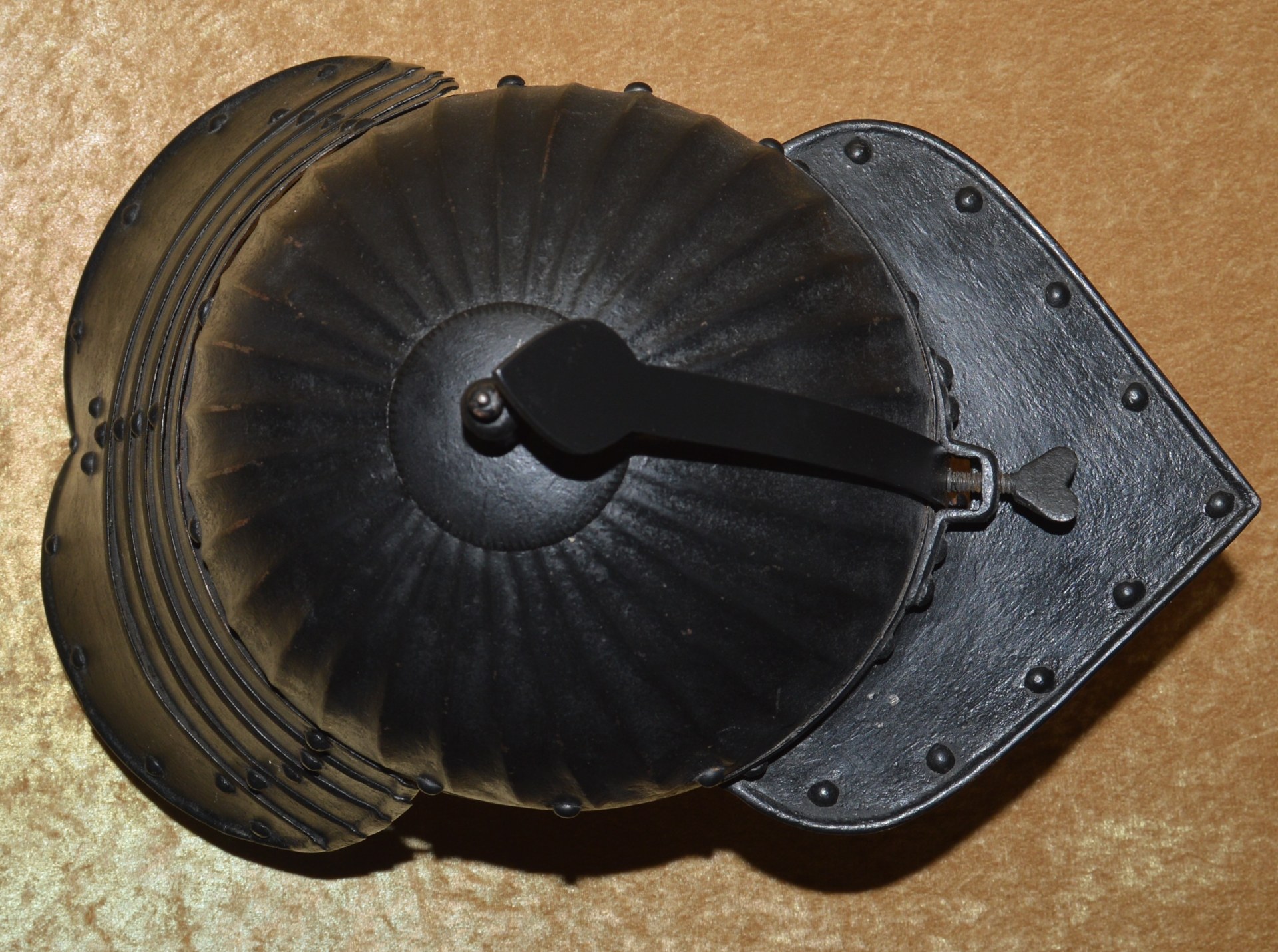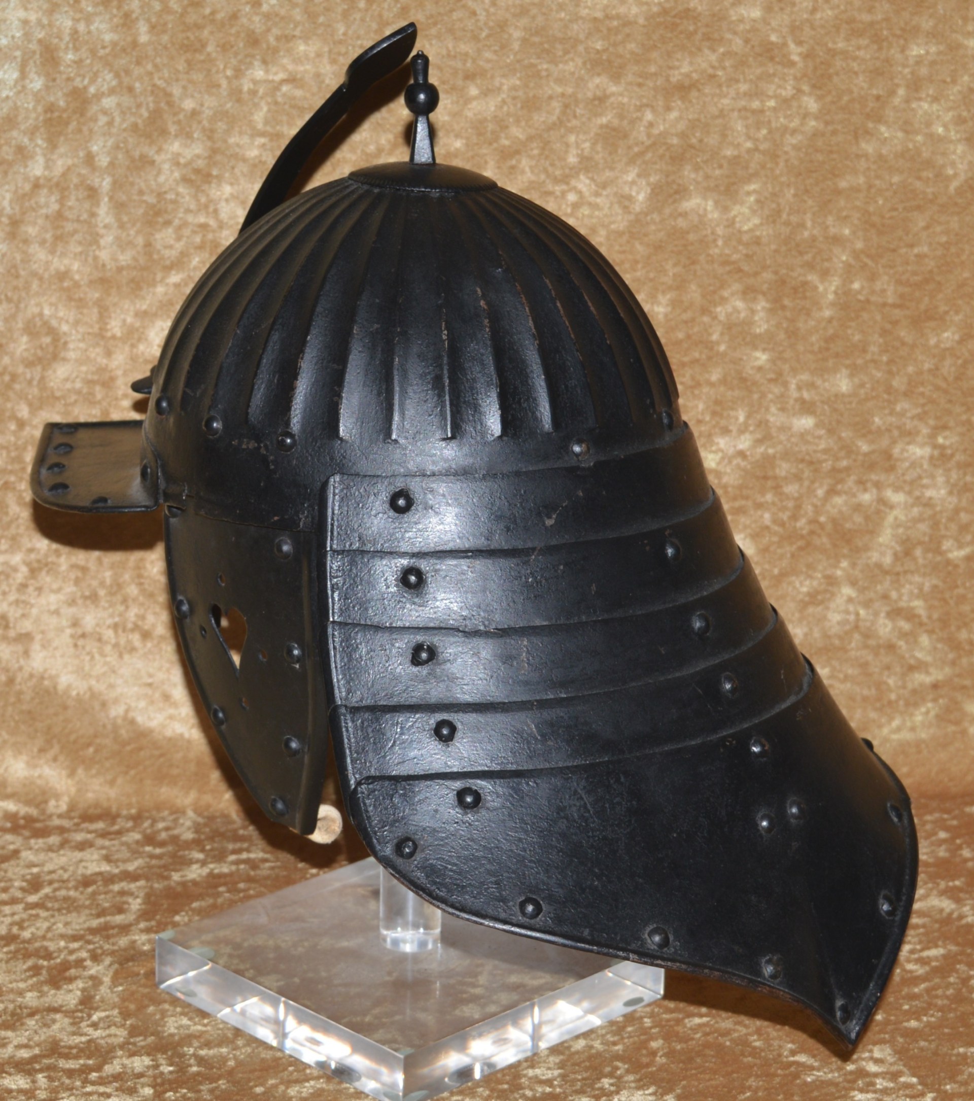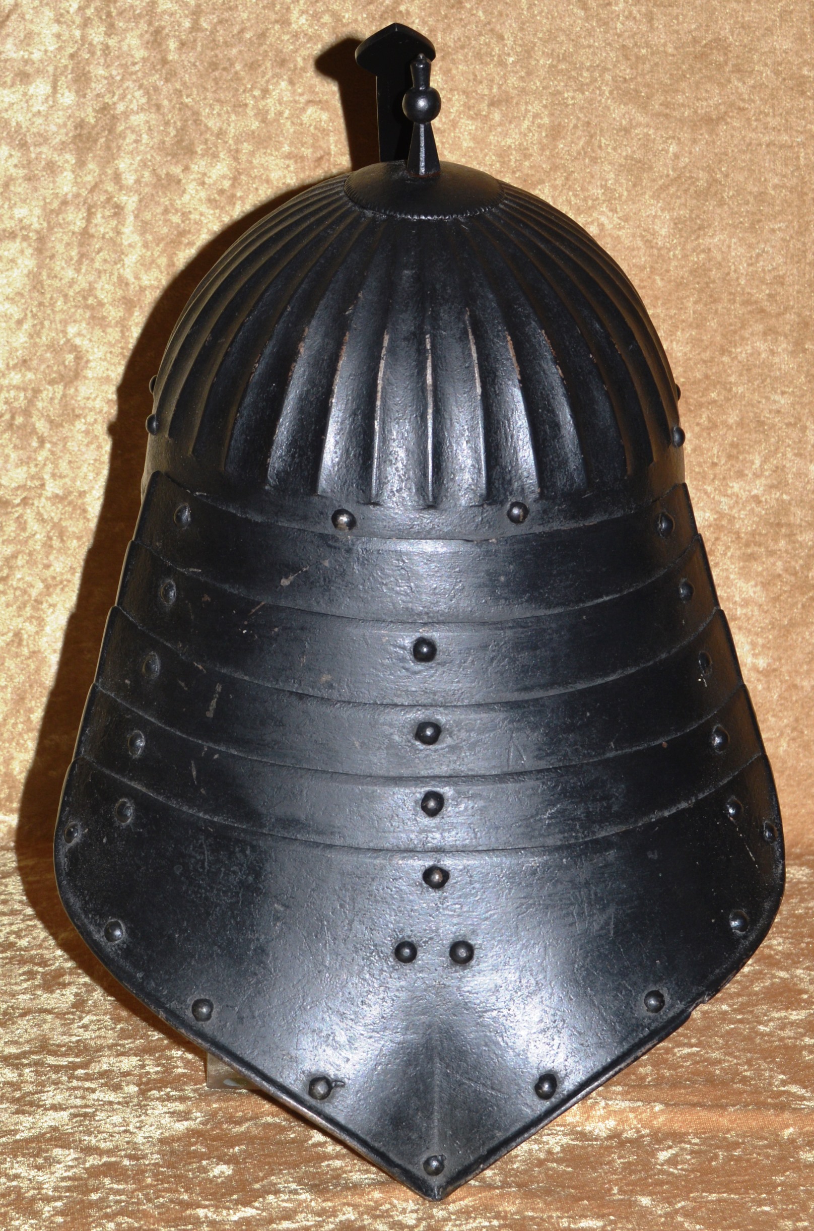 Of iron construction, with one-piece hemspherical skull formed with 32 flutes. Long tail