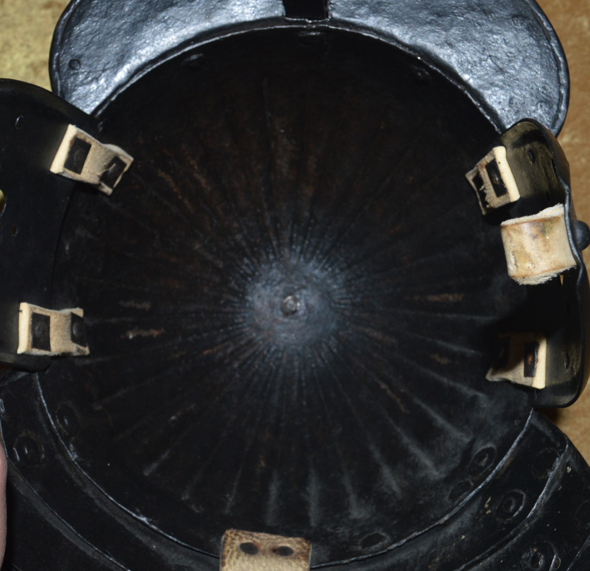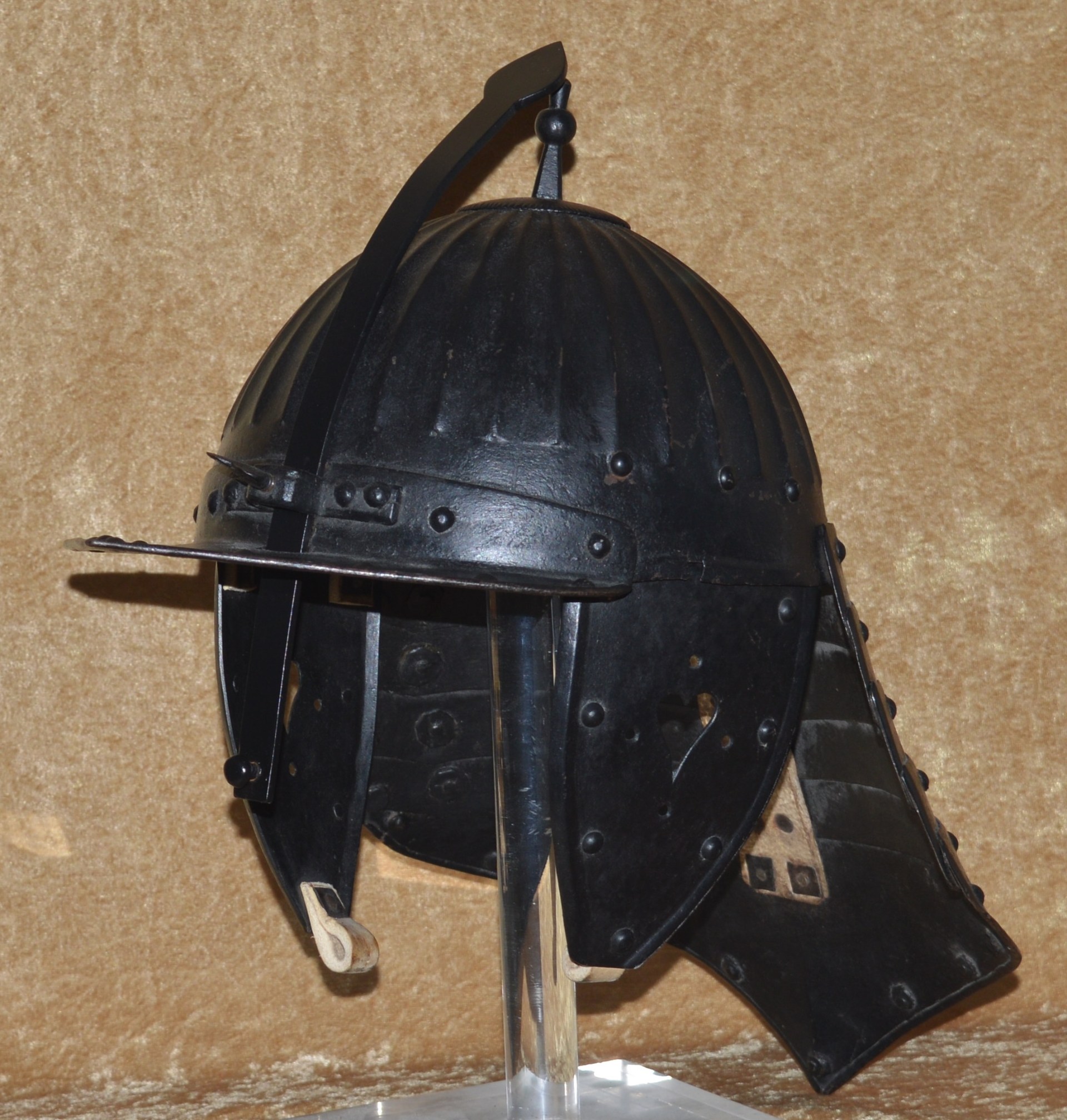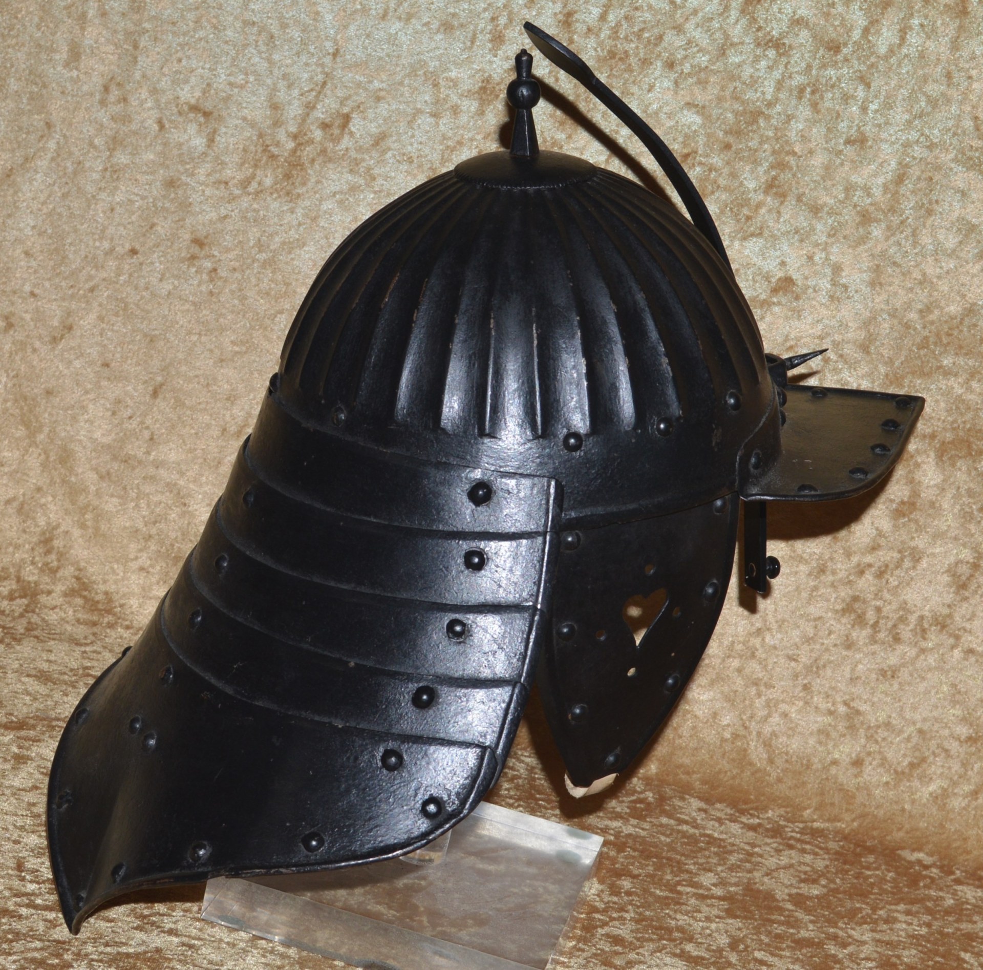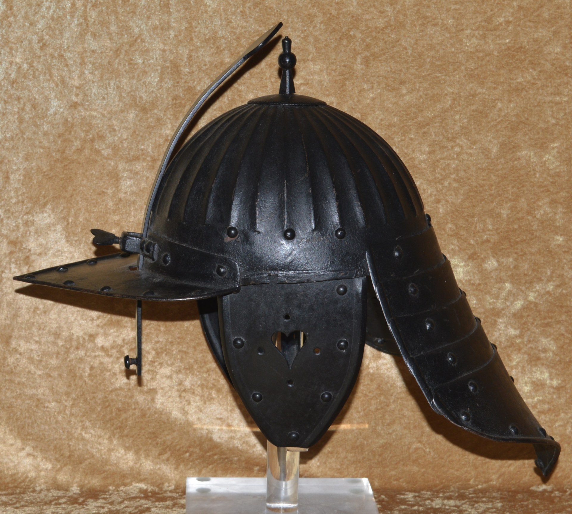 Of iron construction, with one-piece hemspherical skull formed with 32 flutes. Long tail