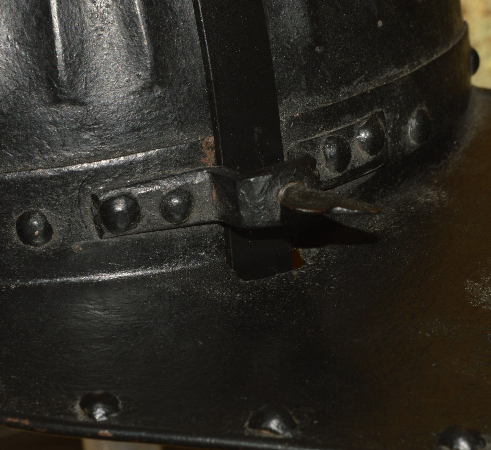 metal re-blackened, with minor finish loss, later nasal bar, and replaced leather (as typically