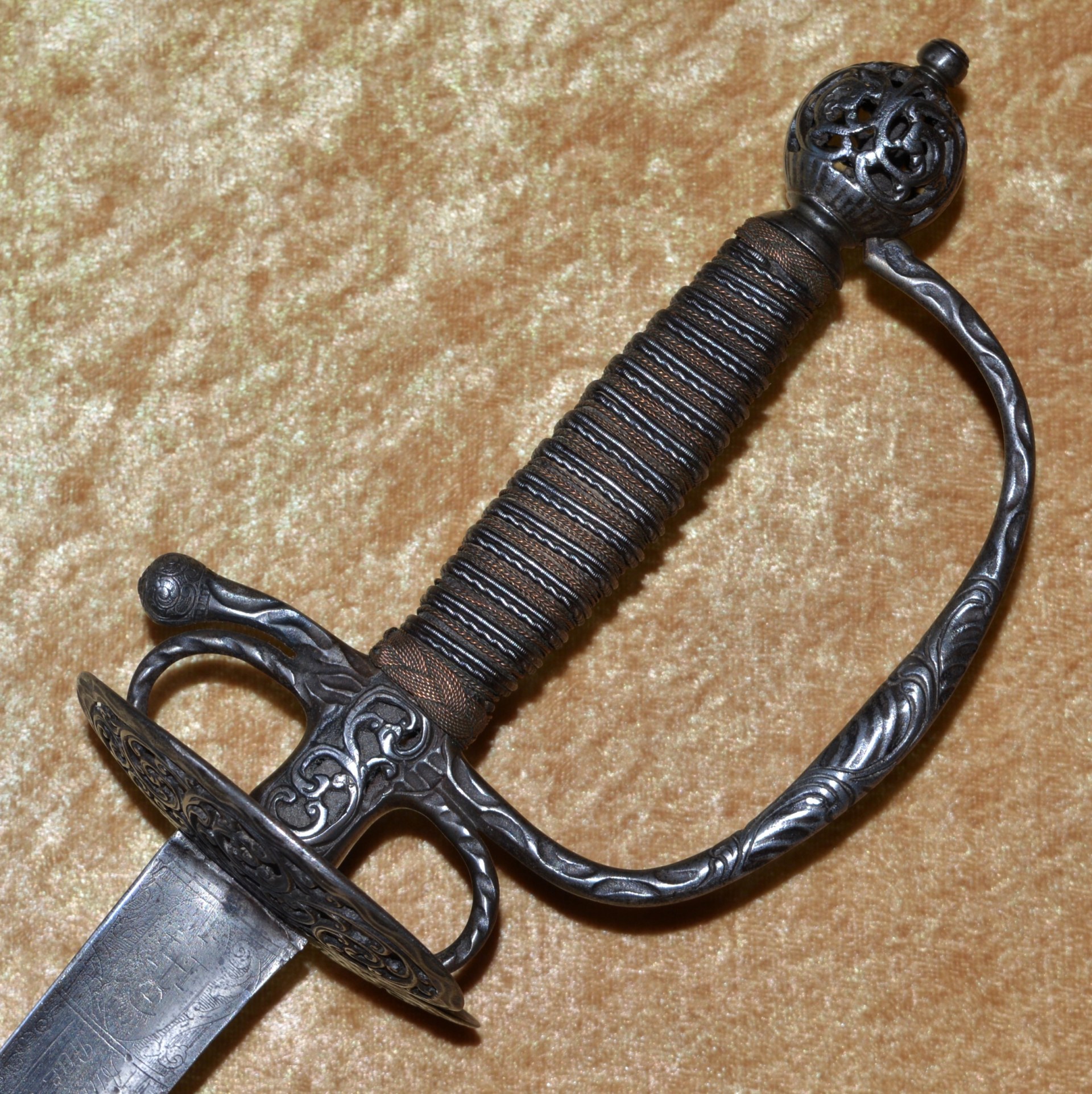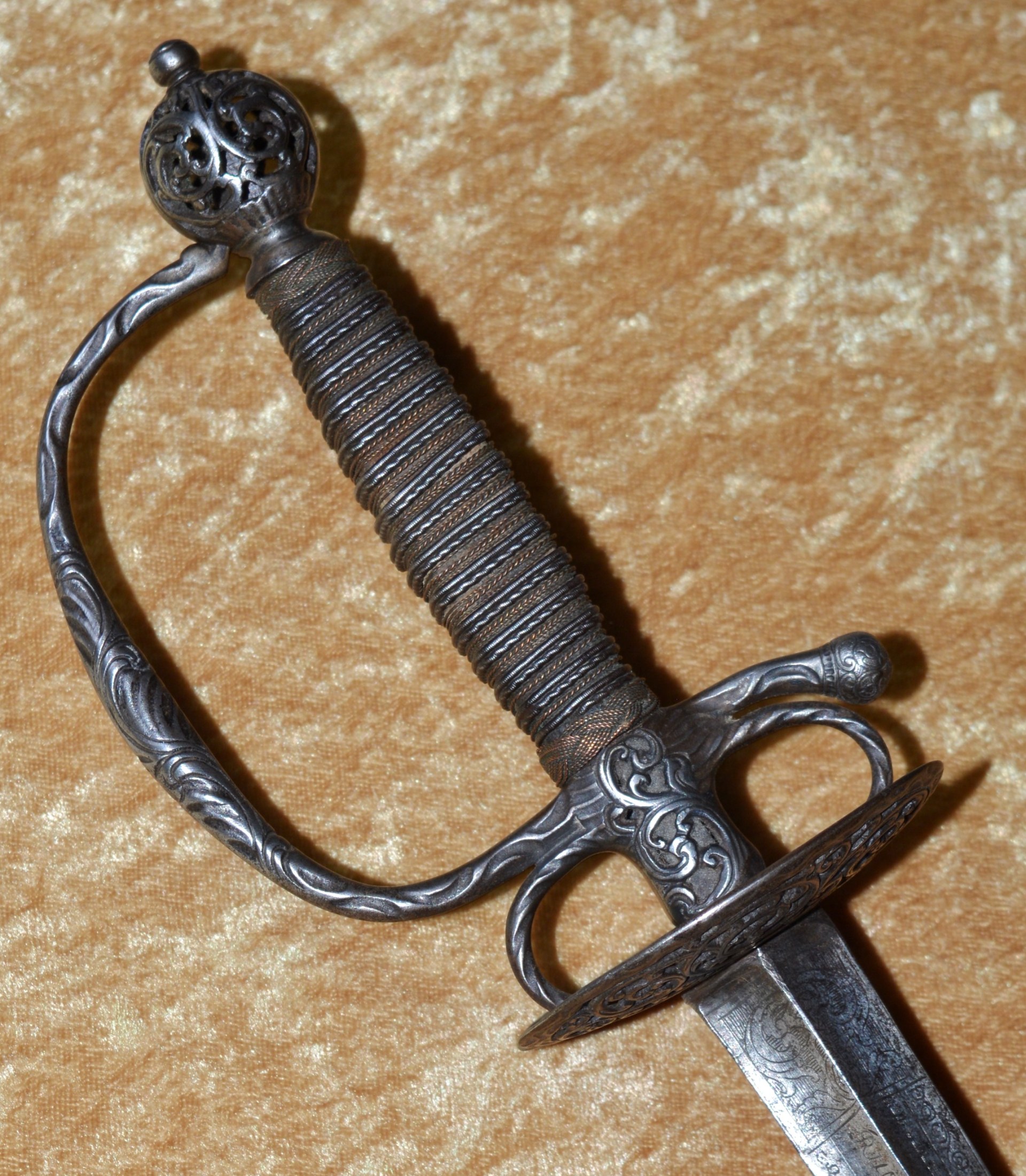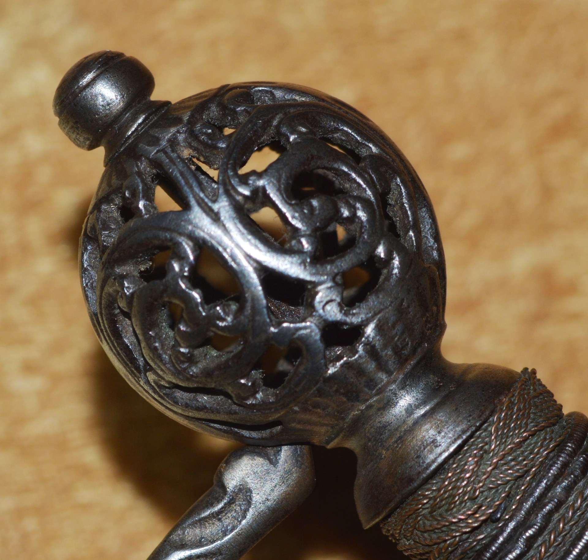 joining the spherical pommel; all finely pierced and chiseled with scrolling foliage. Grip