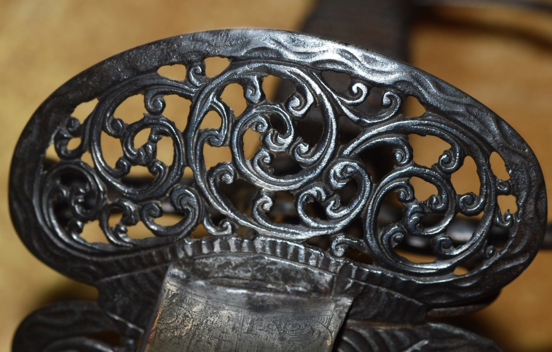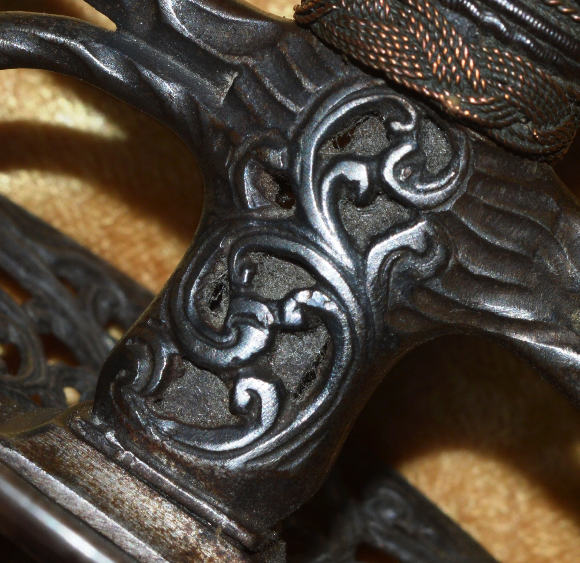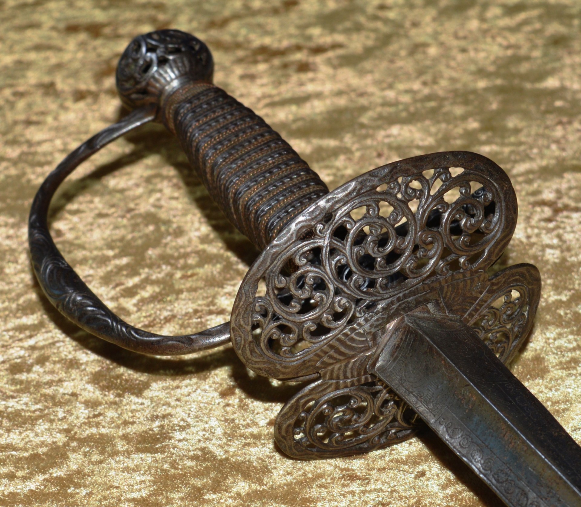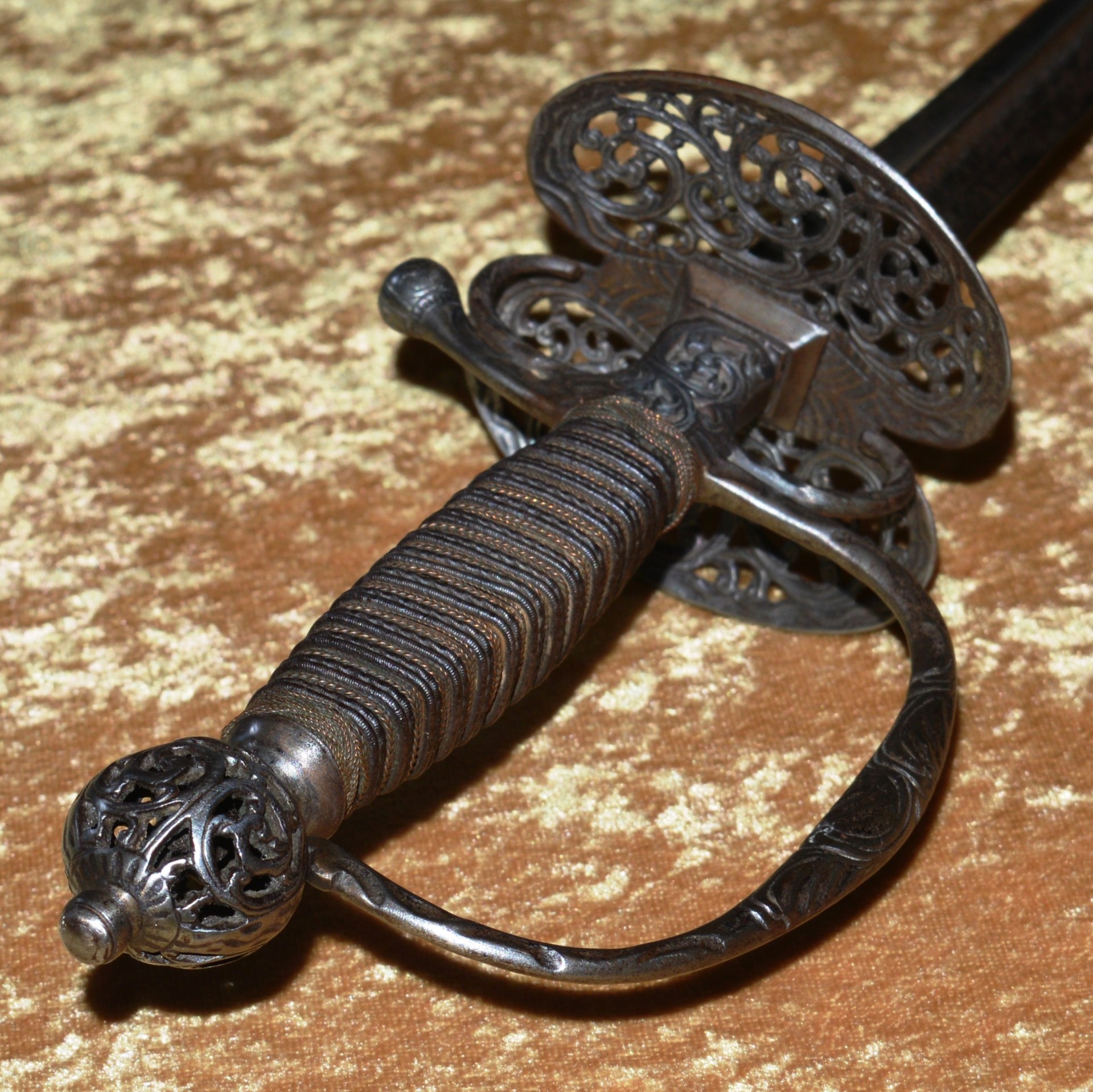 joining the spherical pommel; all finely pierced and chiseled with scrolling foliage. Grip