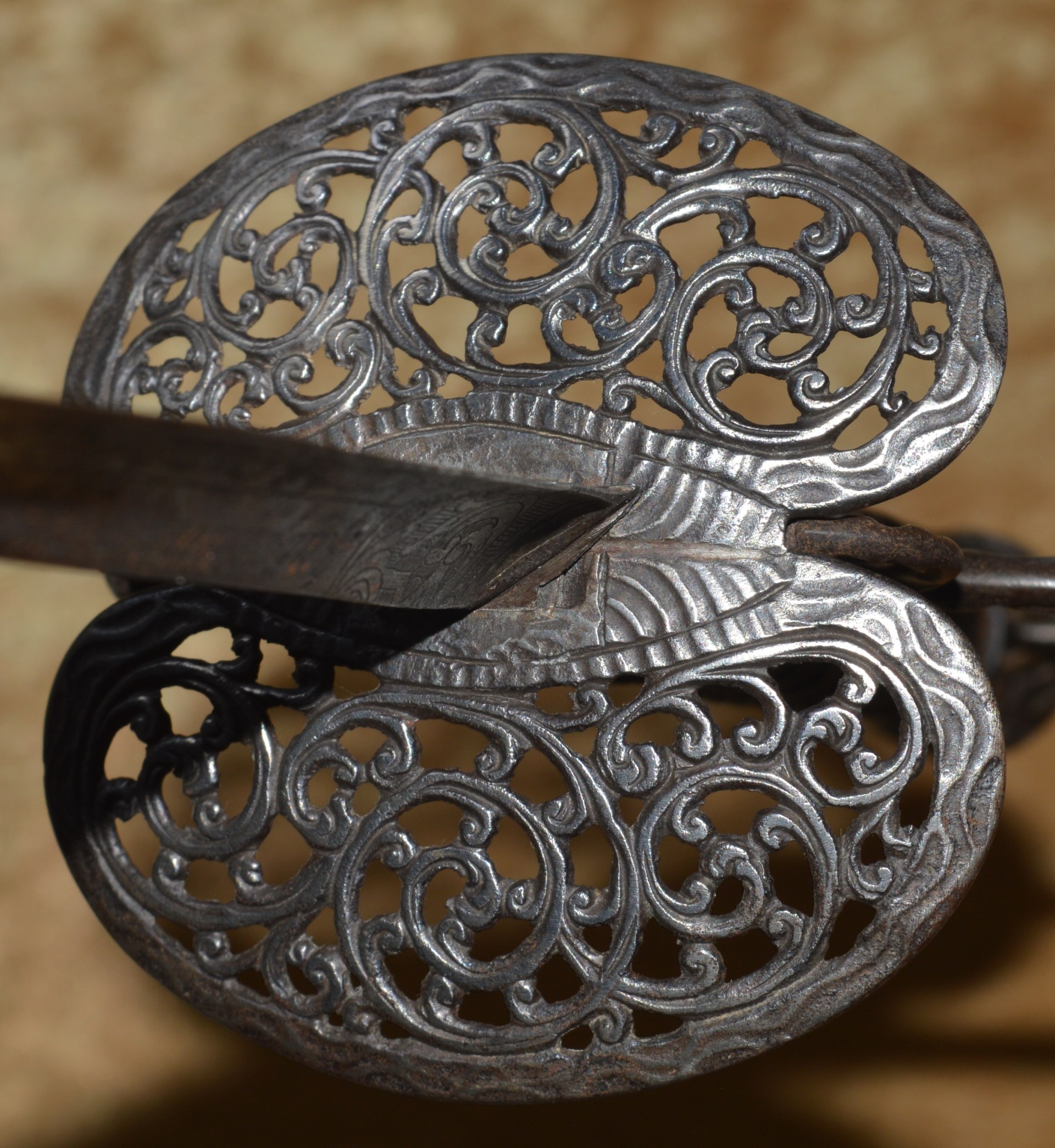 Steel hilt, featuring pas d’ ane reverse quillon, assymetrical shell guard, and knuckle bow