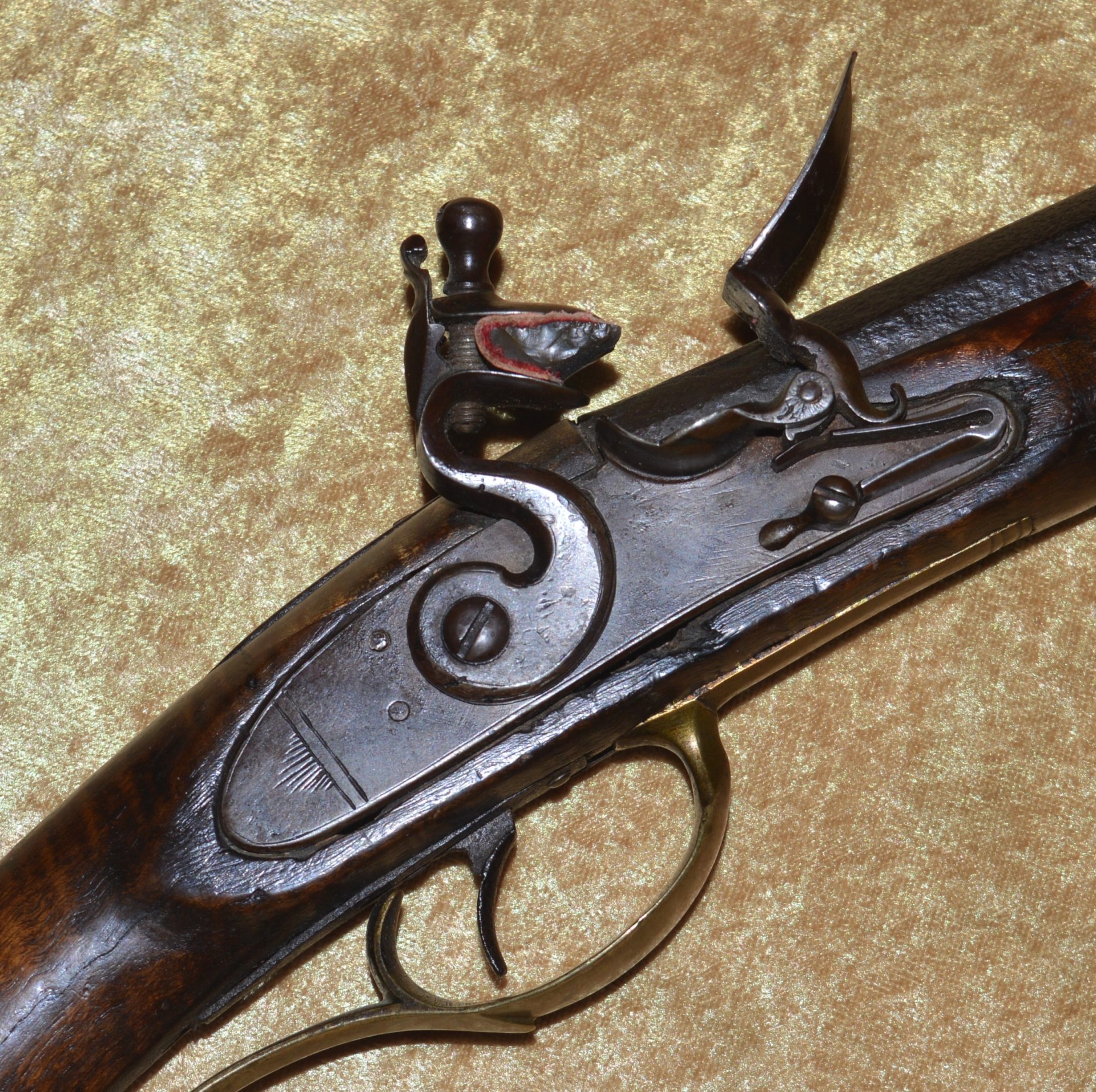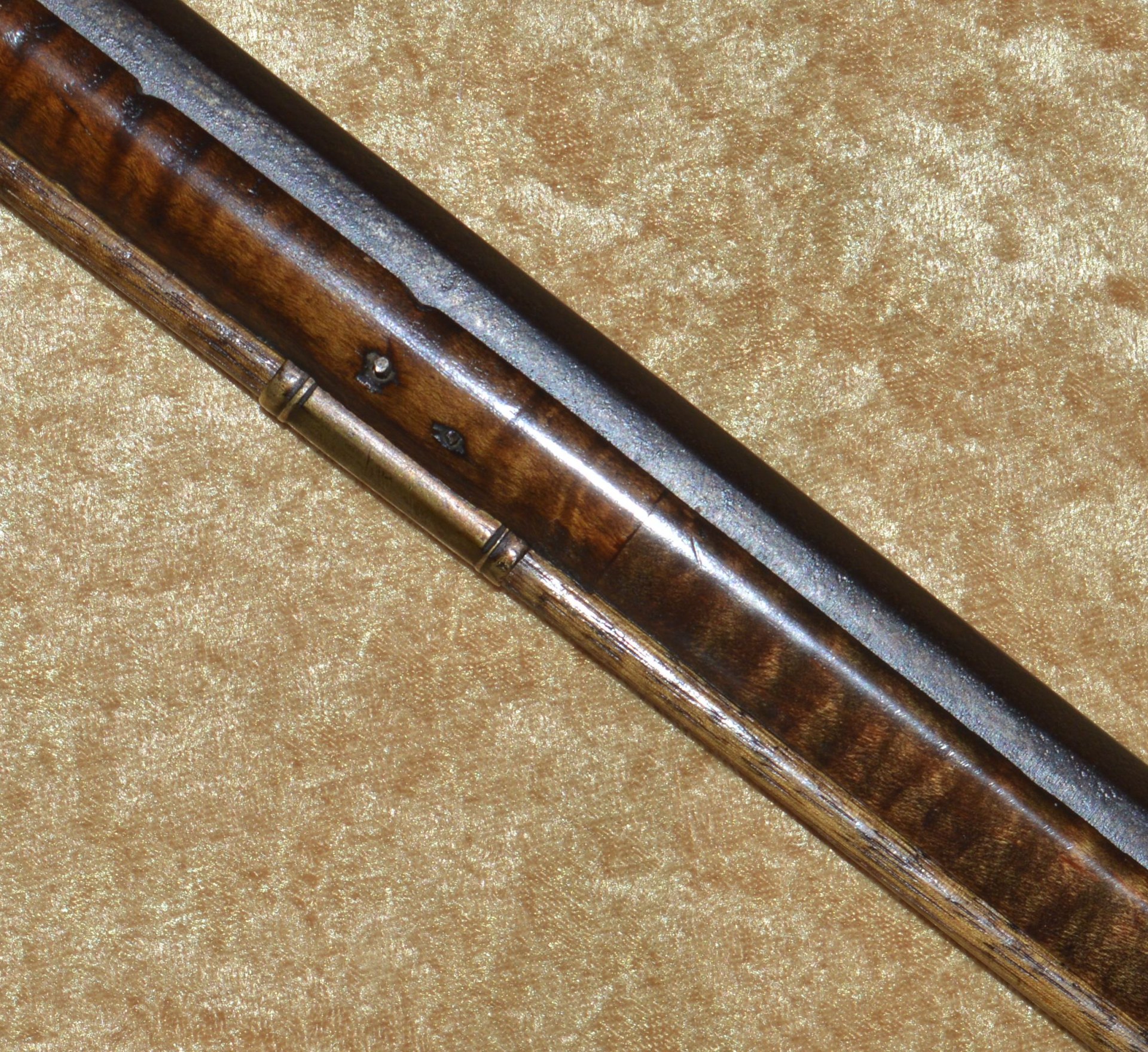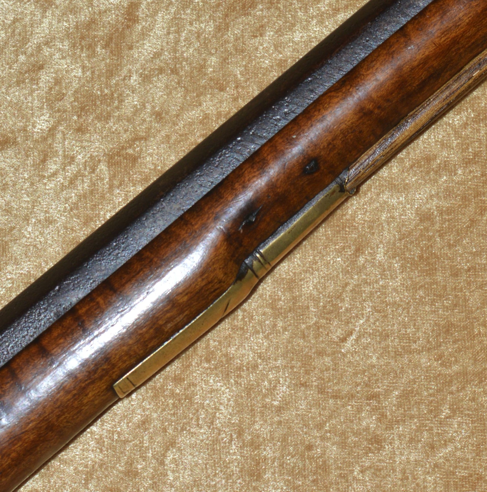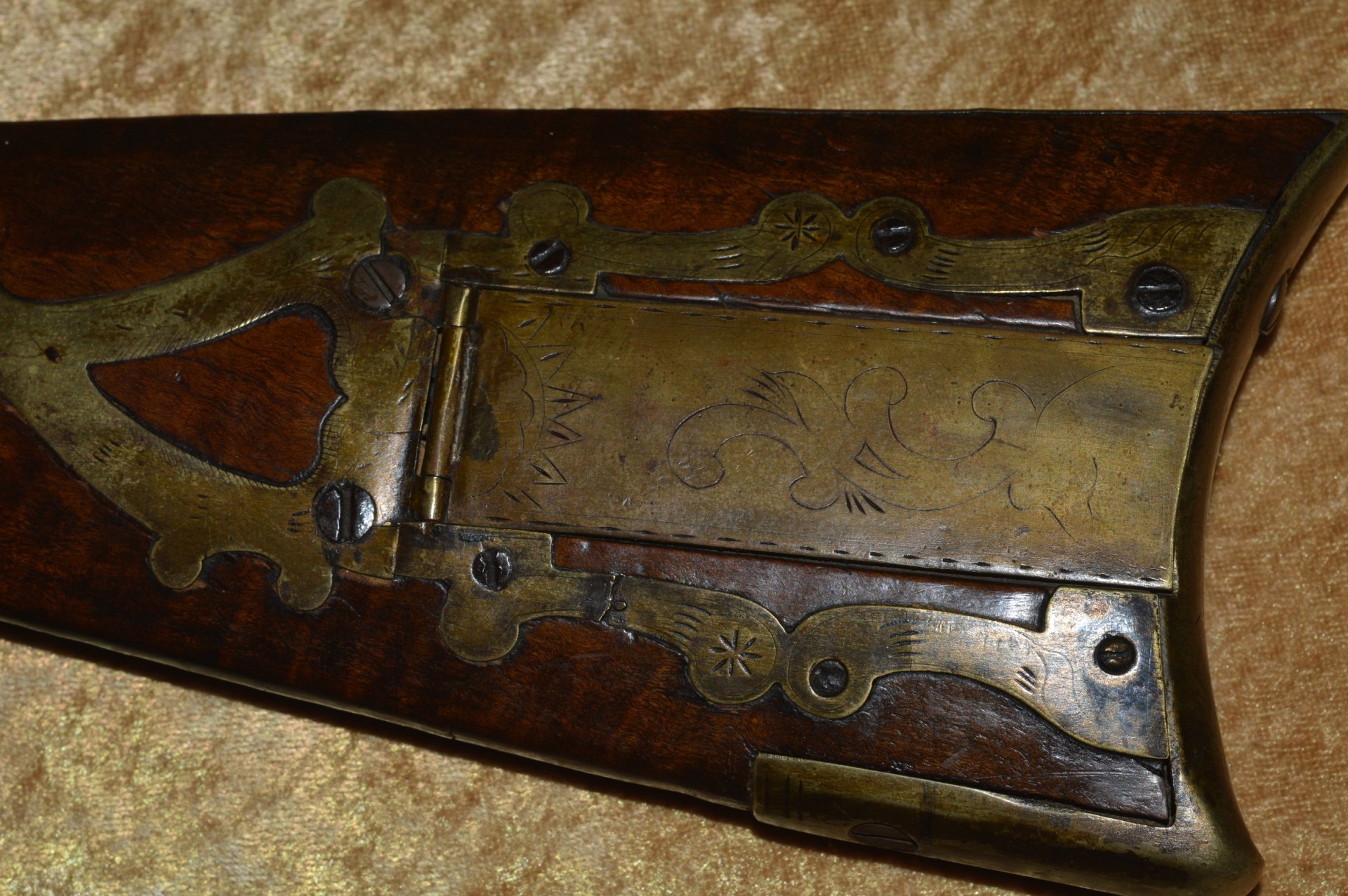 Featuring unmarked 40 7/8” (103.8 cm) octagonal barrel of approximately .44 caliber, with fixed iron rear notch sight and inlaid brass front blade sight. Original flintlock mechanism with unmarked flat lockplate and swan neck cock. Tiger stripe maple full stock (section of fore stock expertly repaired), with brass mounts, including decorative engraved patch box cover, trigger guard, butt cap, side plate, fore end cap, and three ramrod thimbles; wood ramrod. Very good condition, the barrel with pitting and dark rust patina, stock with lovely dark patina, and brass mounts with pleasing brownish gold patina. Overall length 56 1/4” (142.9 cm). Beautiful classic piece to hang over the fireplace.