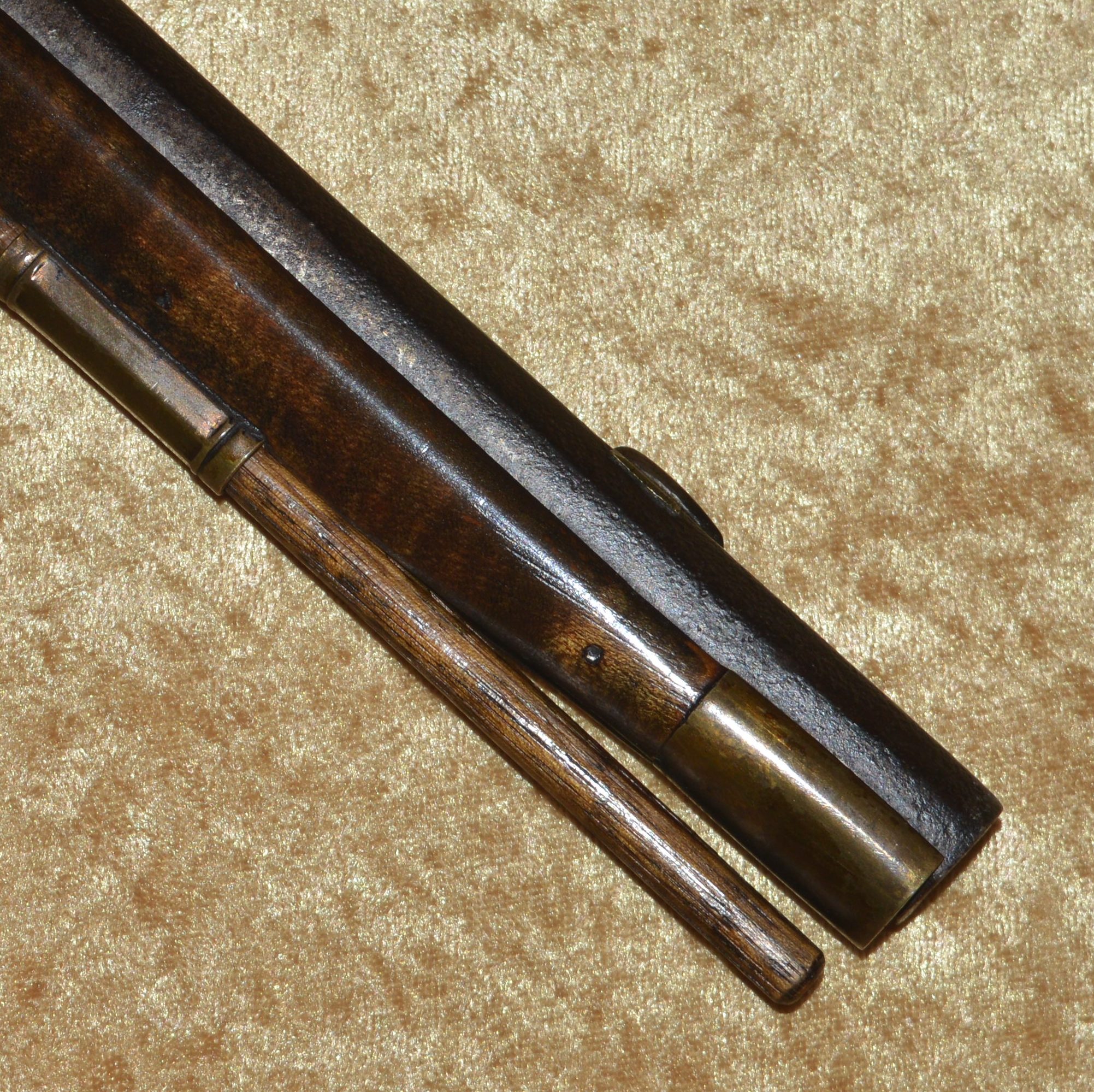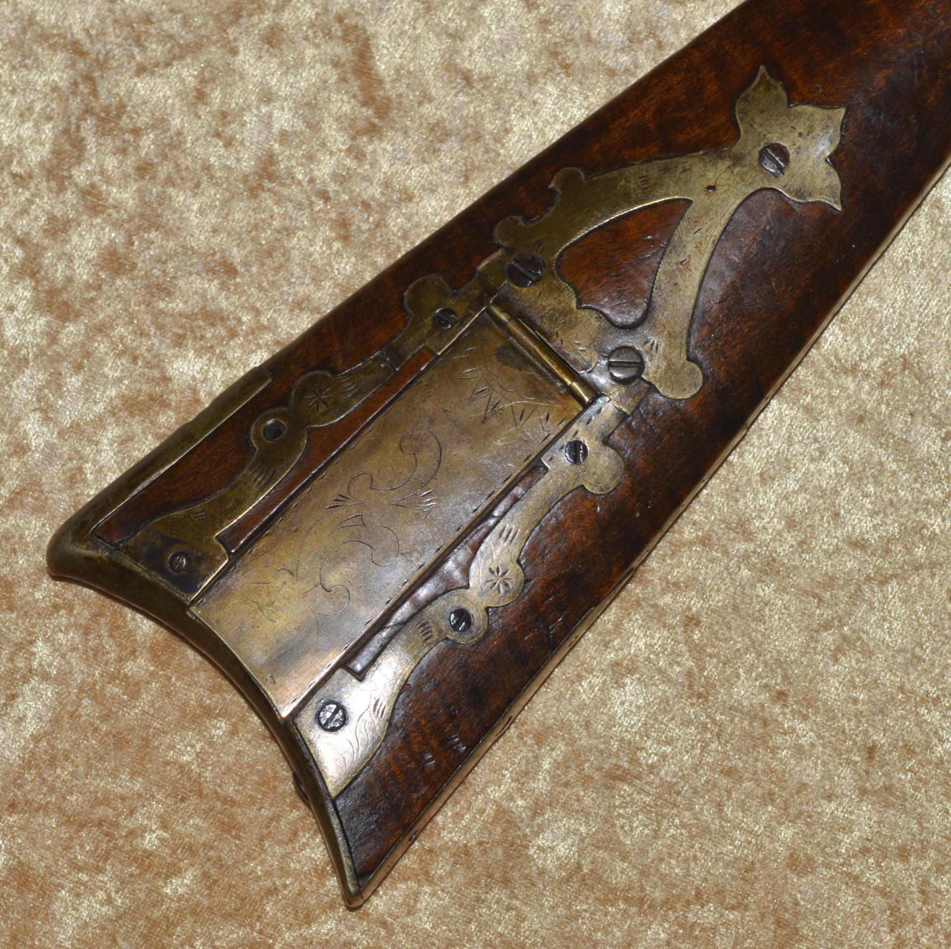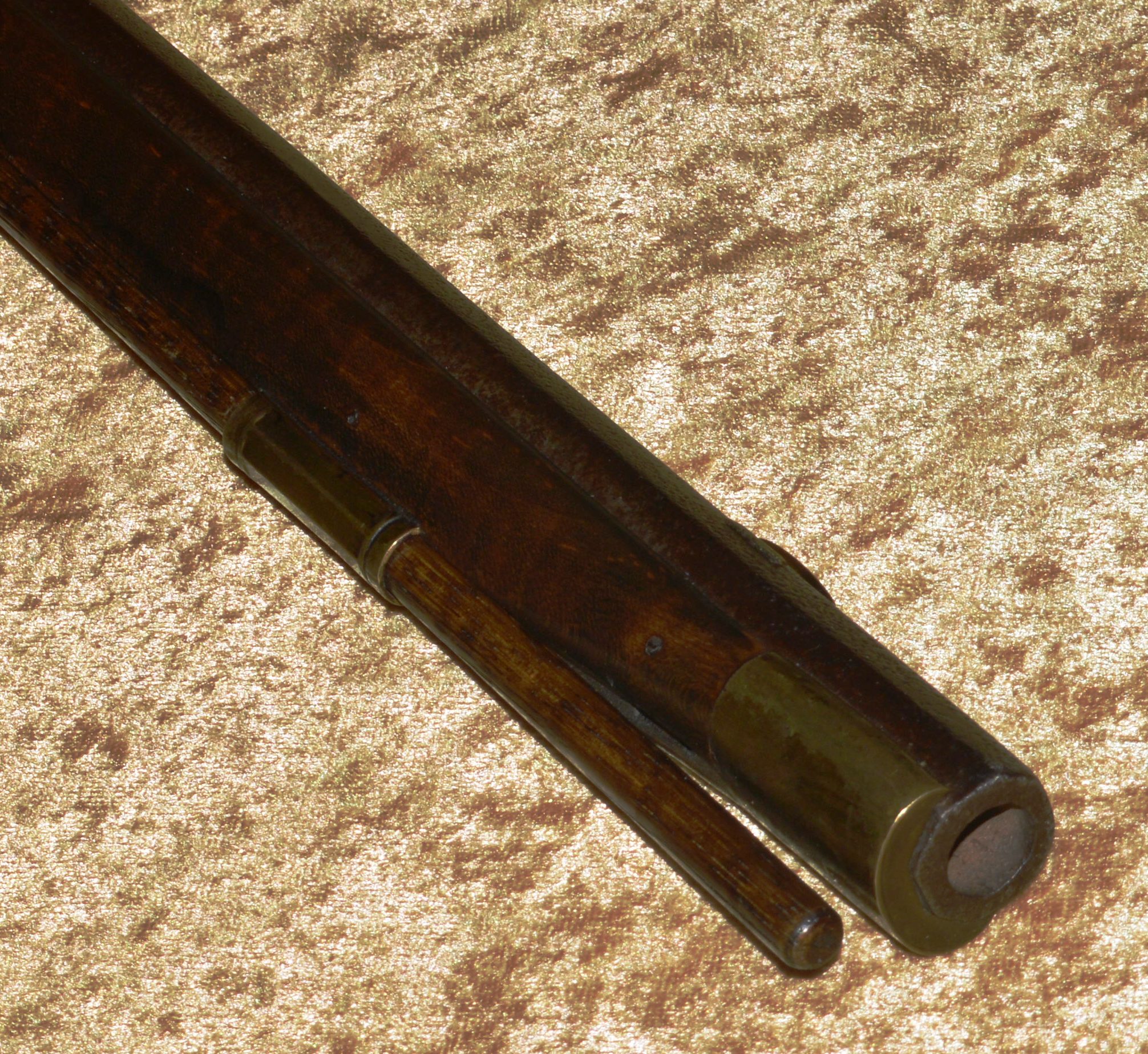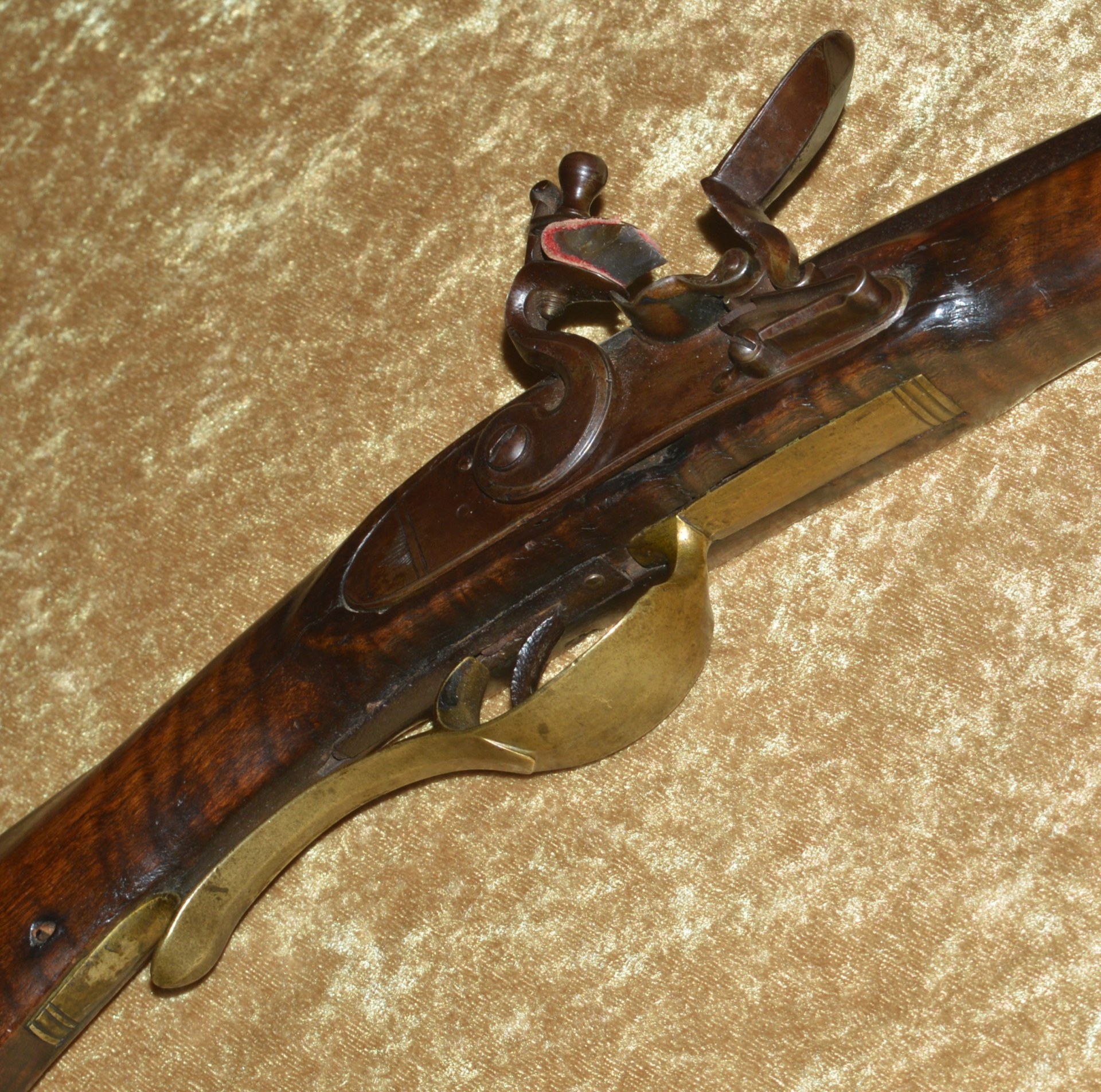 Featuring unmarked 40 7/8” (103.8 cm) octagonal barrel of approximately .44 caliber, with fixed iron rear notch sight and inlaid brass front blade sight. Original flintlock mechanism with unmarked flat lockplate and swan neck cock. Tiger stripe maple full stock (section of fore stock expertly repaired), with brass mounts, including decorative engraved patch box cover, trigger guard, butt cap, side plate, fore end cap, and three ramrod thimbles; wood ramrod. Very good condition, the barrel with pitting and dark rust patina, stock with lovely dark patina, and brass mounts with pleasing brownish gold patina. Overall length 56 1/4” (142.9 cm). Beautiful classic piece to hang over the fireplace.