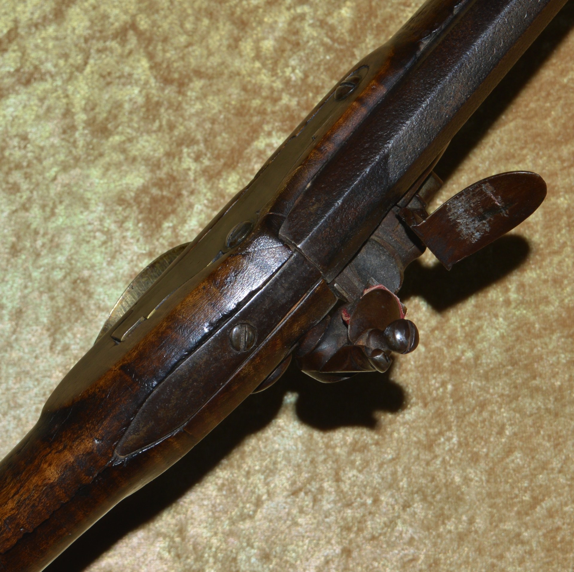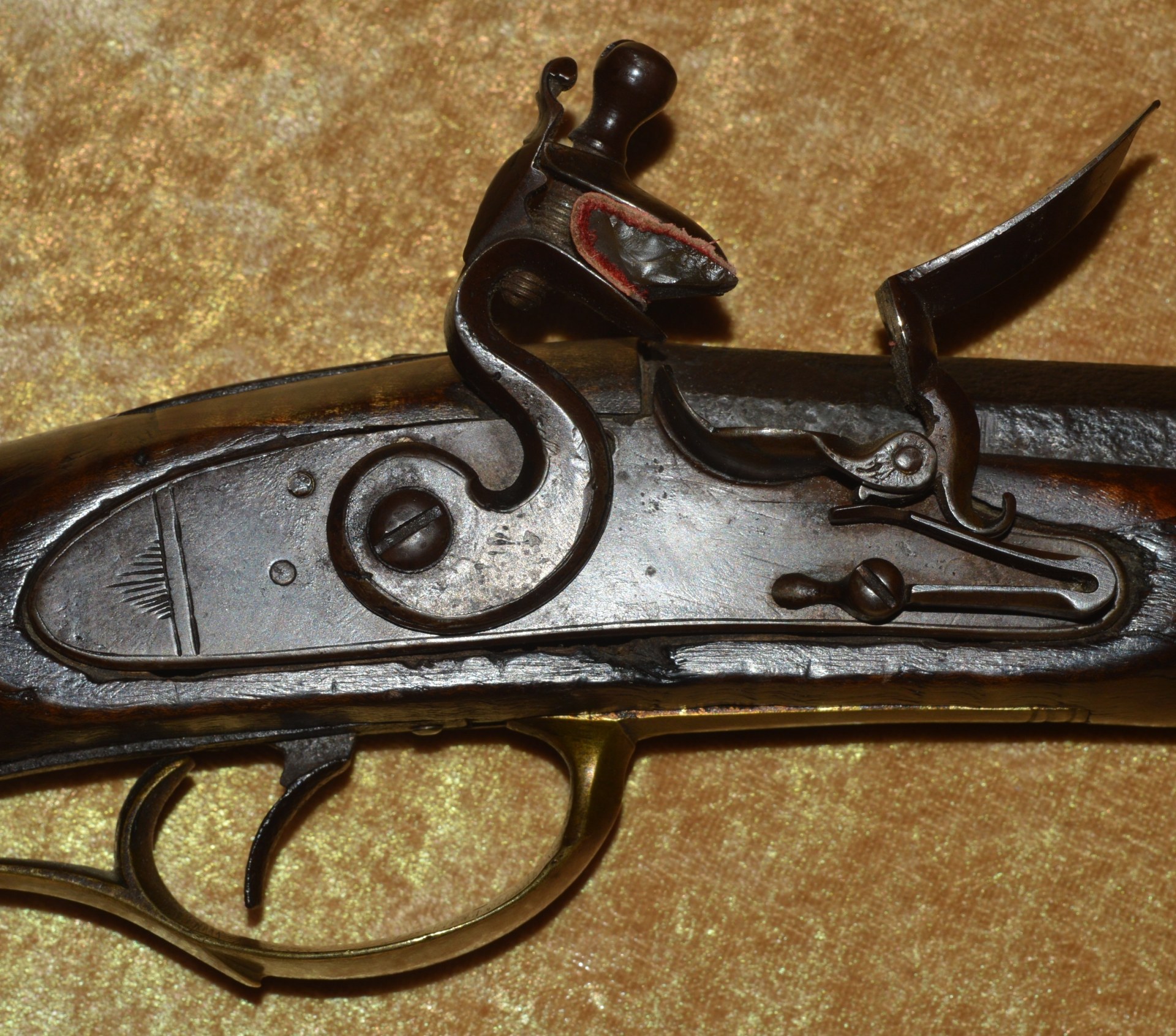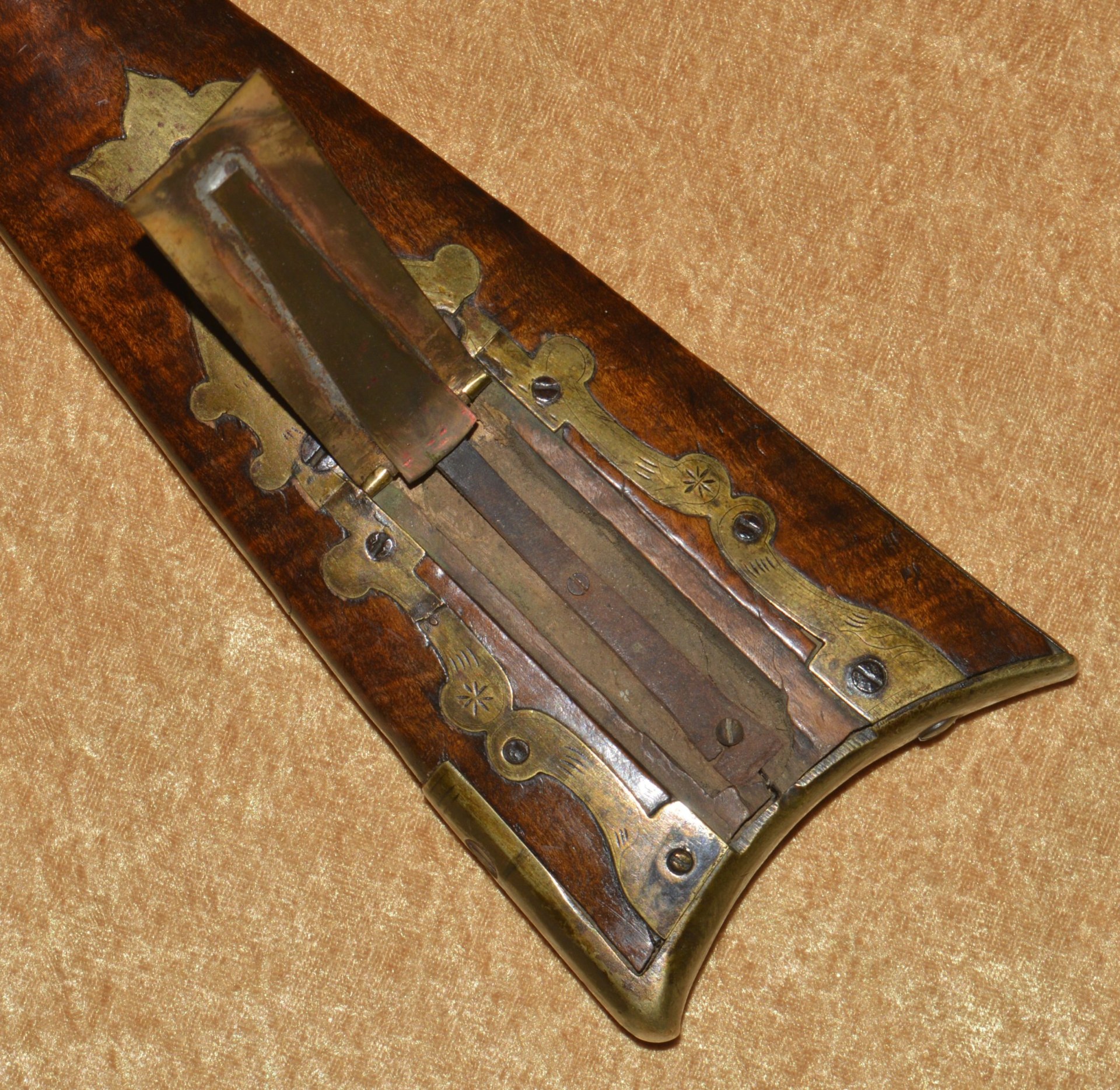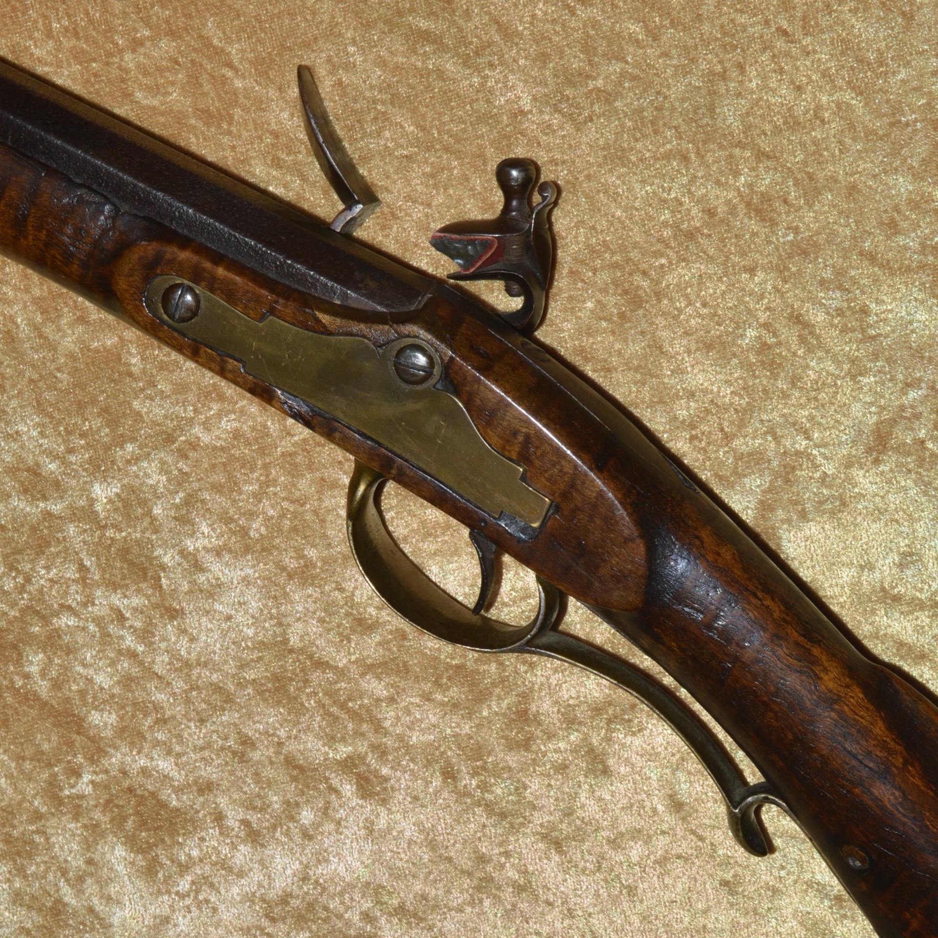 Featuring unmarked 40 7/8” (103.8 cm) octagonal barrel of approximately .44 caliber, with fixed iron rear notch sight and inlaid brass front blade sight. Original flintlock mechanism with unmarked flat lockplate and swan neck cock. Tiger stripe maple full stock (section of fore stock expertly repaired), with brass mounts, including decorative engraved patch box cover, trigger guard, butt cap, side plate, fore end cap, and three ramrod thimbles; wood ramrod. Very good condition, the barrel with pitting and dark rust patina, stock with lovely dark patina, and brass mounts with pleasing brownish gold patina. Overall length 56 1/4” (142.9 cm). Beautiful classic piece to hang over the fireplace.