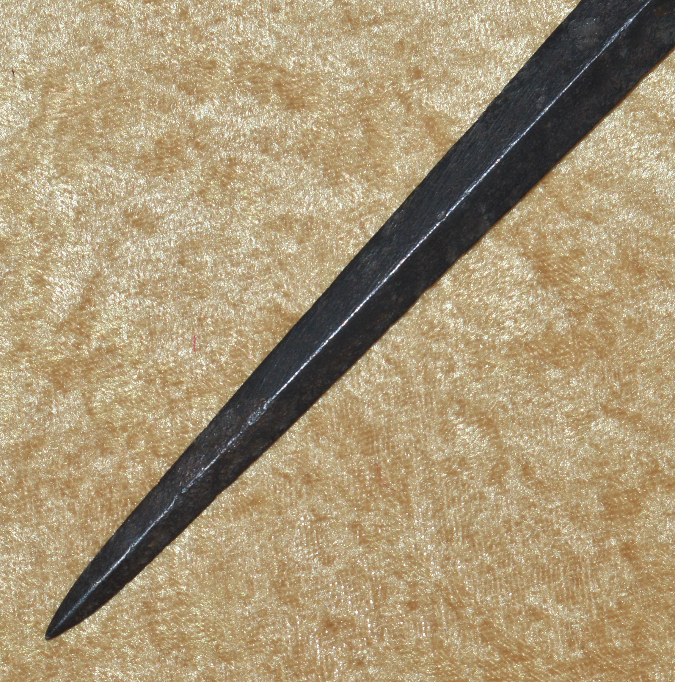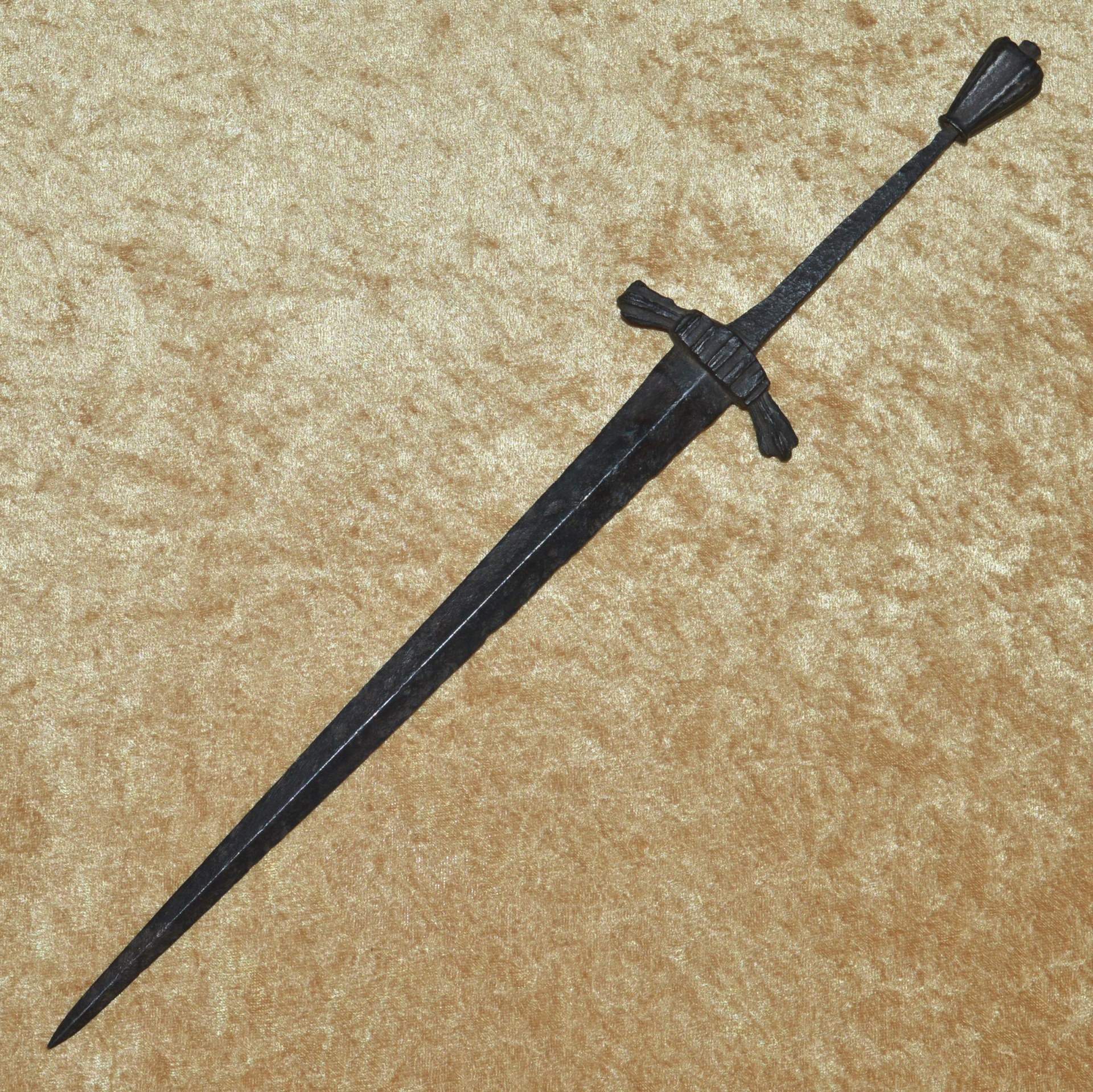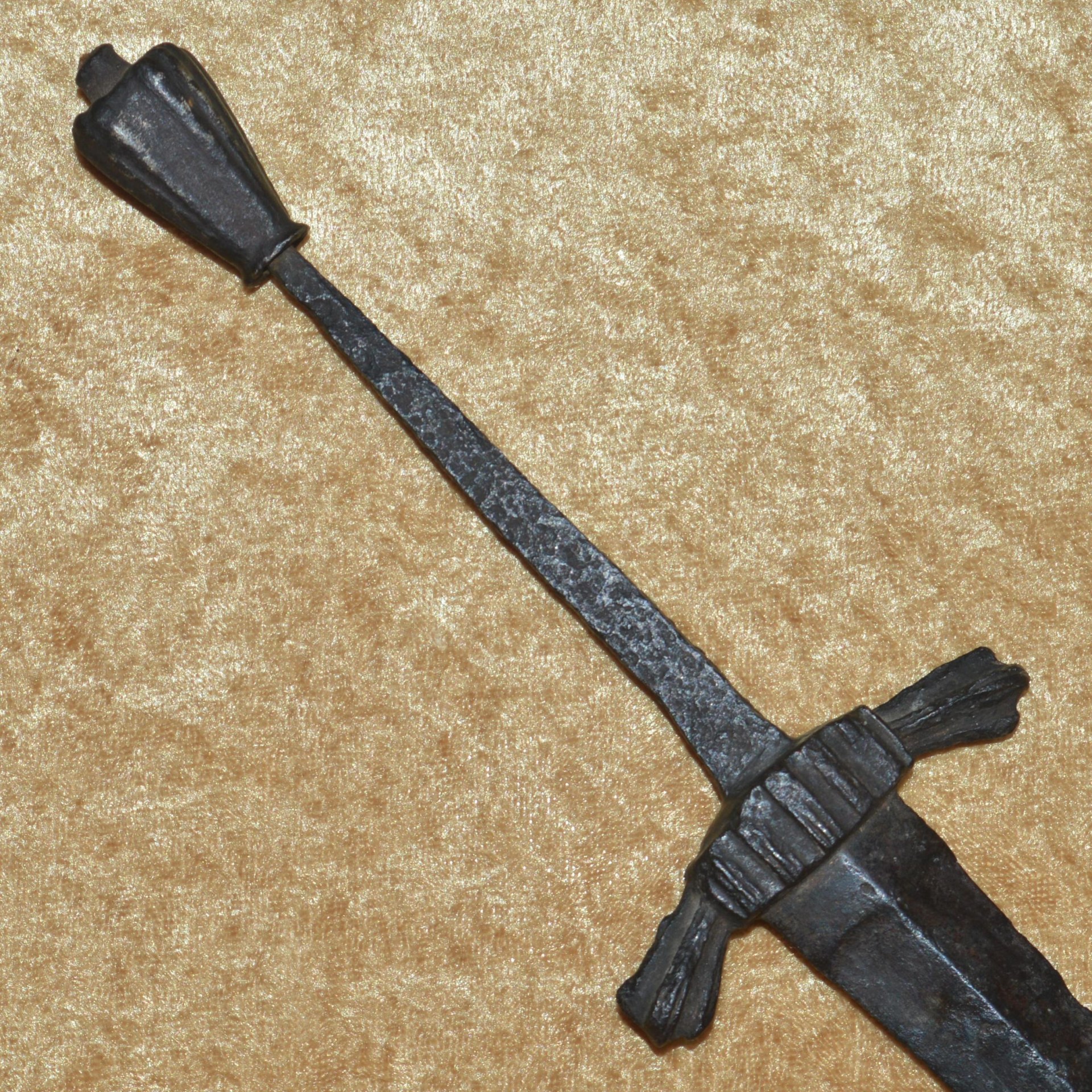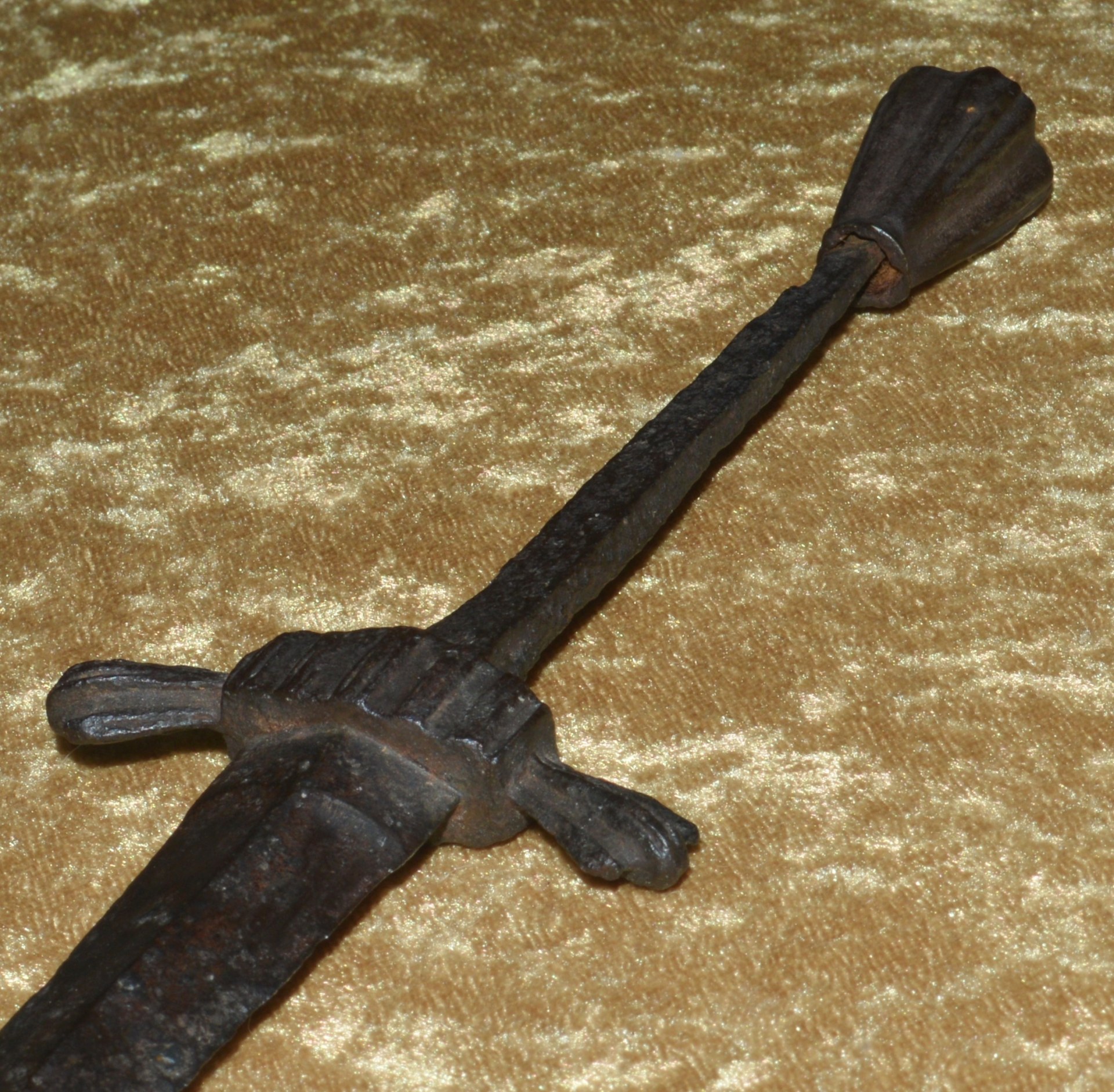 Featuring 10 5/8” (27 cm) blade of flattened diamond section, tapering to a sharp point. Vertically fluted quillon block and down-turned quillions with button finials, chiseled ensuite. Guard is fused to the blade by corrosion. Fluted stopper-shaped pommel with button (loose), retaining what appears to be remnants of its original grip inside the cavity. In excavated condition, lacking grip, with scattered moderate to heavy pitting and dark patina. Possibly a river find, as it is in generally better condition than most ground finds. Overall length 16 1/4” (41.3 cm). Provenance: Hermann Historica, Munich, Oct. 11, 2023, Lot 1145