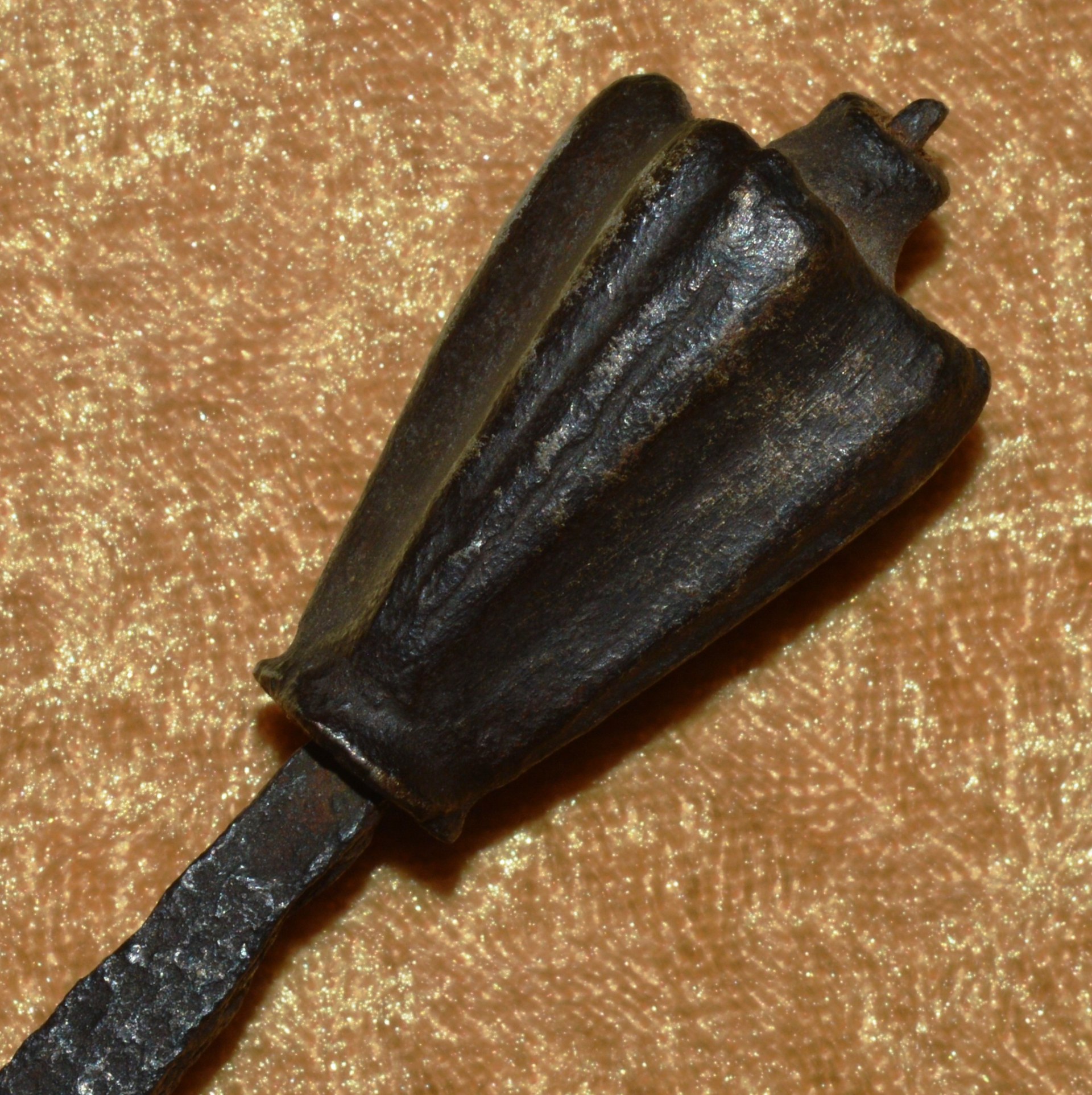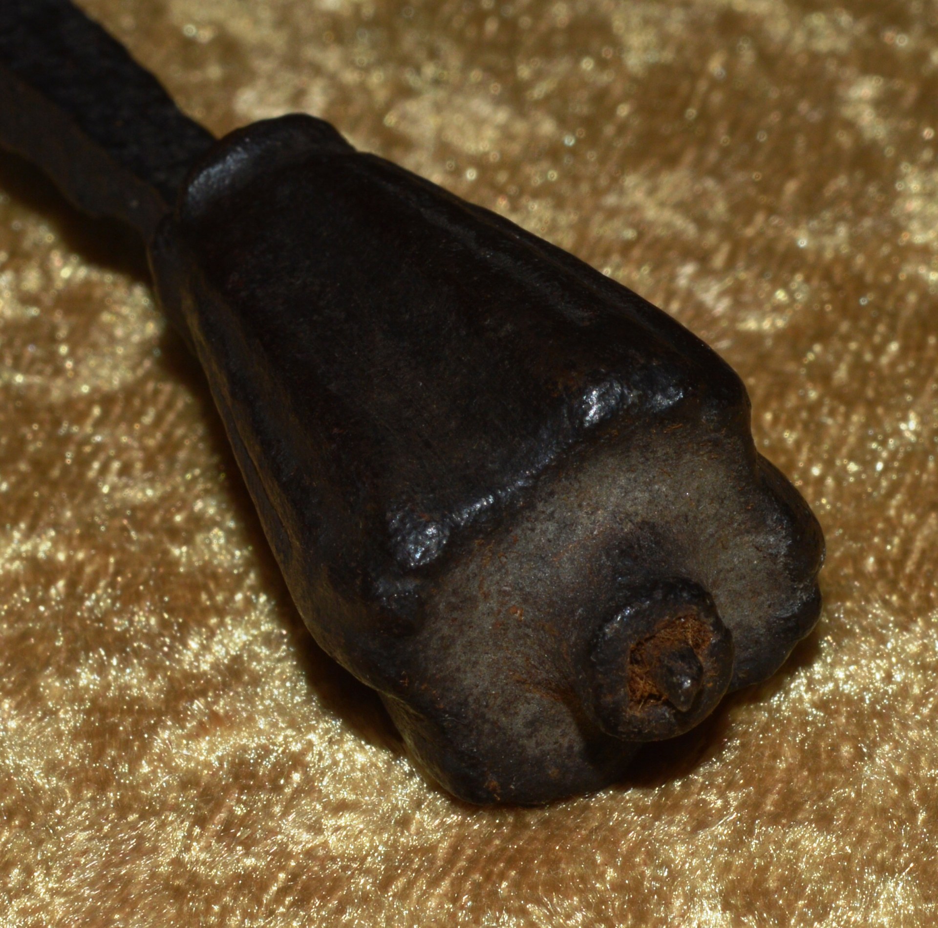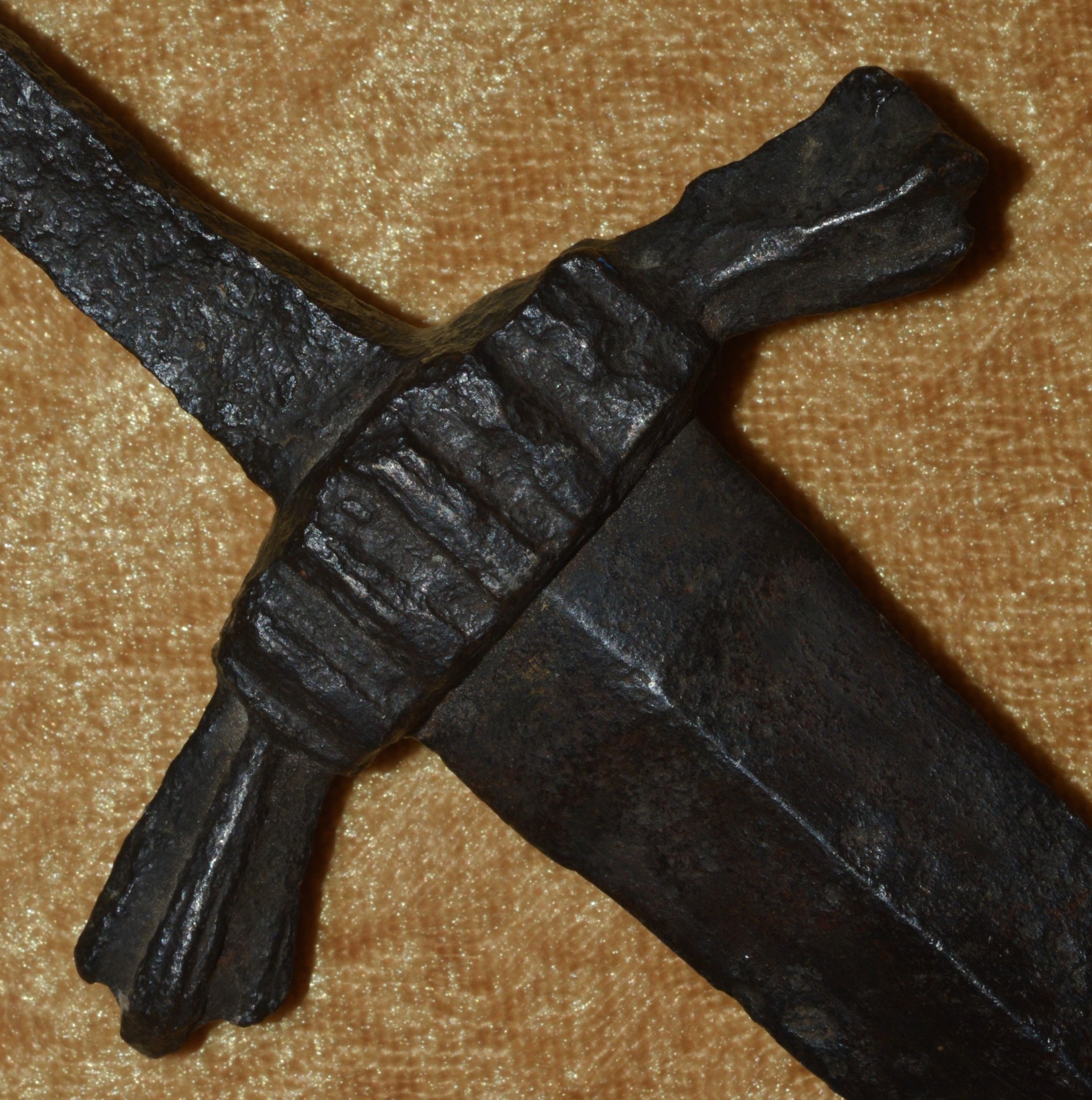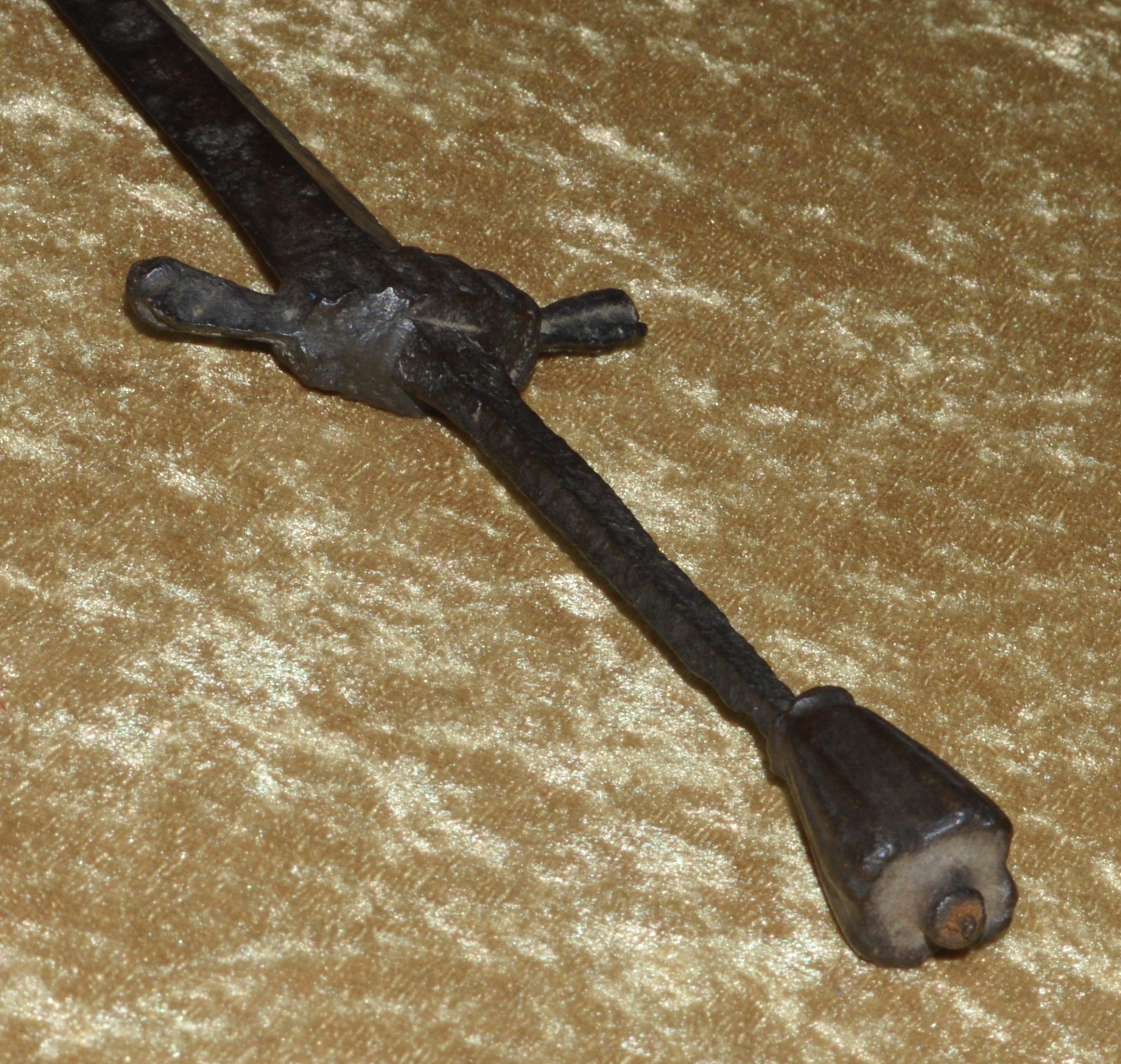 Featuring 10 5/8” (27 cm) blade of flattened diamond section, tapering to a sharp point. Vertically fluted quillon block and down-turned quillions with button finials, chiseled ensuite. Guard is fused to the blade by corrosion. Fluted stopper-shaped pommel with button (loose), retaining what appears to be remnants of its original grip inside the cavity. In excavated condition, lacking grip, with scattered moderate to heavy pitting and dark patina. Possibly a river find, as it is in generally better condition than most ground finds. Overall length 16 1/4” (41.3 cm). Provenance: Hermann Historica, Munich, Oct. 11, 2023, Lot 1145