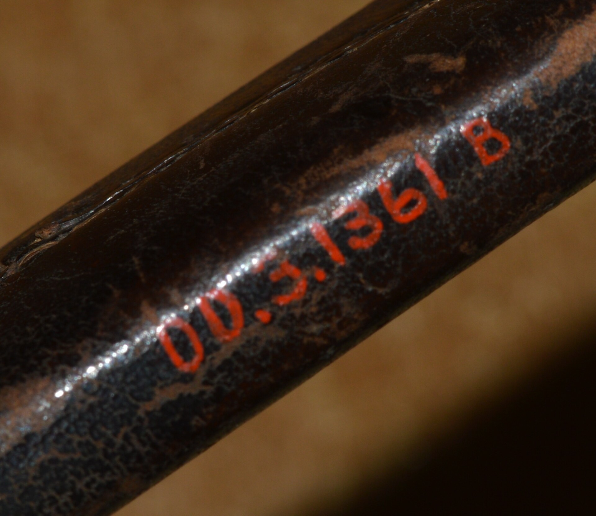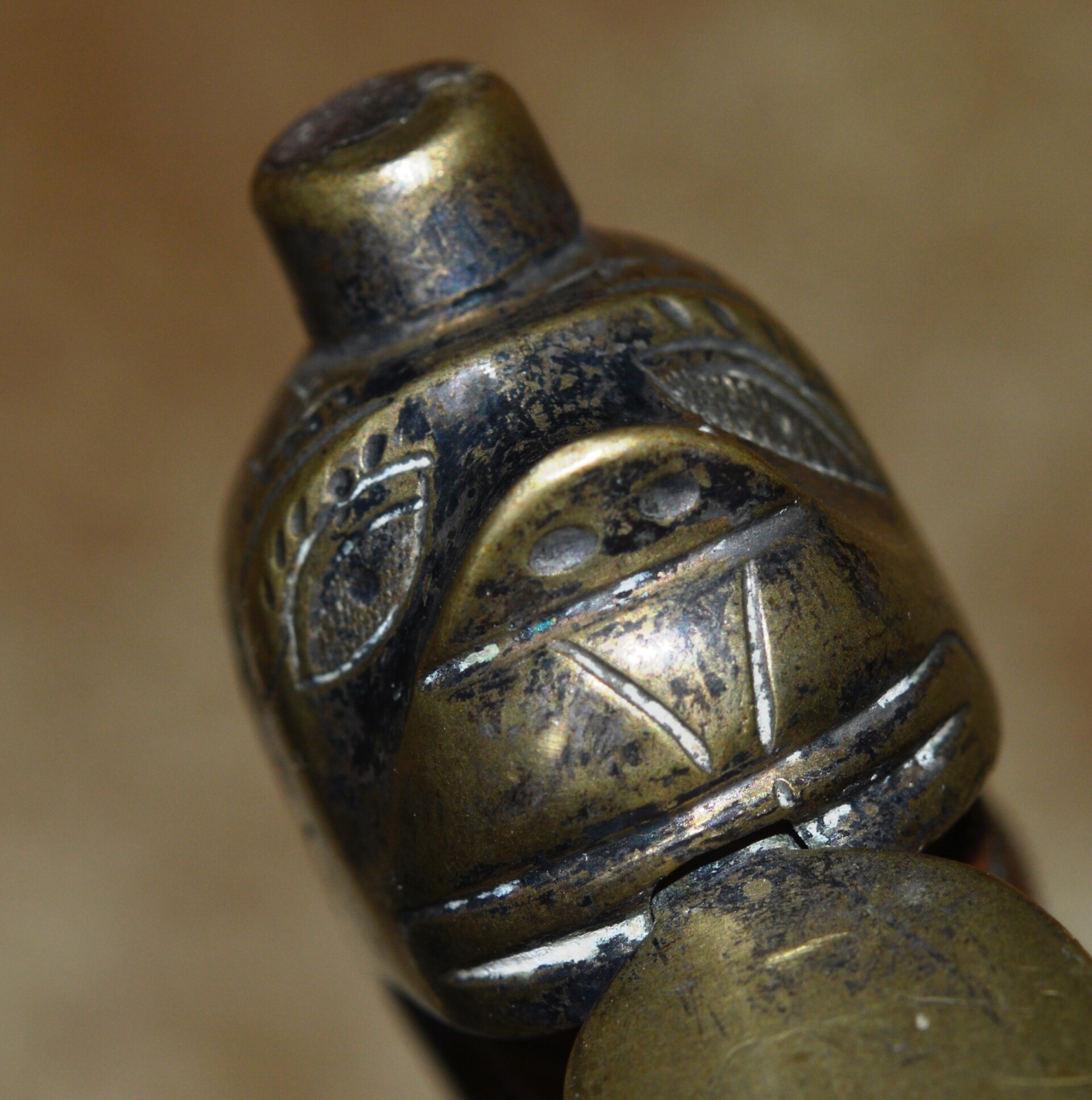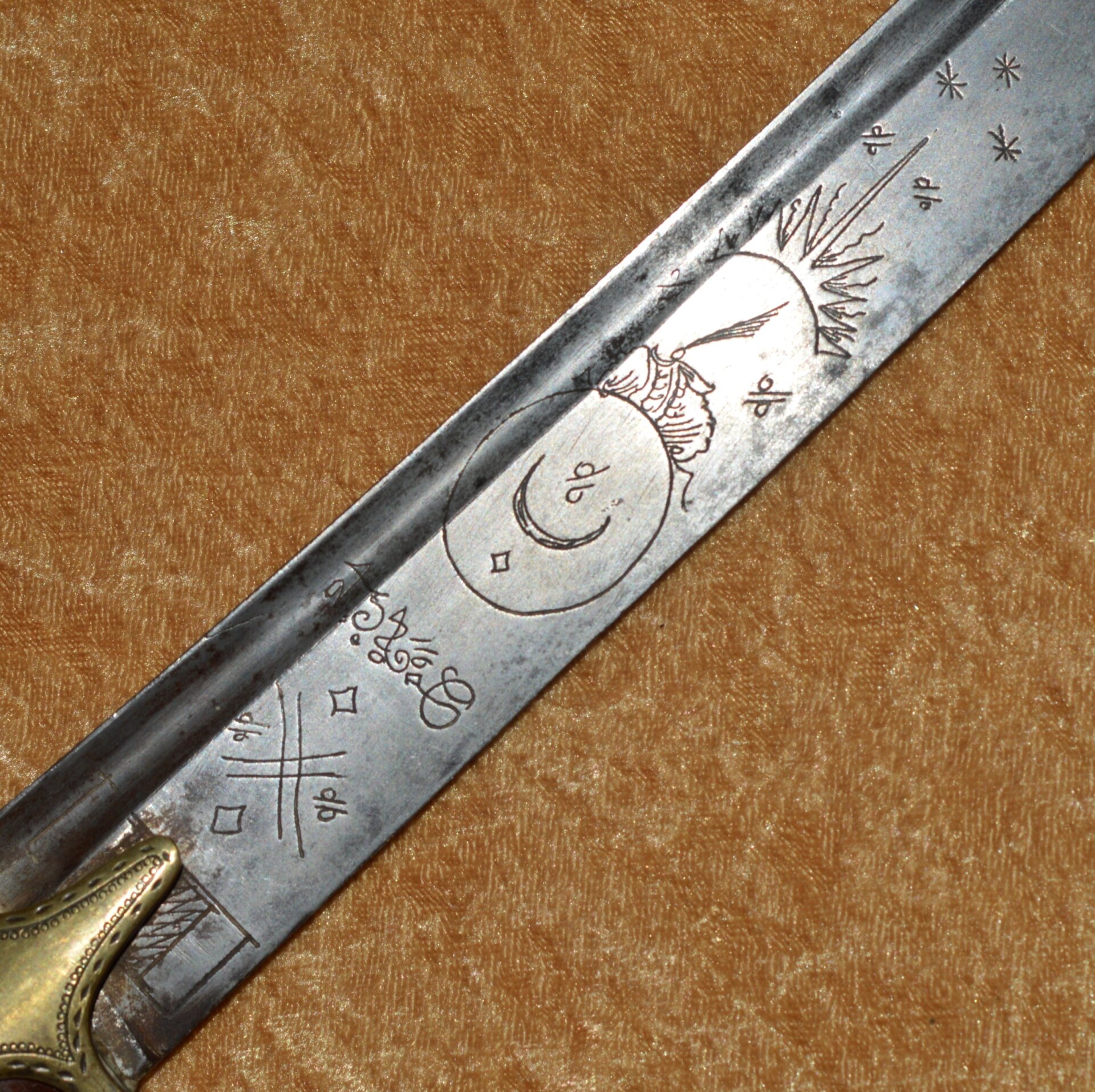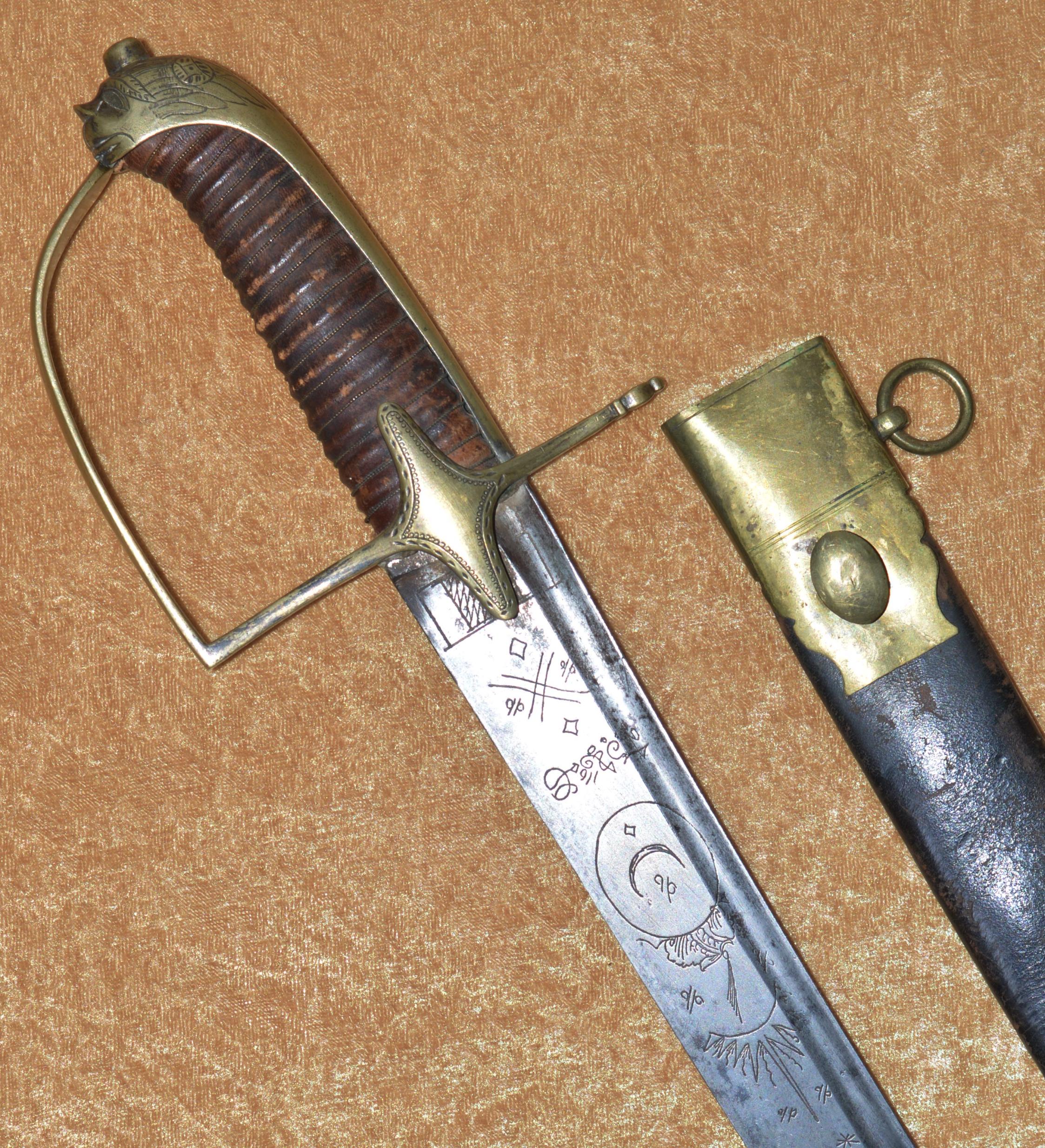 Featuring brass hilt with stirrup guard and engraved double langets; lion head pommel with integral backstrap. Original leather grip with fine twisted brass wire wrap. Curved single-edged 28 3/4” (73 cm) blade with deep fuller at the back edge and double-edged for the last 7”. Blade finely engraved with sun, moon, and magnate profile bust. Original black leather scabbard with sheet brass drag, middle band, and throat with frog button; twin carry rings. Scabbard with red painted museum inventory mark. Blade smooth, with age staining; markings sharp and clear. Leather grip showing wear and use. Scabbard leather shows wear, but complete and supple. Overall length 33 3/4” (85.7 cm), not including scabbard.
