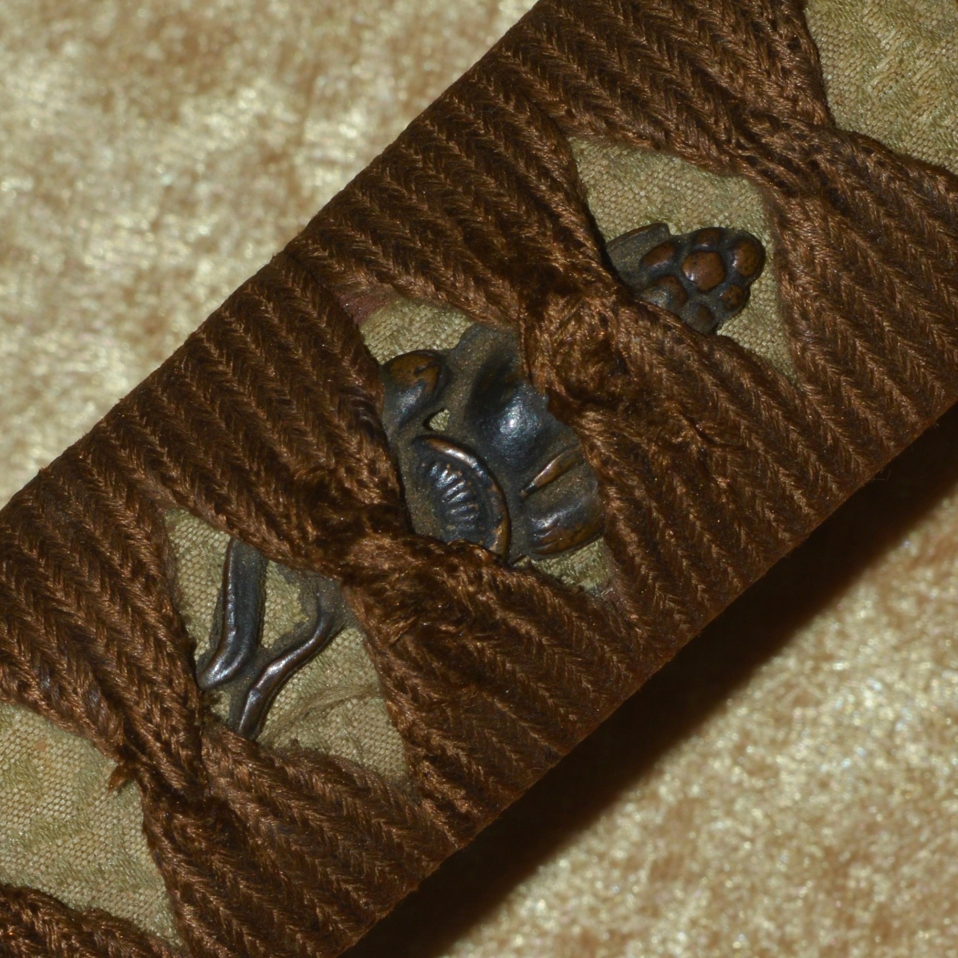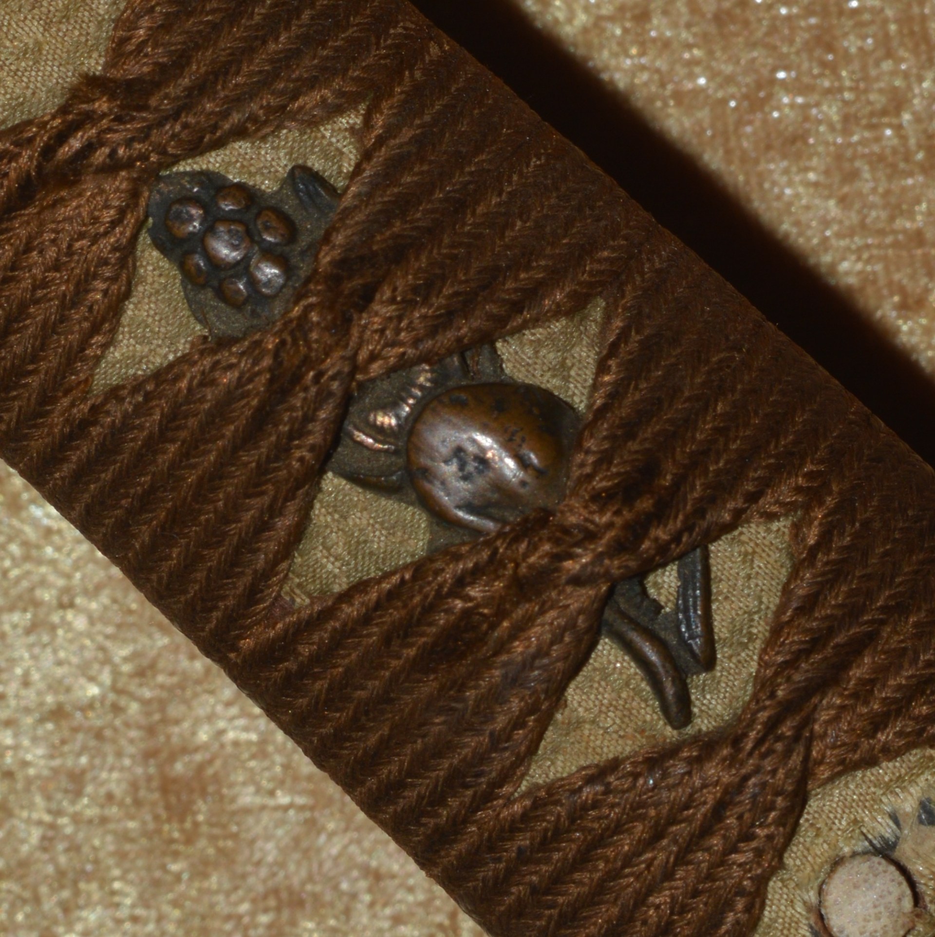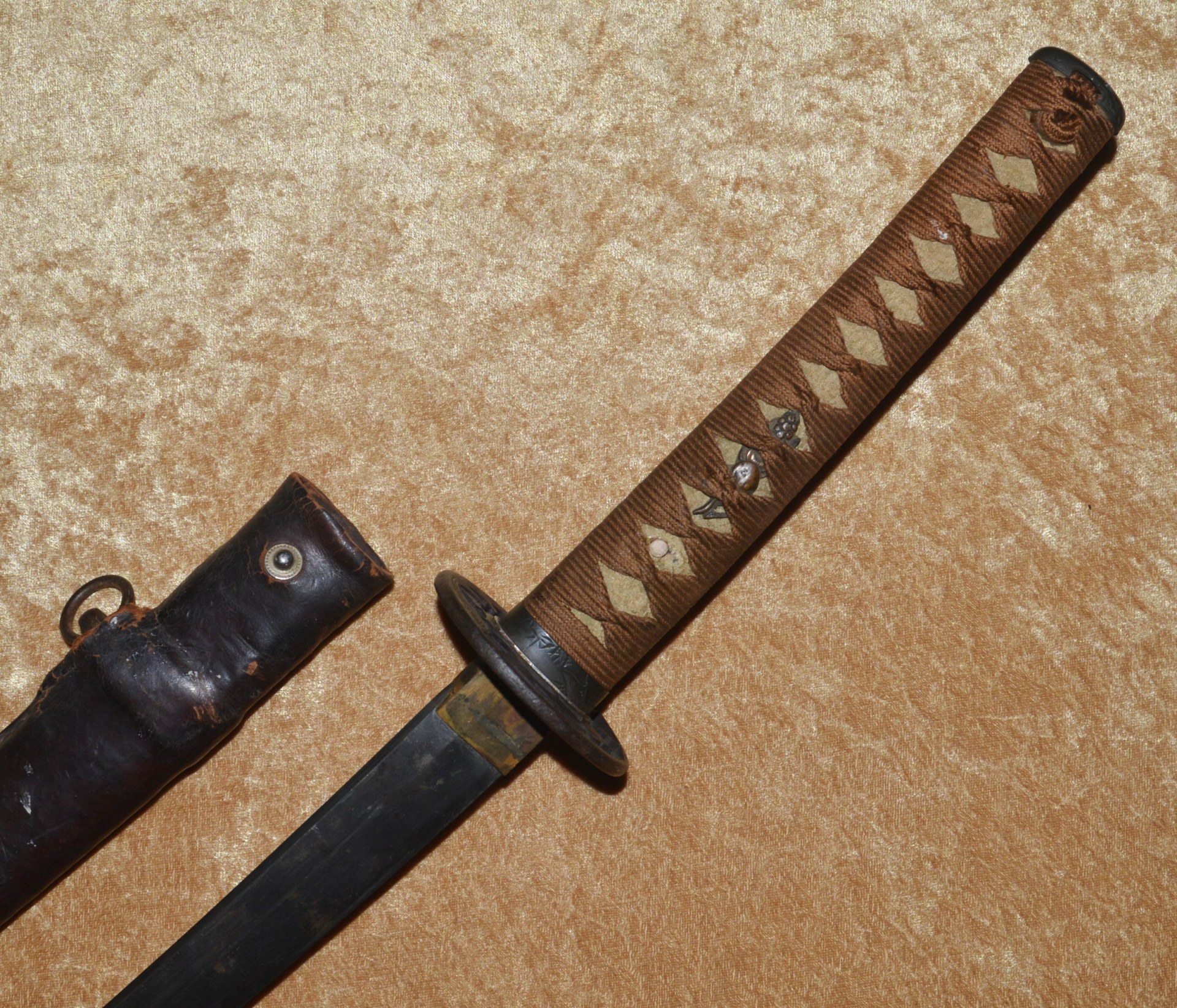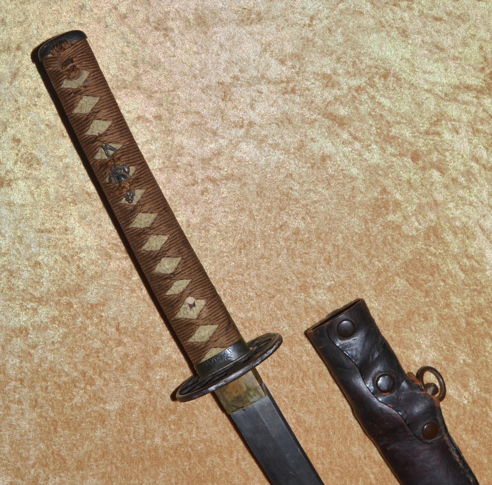 Wartime production using non-traditional methods, the blade features a 25 1/8” (63.8 cm) cutting edge and gunome hamon (zigzag temper line). Nakago (tang) is signed “Noshu Seku ju Hattori Masahiro saku”, with Seki arsenal stamp. Gunto (military) mounts, but featuring an older decorative pierced iron tsuba (guard) and bronze menuke (grip ornaments) representing what appears to be some kind of insect. Brown silk ito (braid) over non-traditional textile tsuka (grip) cover. Steel saya (scabbard) with single carry ring and wartime leather combat cover. Overall length 35 3/8” (90 cm), not including saya. Blade smooth and bright, with scratches, spotting and a shallow nick about 6” from the tip; the hamon clearly visible. Combat cover with a large portion of the seam open; the leather generally soft and supple. The Japanese were the last army to carry and use swords on the battlefield. Despite them being obsolete in modern warfare, they were often used in last ditch bonzai attacks or ritual suicide.