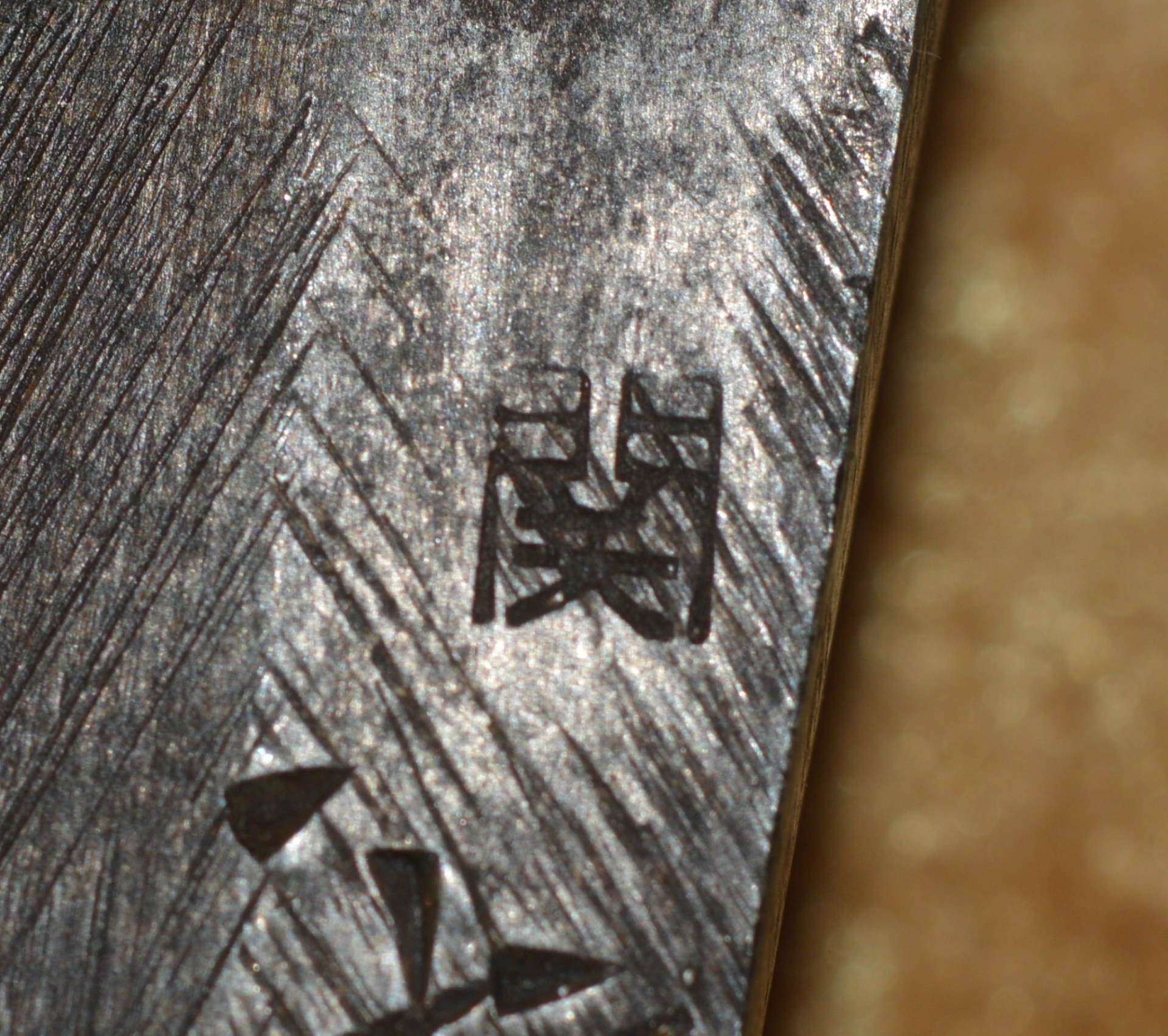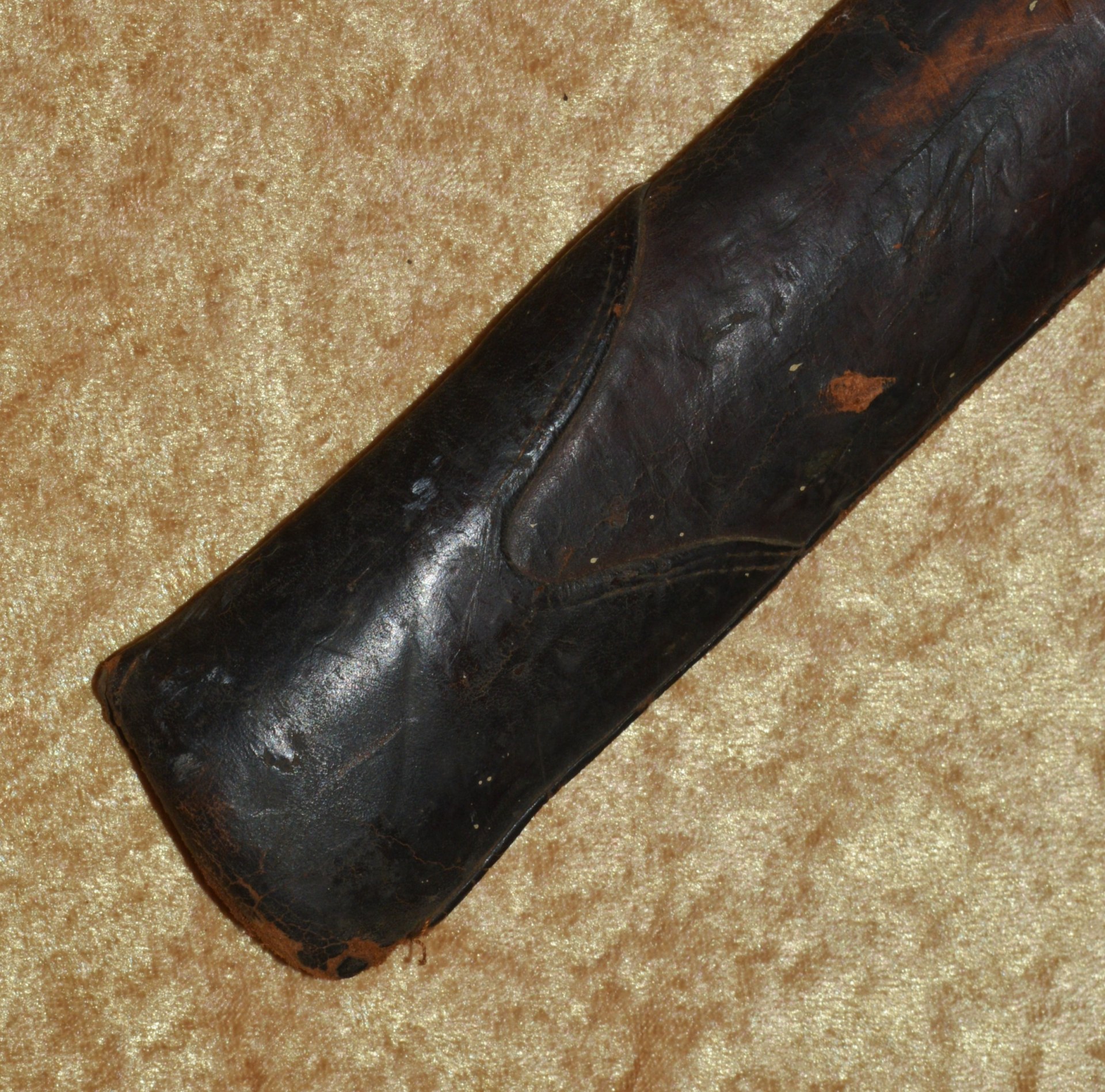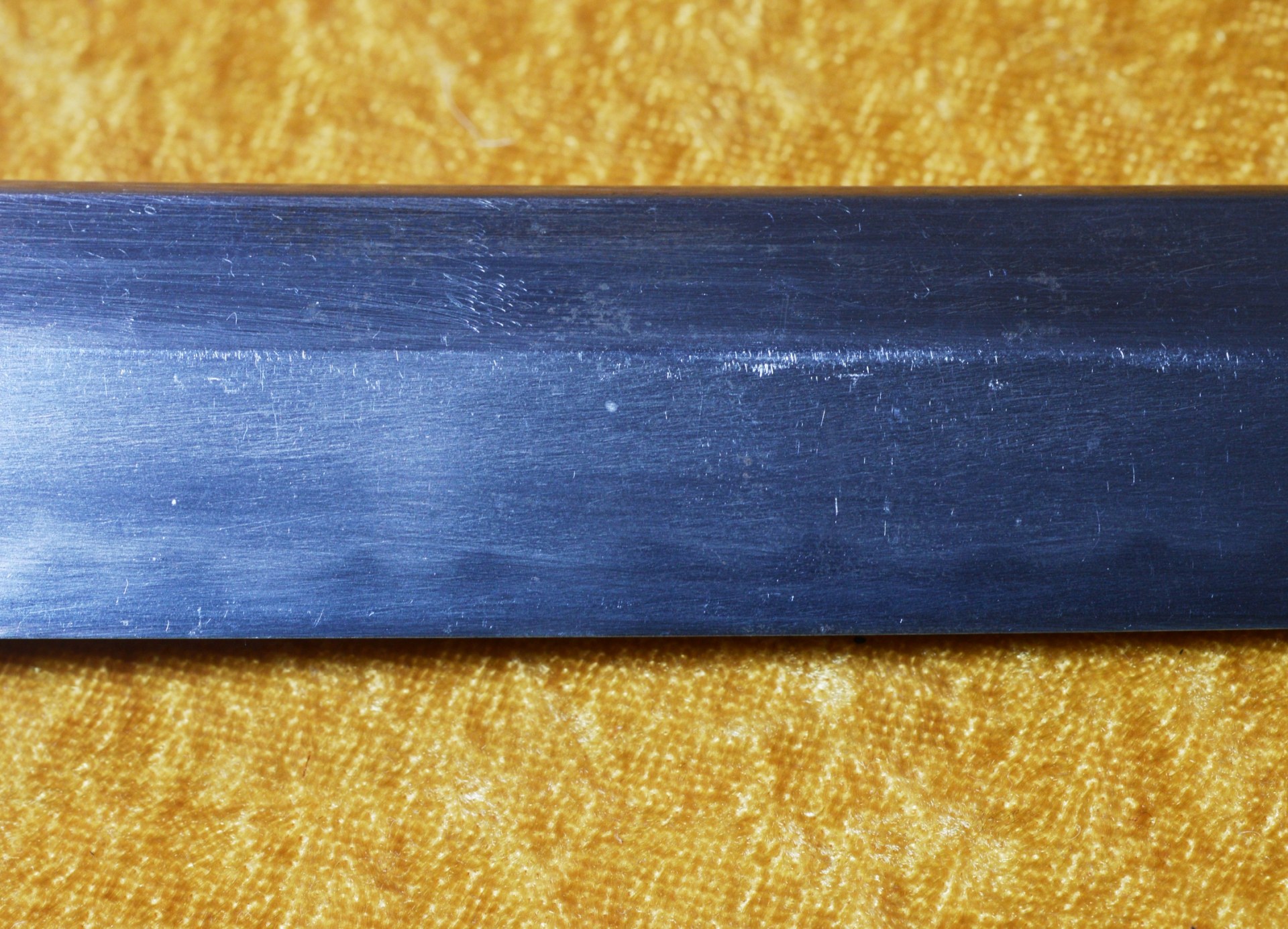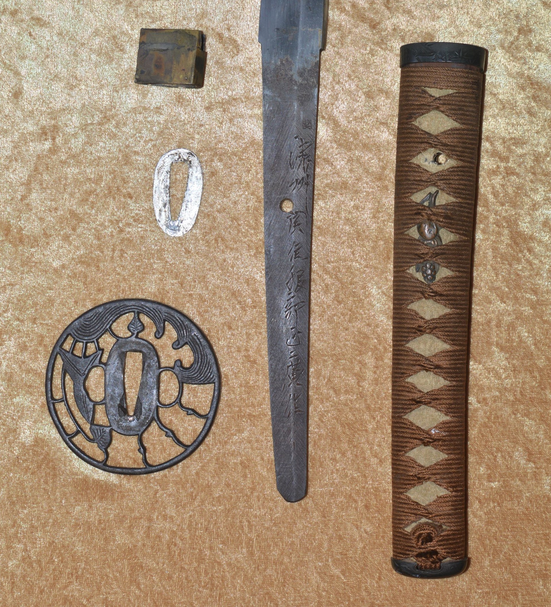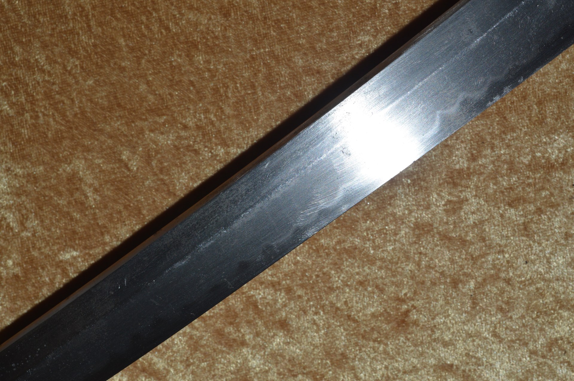 Wartime production using non-traditional methods, the blade features a 25 1/8” (63.8 cm) cutting edge and gunome hamon (zigzag temper line). Nakago (tang) is signed “Noshu Seku ju Hattori Masahiro saku”, with Seki arsenal stamp. Gunto (military) mounts, but featuring an older decorative pierced iron tsuba (guard) and bronze menuke (grip ornaments) representing what appears to be some kind of insect. Brown silk ito (braid) over non-traditional textile tsuka (grip) cover. Steel saya (scabbard) with single carry ring and wartime leather combat cover. Overall length 35 3/8” (90 cm), not including saya. Blade smooth and bright, with scratches, spotting and a shallow nick about 6” from the tip; the hamon clearly visible. Combat cover with a large portion of the seam open; the leather generally soft and supple. The Japanese were the last army to carry and use swords on the battlefield. Despite them being obsolete in modern warfare, they were often used in last ditch bonzai attacks or ritual suicide.