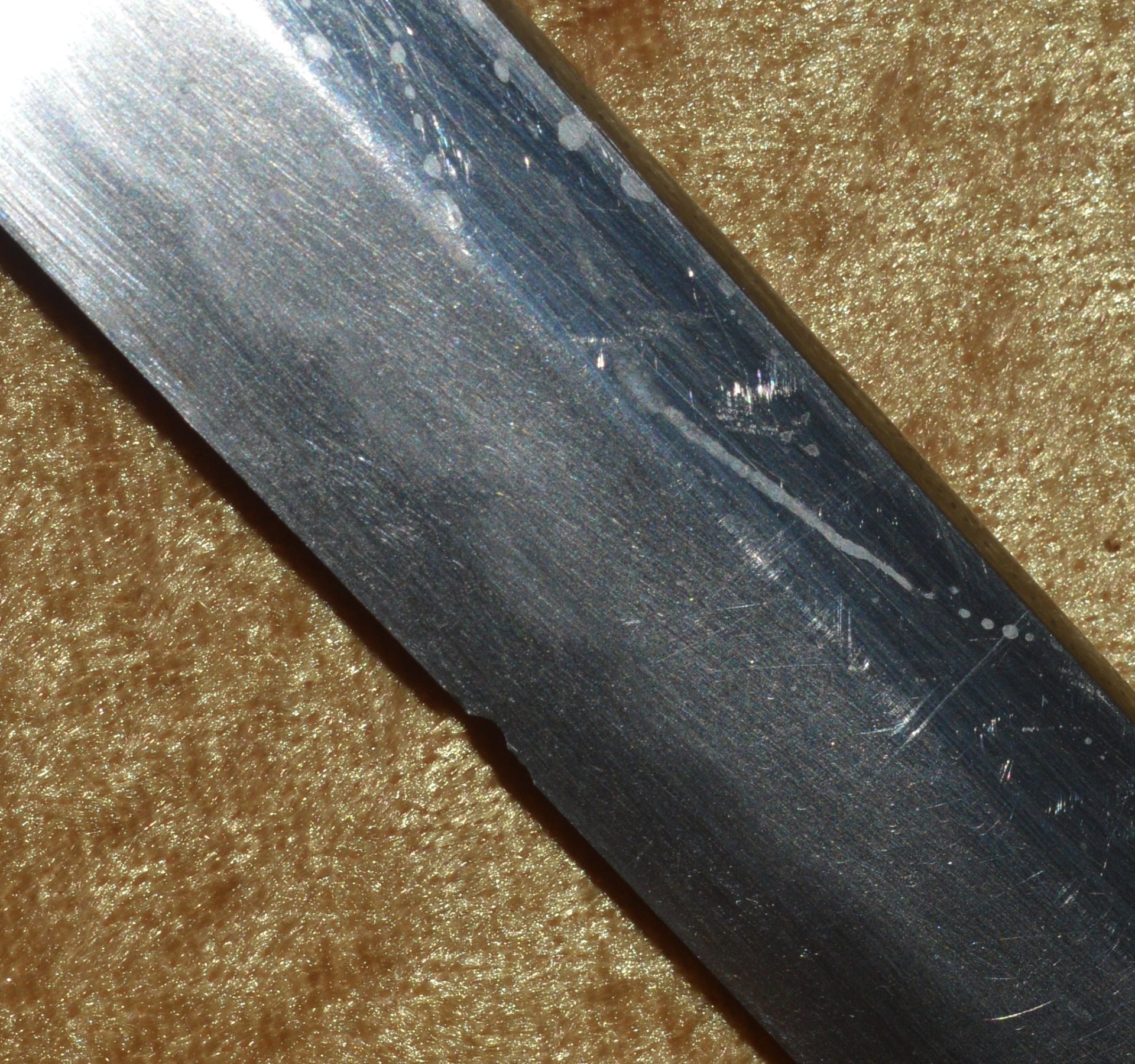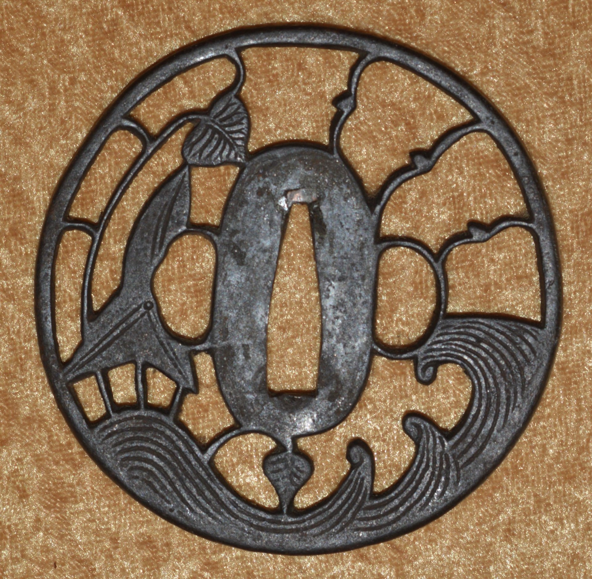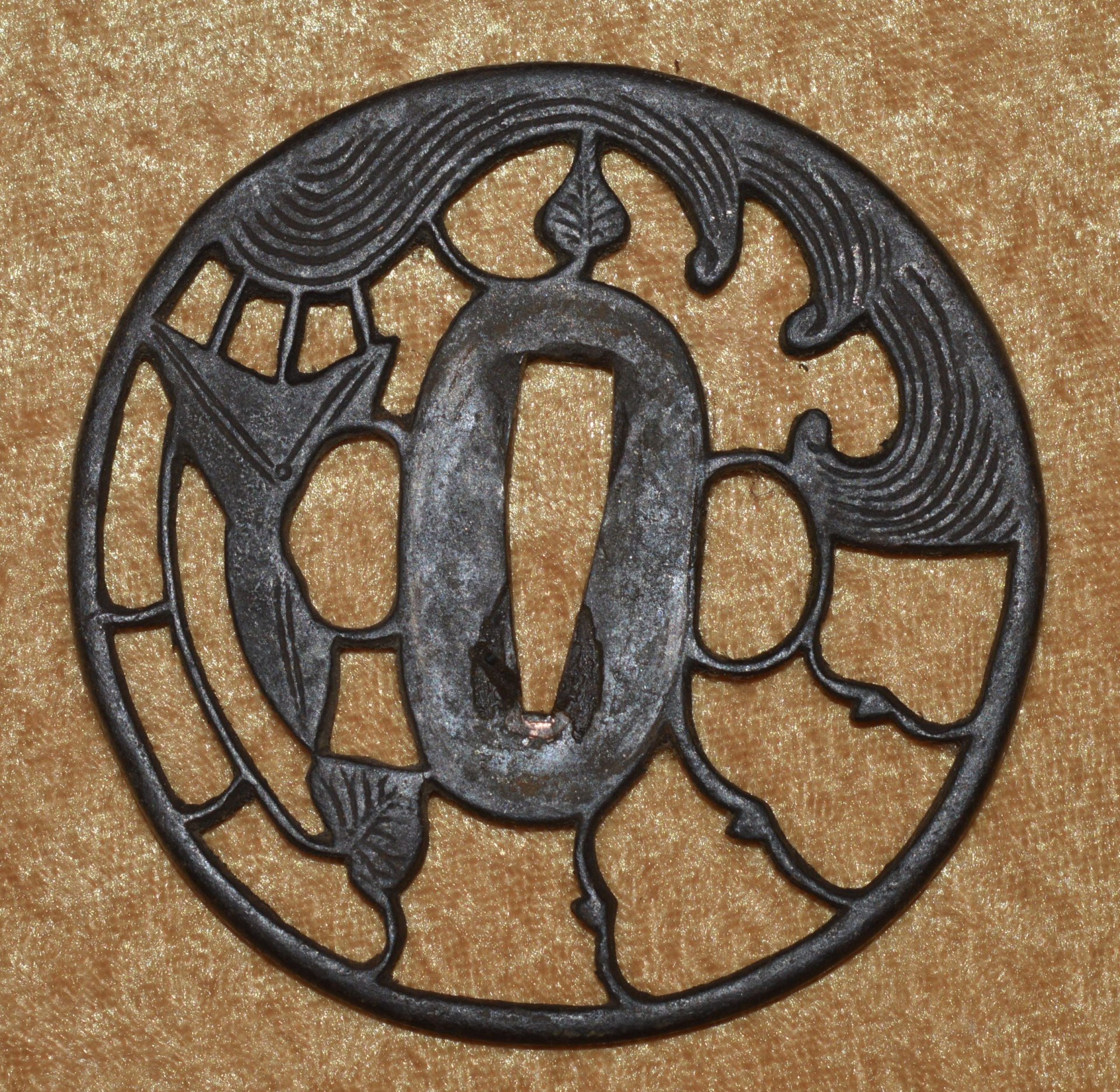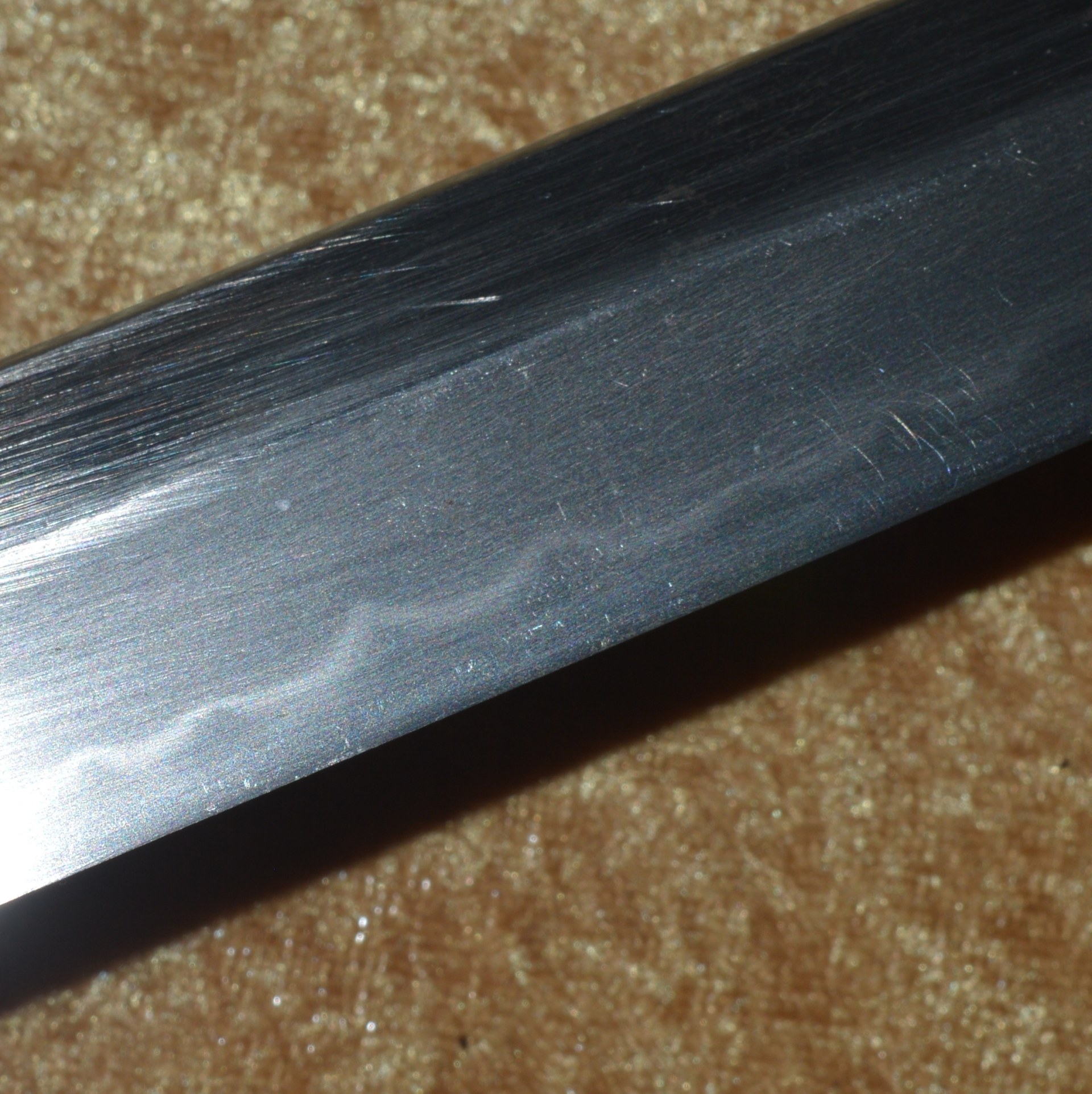 Wartime production using non-traditional methods, the blade features a 25 1/8” (63.8 cm) cutting edge and gunome hamon (zigzag temper line). Nakago (tang) is signed “Noshu Seku ju Hattori Masahiro saku”, with Seki arsenal stamp. Gunto (military) mounts, but featuring an older decorative pierced iron tsuba (guard) and bronze menuke (grip ornaments) representing what appears to be some kind of insect. Brown silk ito (braid) over non-traditional textile tsuka (grip) cover. Steel saya (scabbard) with single carry ring and wartime leather combat cover. Overall length 35 3/8” (90 cm), not including saya. Blade smooth and bright, with scratches, spotting and a shallow nick about 6” from the tip; the hamon clearly visible. Combat cover with a large portion of the seam open; the leather generally soft and supple. The Japanese were the last army to carry and use swords on the battlefield. Despite them being obsolete in modern warfare, they were often used in last ditch bonzai attacks or ritual suicide.