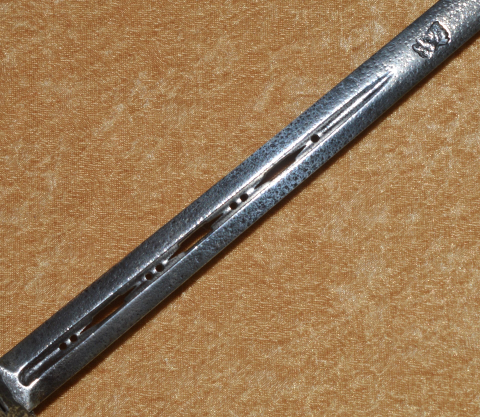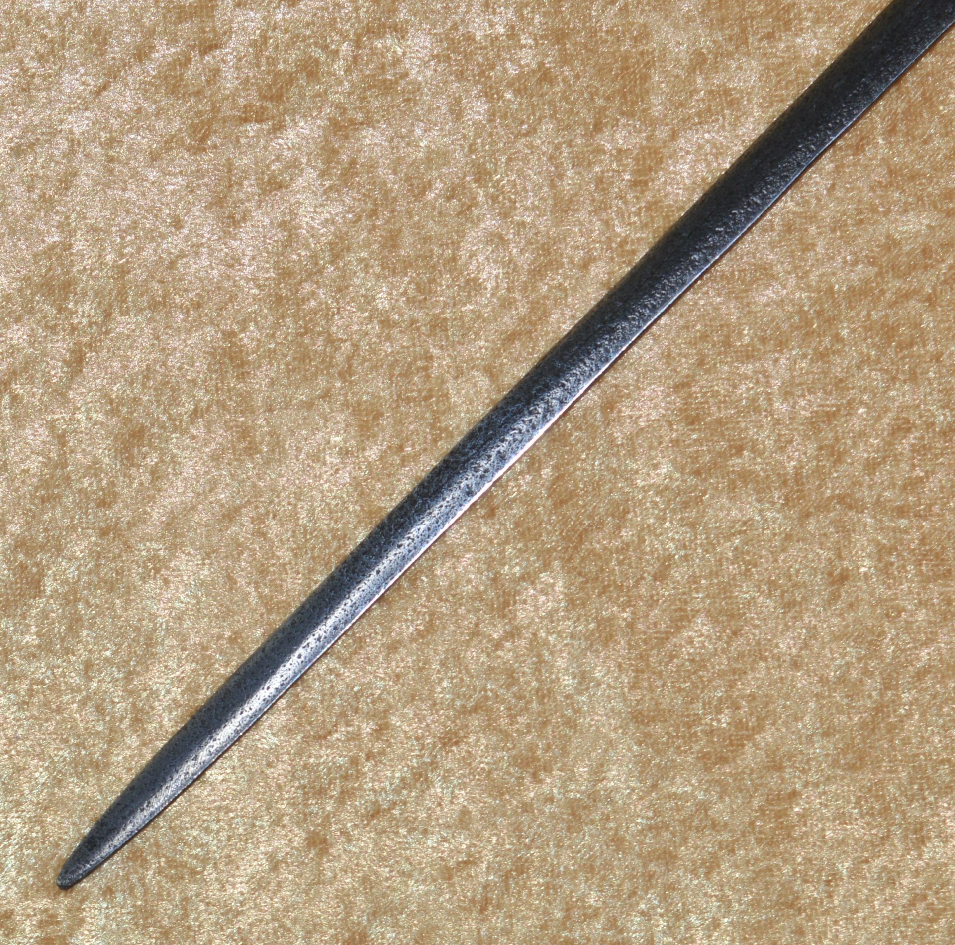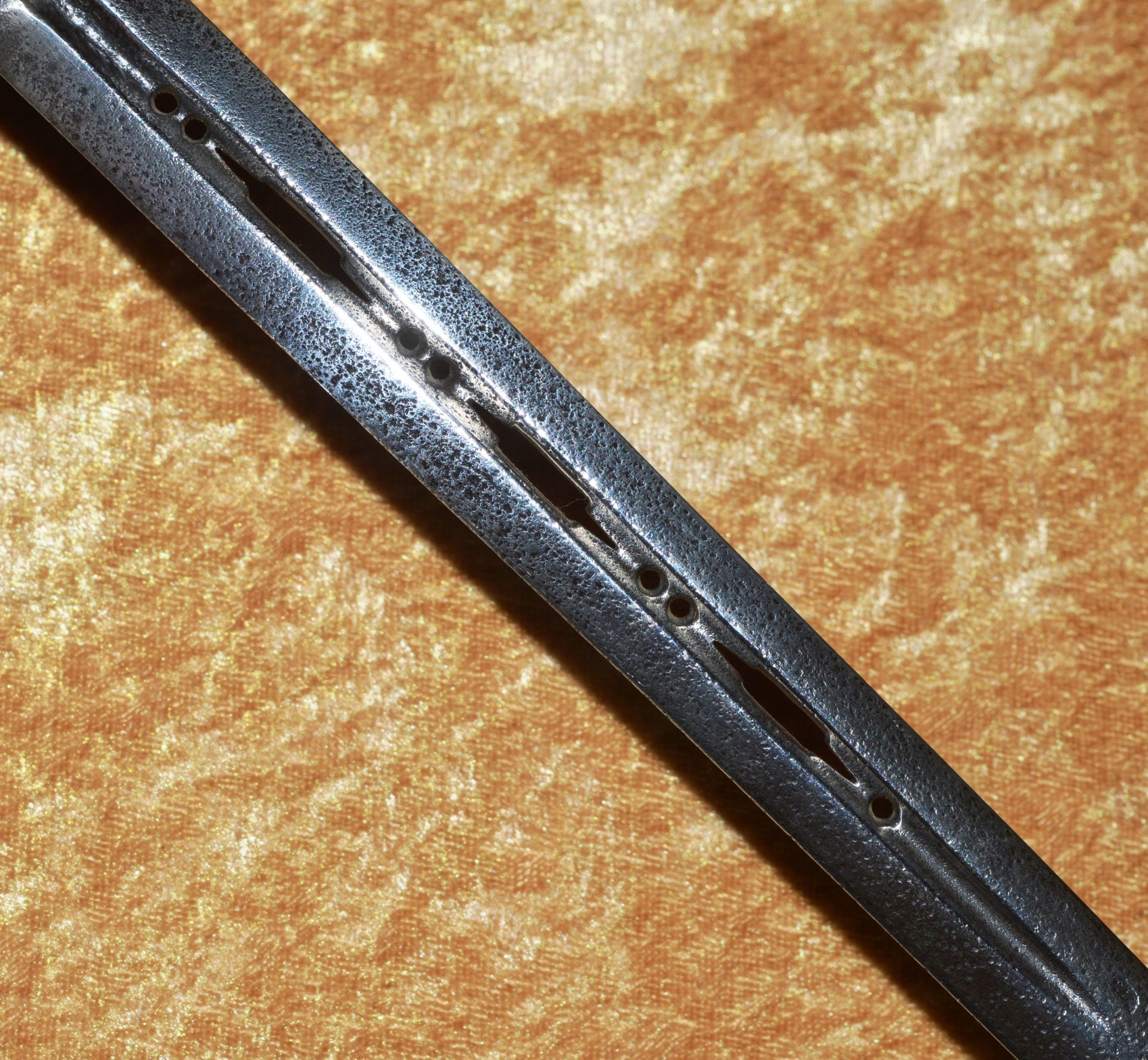 Slender 38 1/2″ (97.8 cm) blade of lens section, with narrow 7″ central fuller pierced with