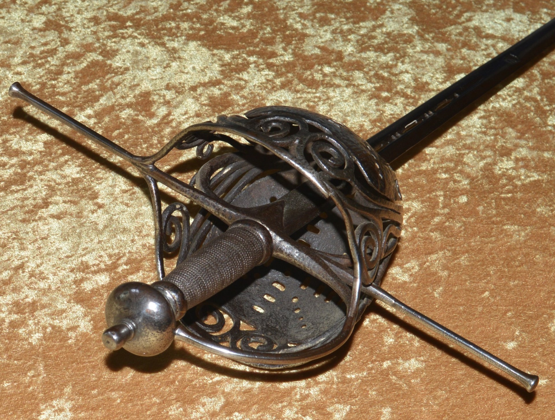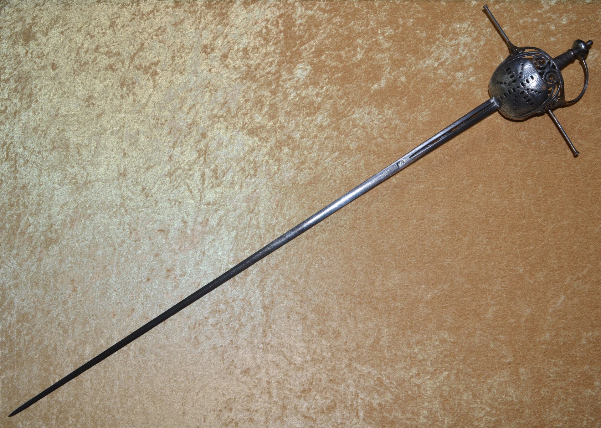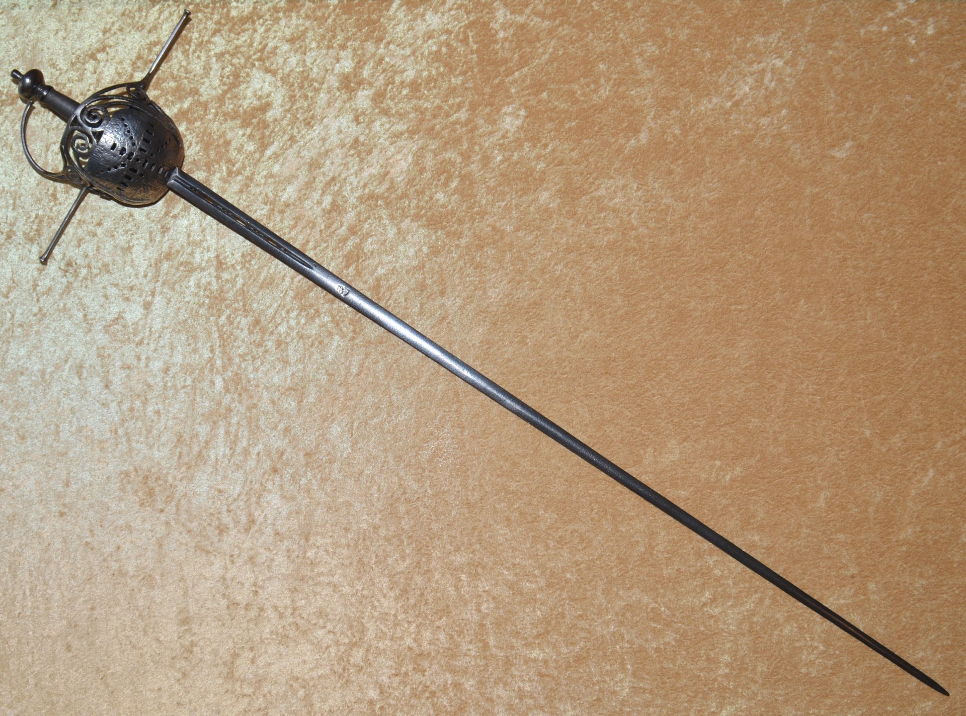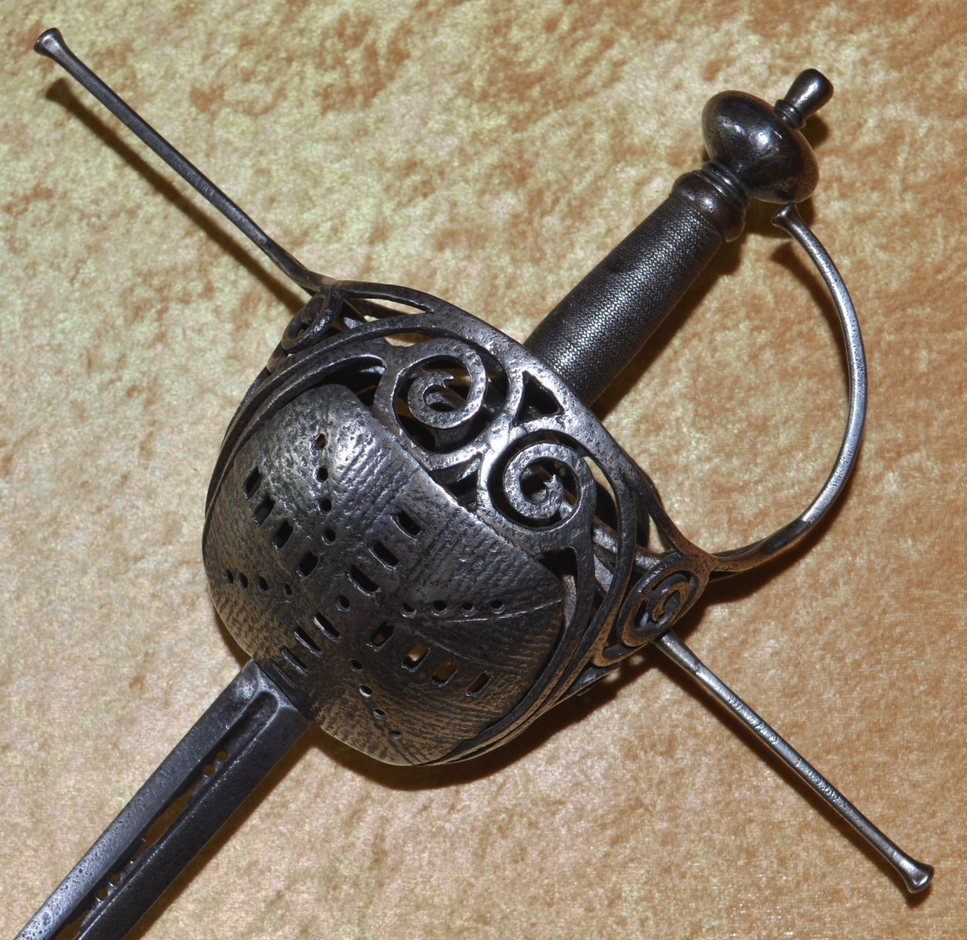 shape joining the long, straight quillons and knuckle bow. Turned byn-shape pommel with