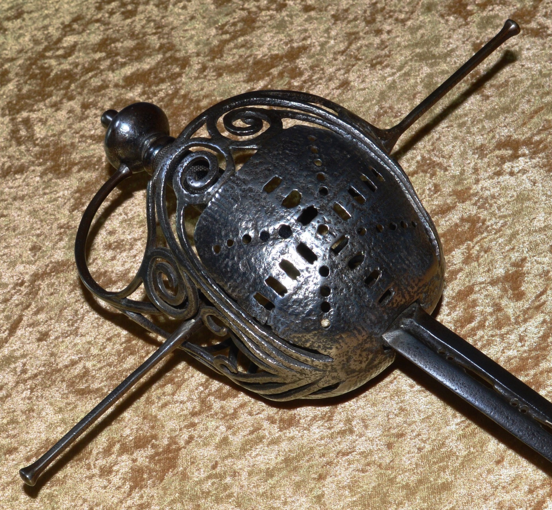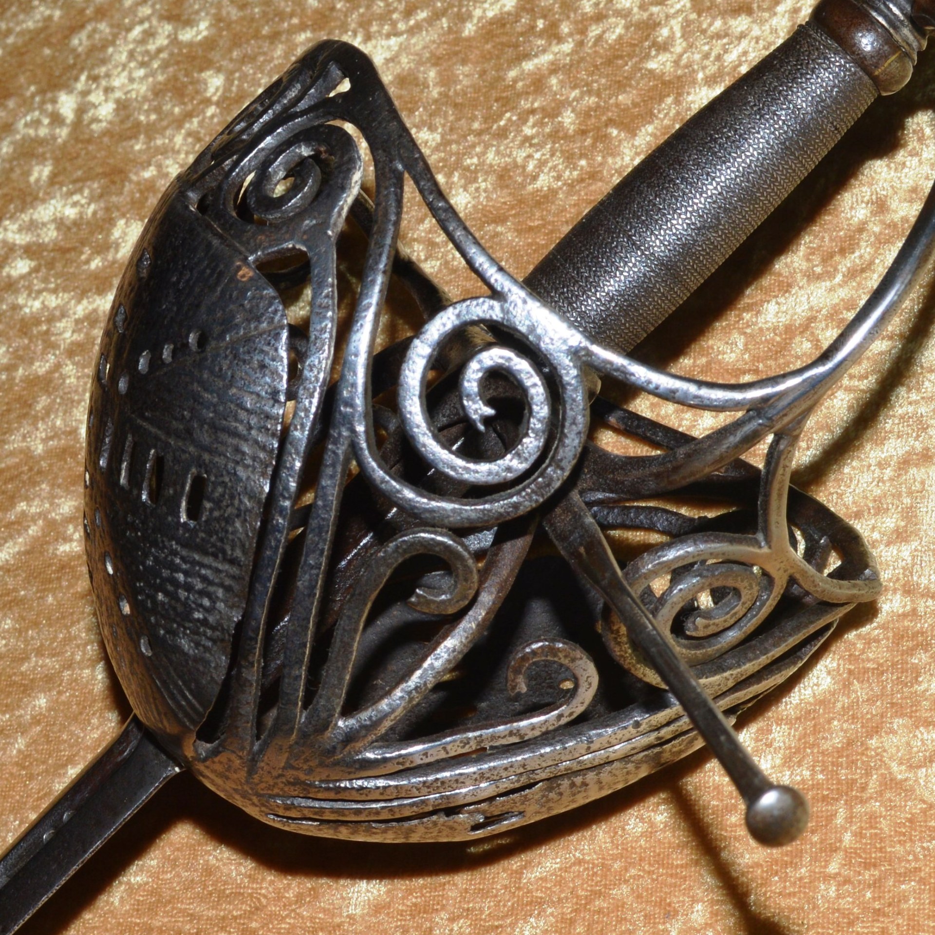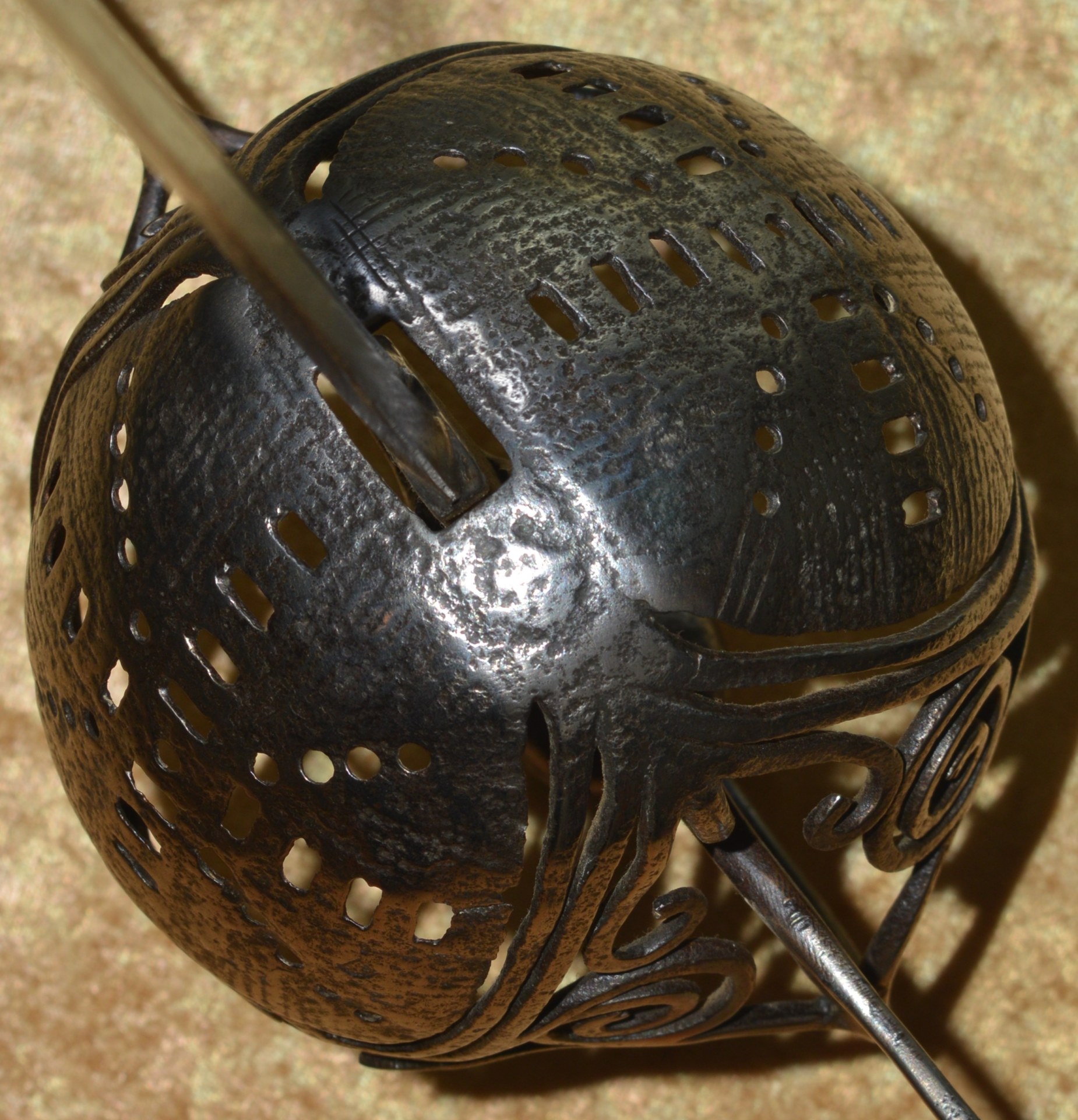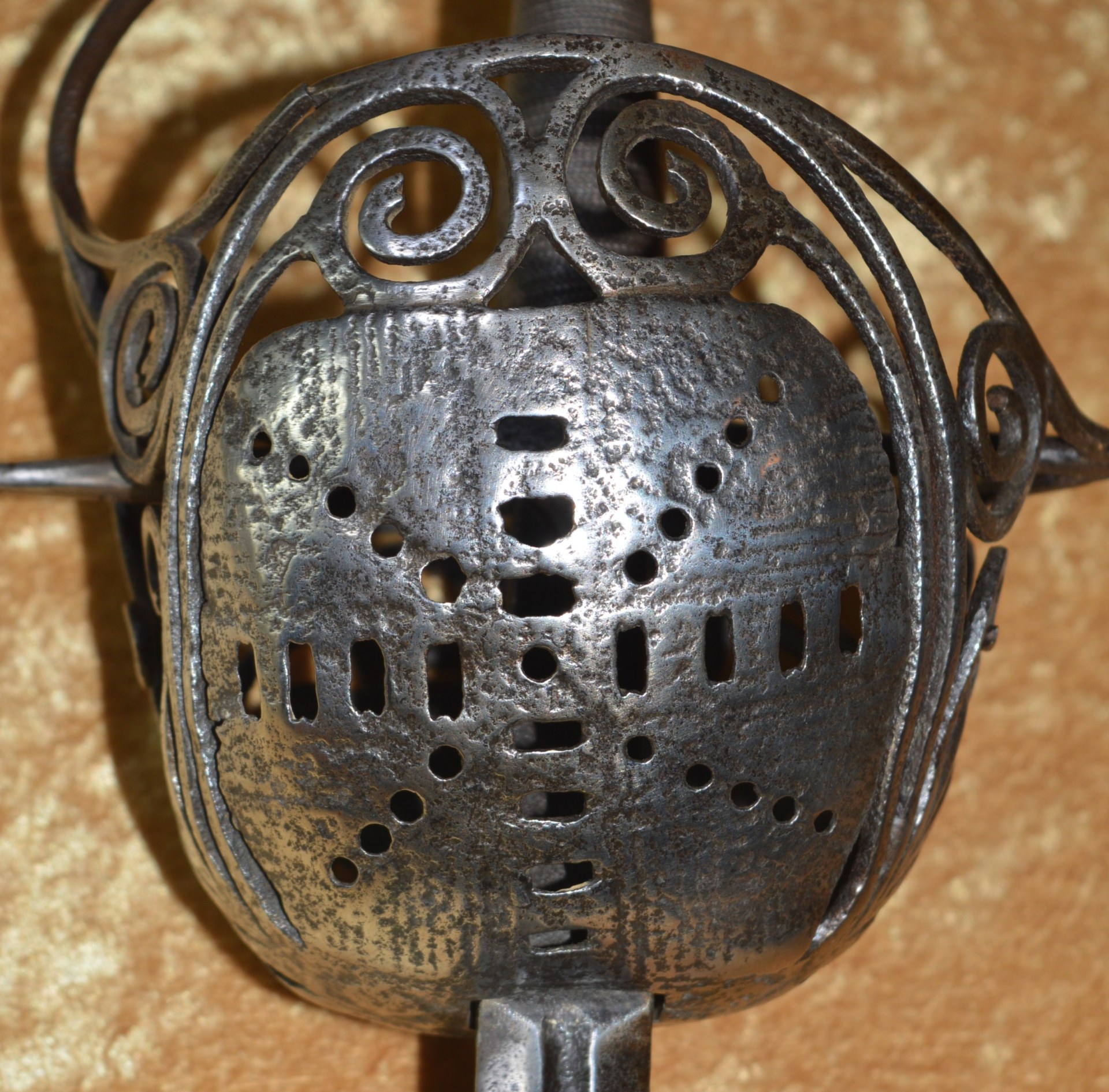 Featuring deep iron cup guard pierced with a series of round holes and rectangles in the
