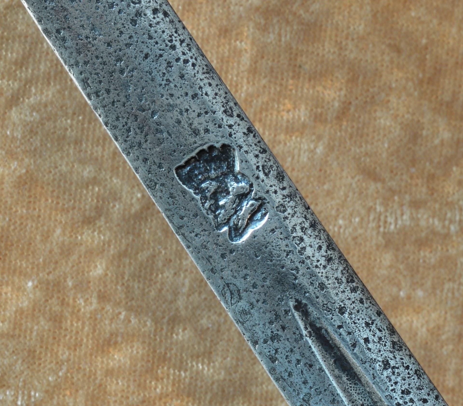 geometric designs; left-facing king’s head maker’s mark deeply stamped below the fuller on