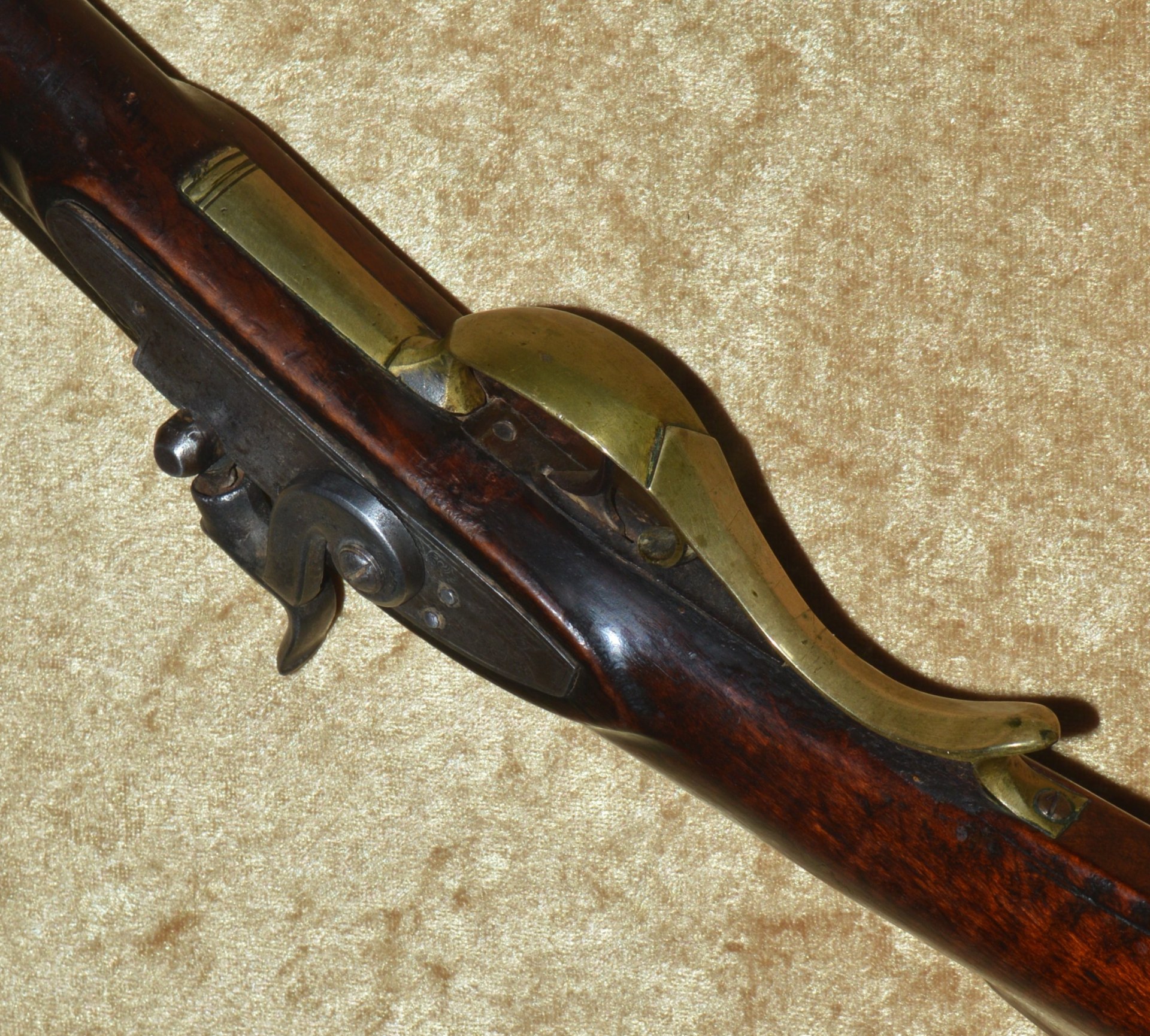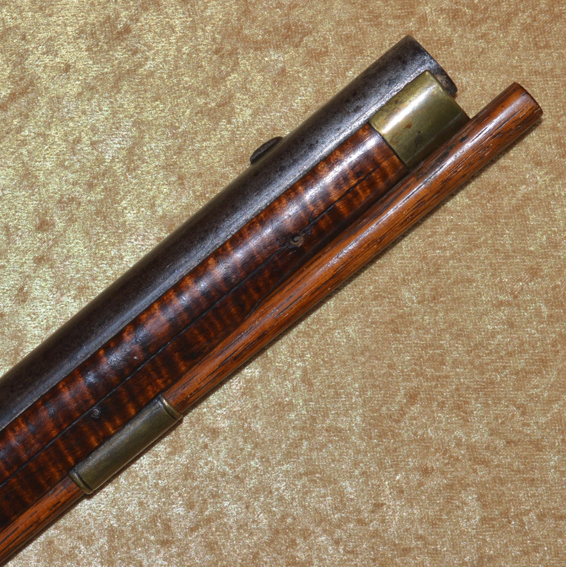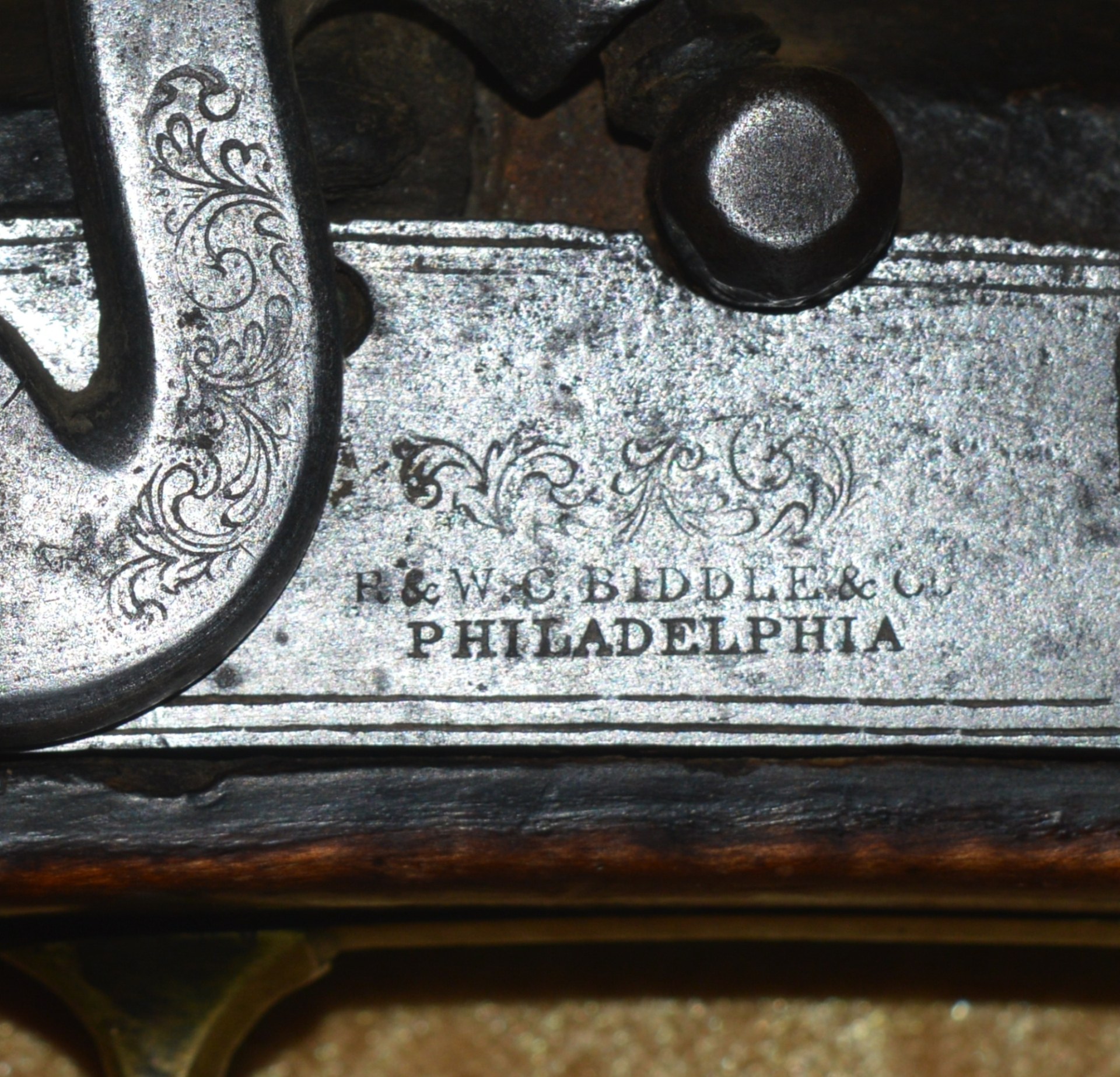 Made by R. & W.C. Biddle of Philadelphia (1855-1861), this rifle features unmarked 45 3/4” octagonal to round barrel of approximately .60 caliber with inlaid brass rear notch sight and front blade sight. Percussion lock with flat lockplate, engraved with scrolling foliage, a hound, double line border, and the name “R. & W.C. BIDDLE & CO./PHILADELPHIA”; hammer engraved ensuite. Lovely tiger striped maple full stock with brass mounts, including trigger guard, butt cap, fore end cap, crescent-shaped side plate, and three ramrod thimbles: wood ramrod. Barrel with dark patina, pitting at the breech, and only traces of rifling remaining; lock with light pitting and wear; stock very good plus, with beautiful dark patina. Overall length 60 1/2” (153.7 cm). Light weight and well-balanced, such pieces were highly accurate and often used by snipers during the Civil War. Beautiful piece to display over the fireplace.