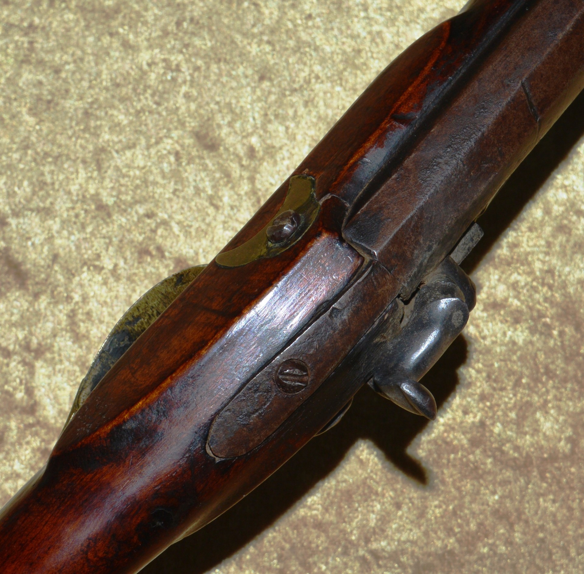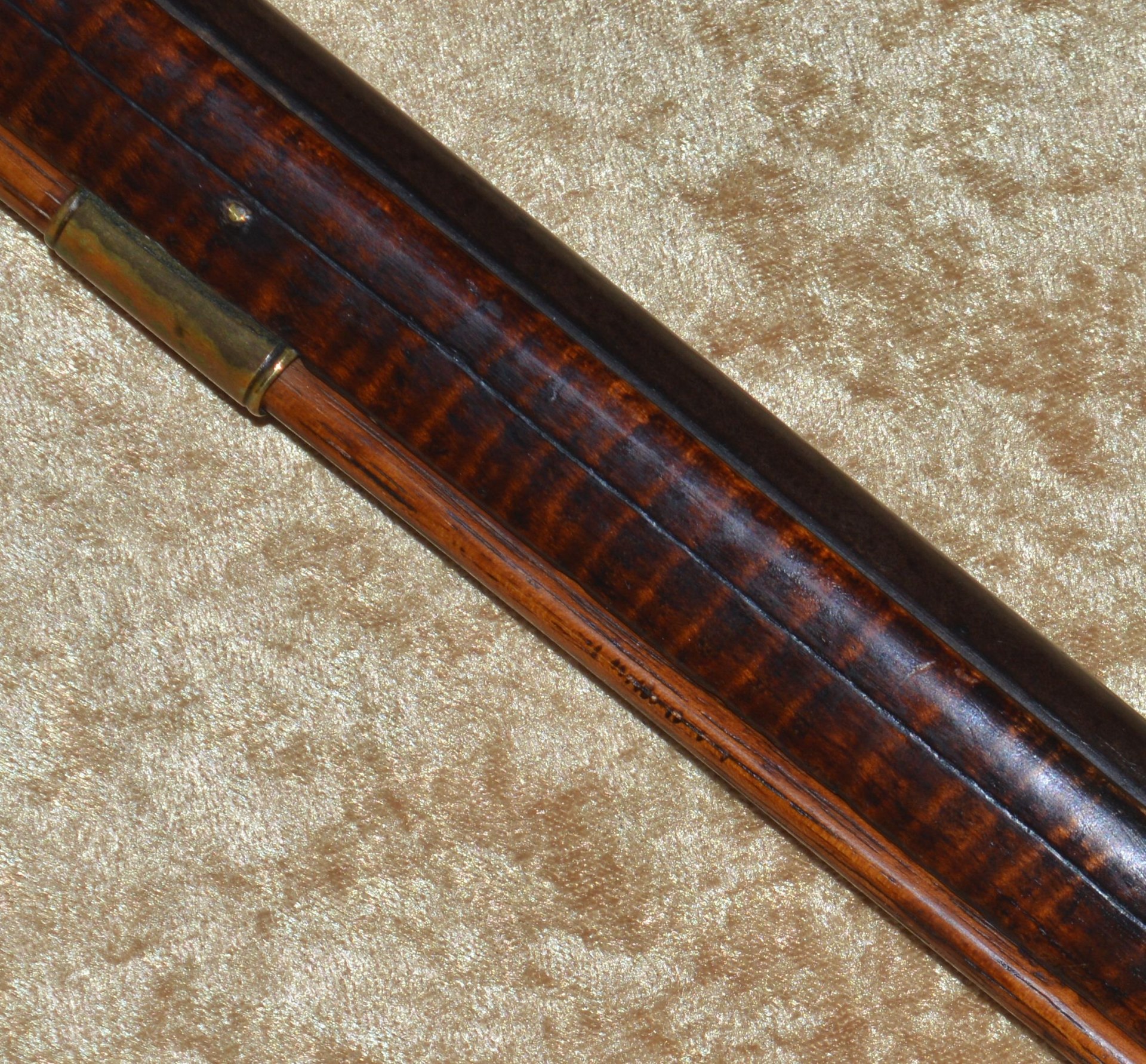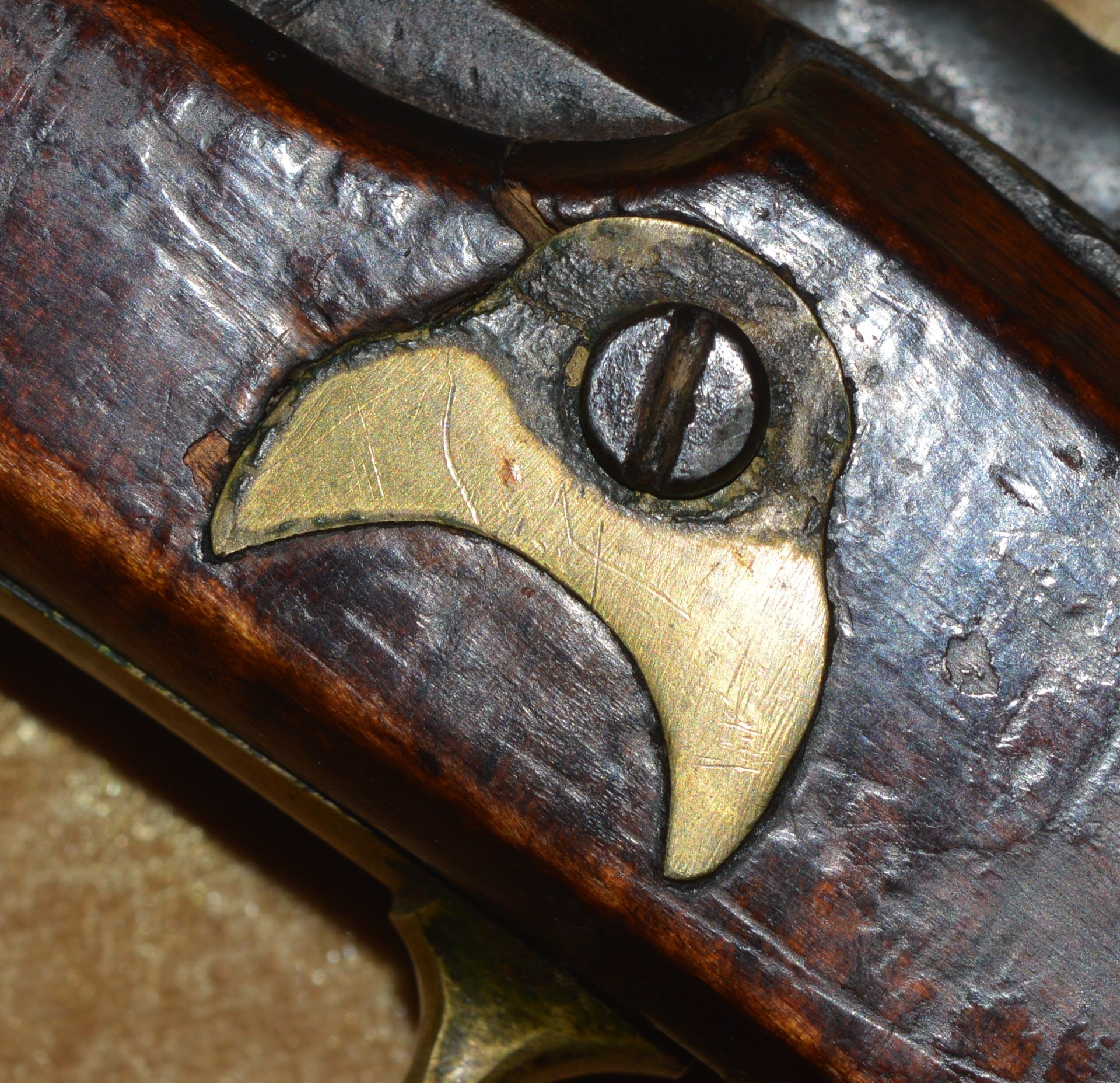 Made by R. & W.C. Biddle of Philadelphia (1855-1861), this rifle features unmarked 45 3/4” octagonal to round barrel of approximately .60 caliber with inlaid brass rear notch sight and front blade sight. Percussion lock with flat lockplate, engraved with scrolling foliage, a hound, double line border, and the name “R. & W.C. BIDDLE & CO./PHILADELPHIA”; hammer engraved ensuite. Lovely tiger striped maple full stock with brass mounts, including trigger guard, butt cap, fore end cap, crescent-shaped side plate, and three ramrod thimbles: wood ramrod. Barrel with dark patina, pitting at the breech, and only traces of rifling remaining; lock with light pitting and wear; stock very good plus, with beautiful dark patina. Overall length 60 1/2” (153.7 cm). Light weight and well-balanced, such pieces were highly accurate and often used by snipers during the Civil War. Beautiful piece to display over the fireplace.