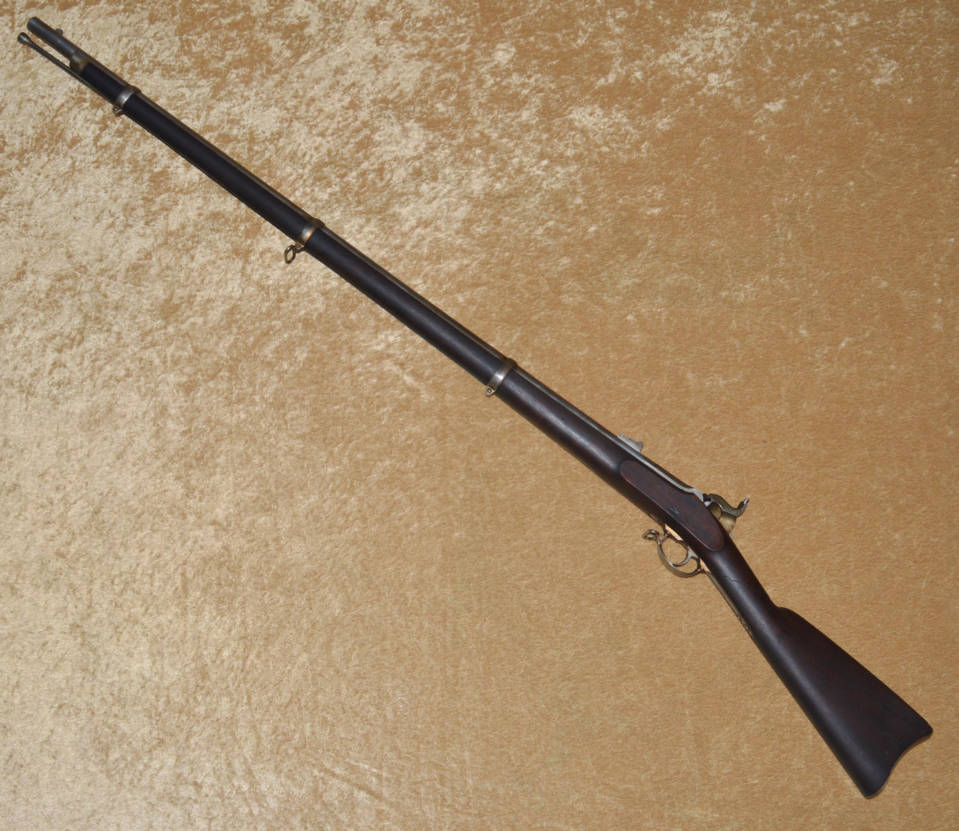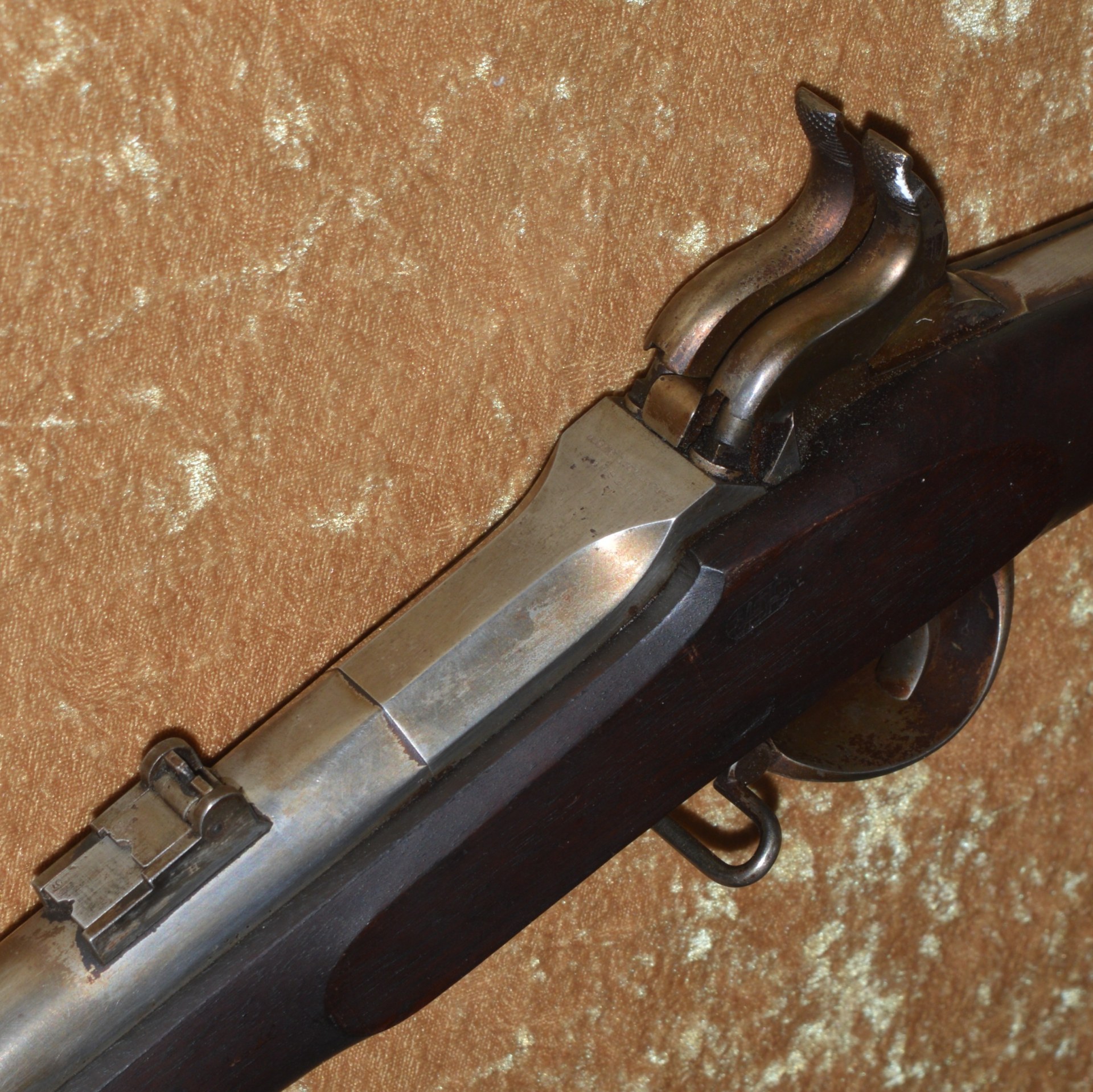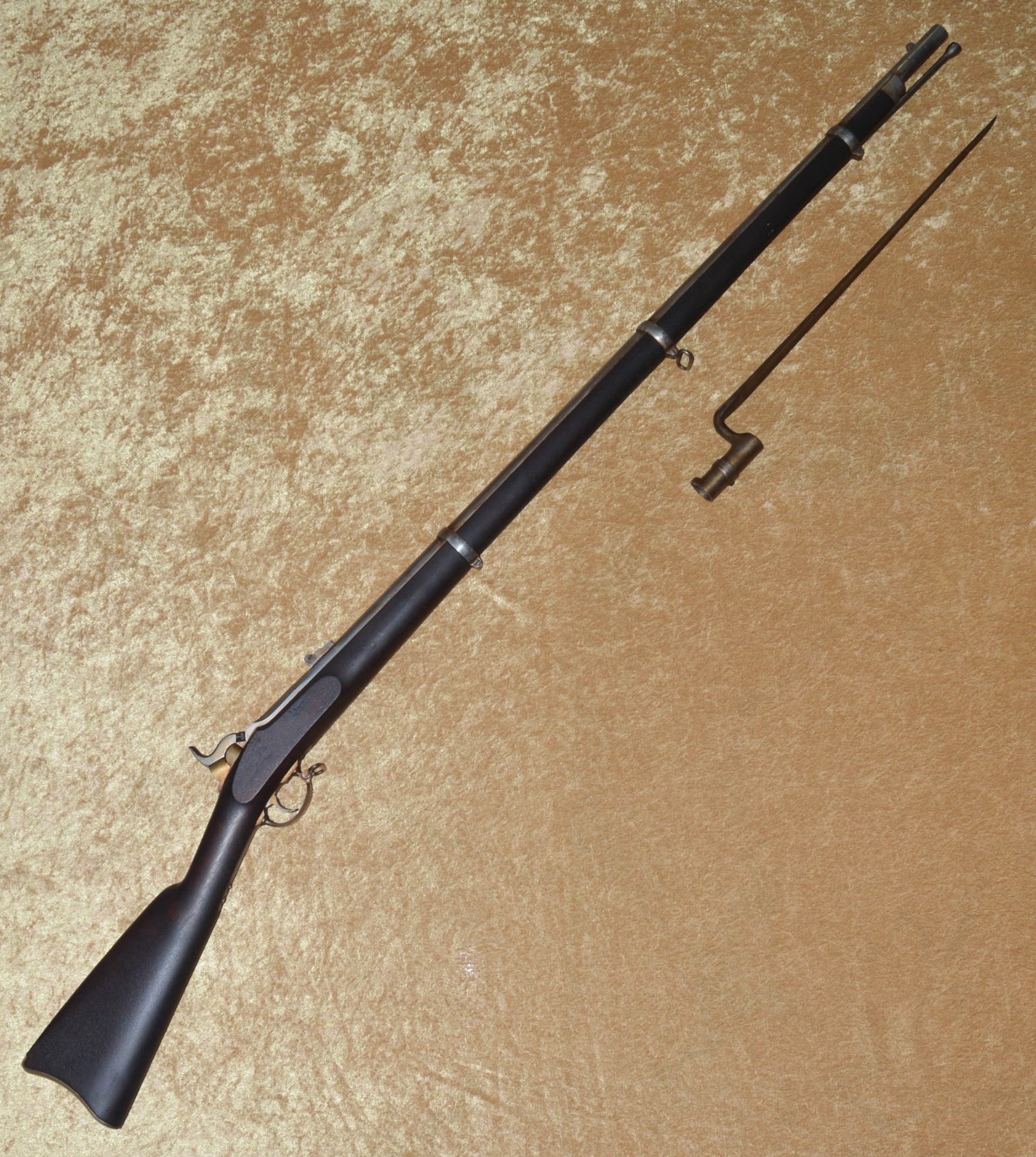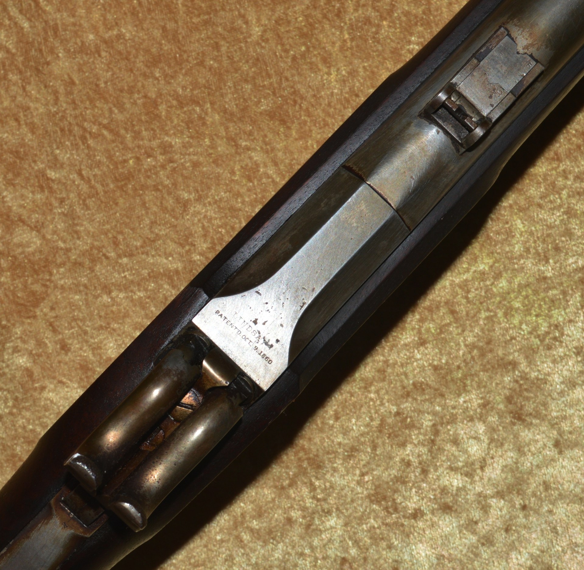 Patented on the eve of the Civil War by J. P. Lindsay in October, 1860, using the same principle as his earlier two-shot percussion pistols, the M1863 Double Rifle Musket was a novel idea, but ultimately proved ineffective in the field. It used a single rifled .58 caliber barrel, with twin hammers and percussion nipples operated by a single trigger to fire superimposed charges, one loaded atop the other. The principle was that the forward-most charge would be fired first, with the rear-most charge firing second. The idea was apparently well-received because the U.S. Ordnance Department contracted for 1,000 of them. In actuality, however, the mechanism proved somewhat involved and often resulted in both charges firing simultaneously, frequently causing damage and/or injury. They were not well received by the units issued them and ultimately their use was abandoned. It features a 41 1/8” round barrel with semi-octagonal breech stamped “LINDSAY/PATENT’D OCT. 9. 1860”; with 3-position folding rear sight and front blade sight that doubles as a bayonet lug. Rather than having a traditional lock and lockplate set in from the right side of the stock, the firing mechanism drops into a mortise from the top and is not exposed from the side. This made servicing the weapon more difficult than traditional muskets. Walnut full stock with two stamped ADK inspector cartouches (Andrew D. King) on the left flat and iron mounts, including 3 barrel bands, fore end cap, ramrod, and butt plate. Sling swivels mounted on the front of the trigger guard and middle barrel band. Included is an original angular socket bayonet, stamped “US” at the base of the blade. Overall length 56”. Metal is smooth and mostly bright, with remains of an old layer of grease. Walnut stock shows minor handling marks, but the left side has a crack running from the rear of the trigger guard to the back of the mechanism tang (not visible from the right side). This was possibly caused by both charges firing simultaneously.