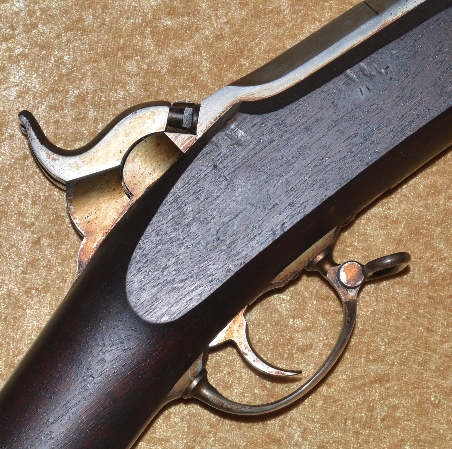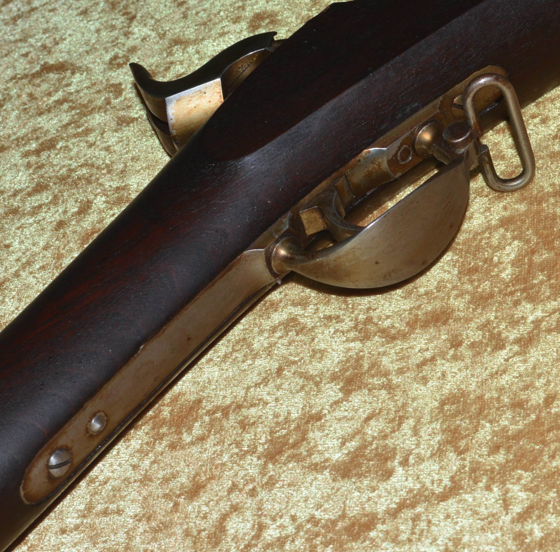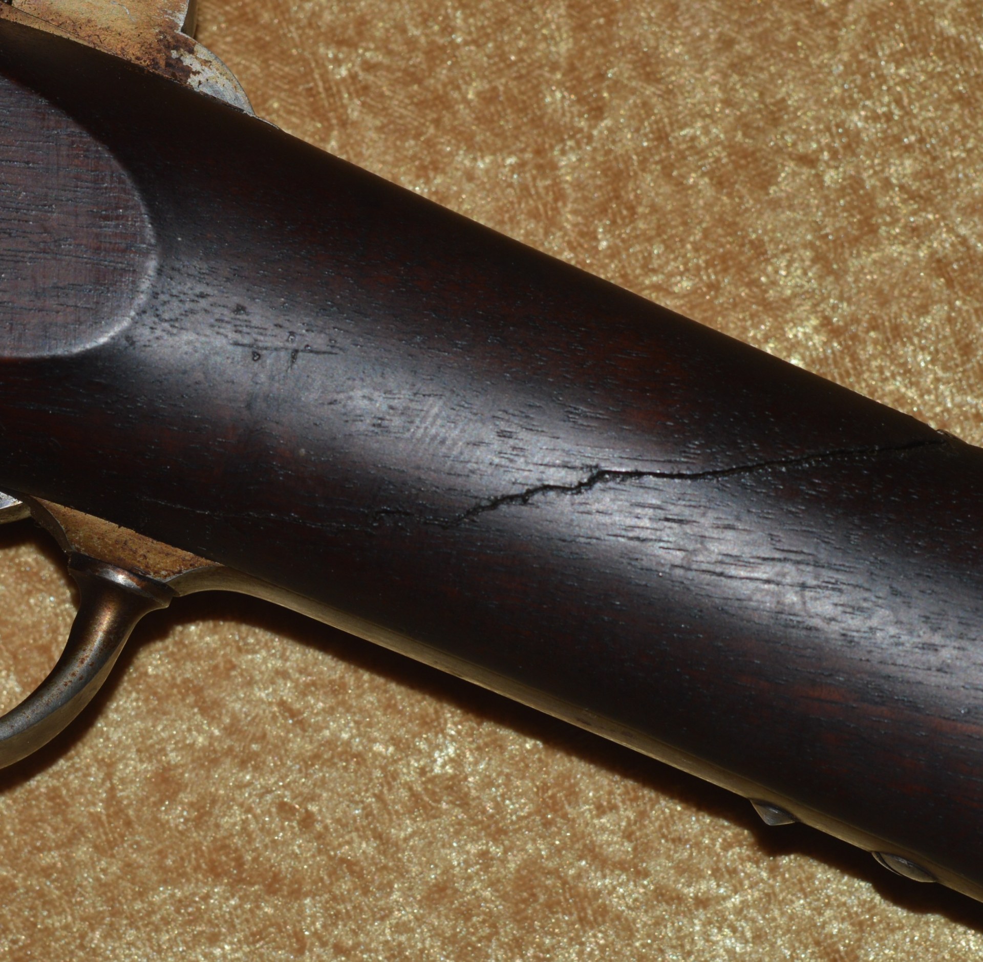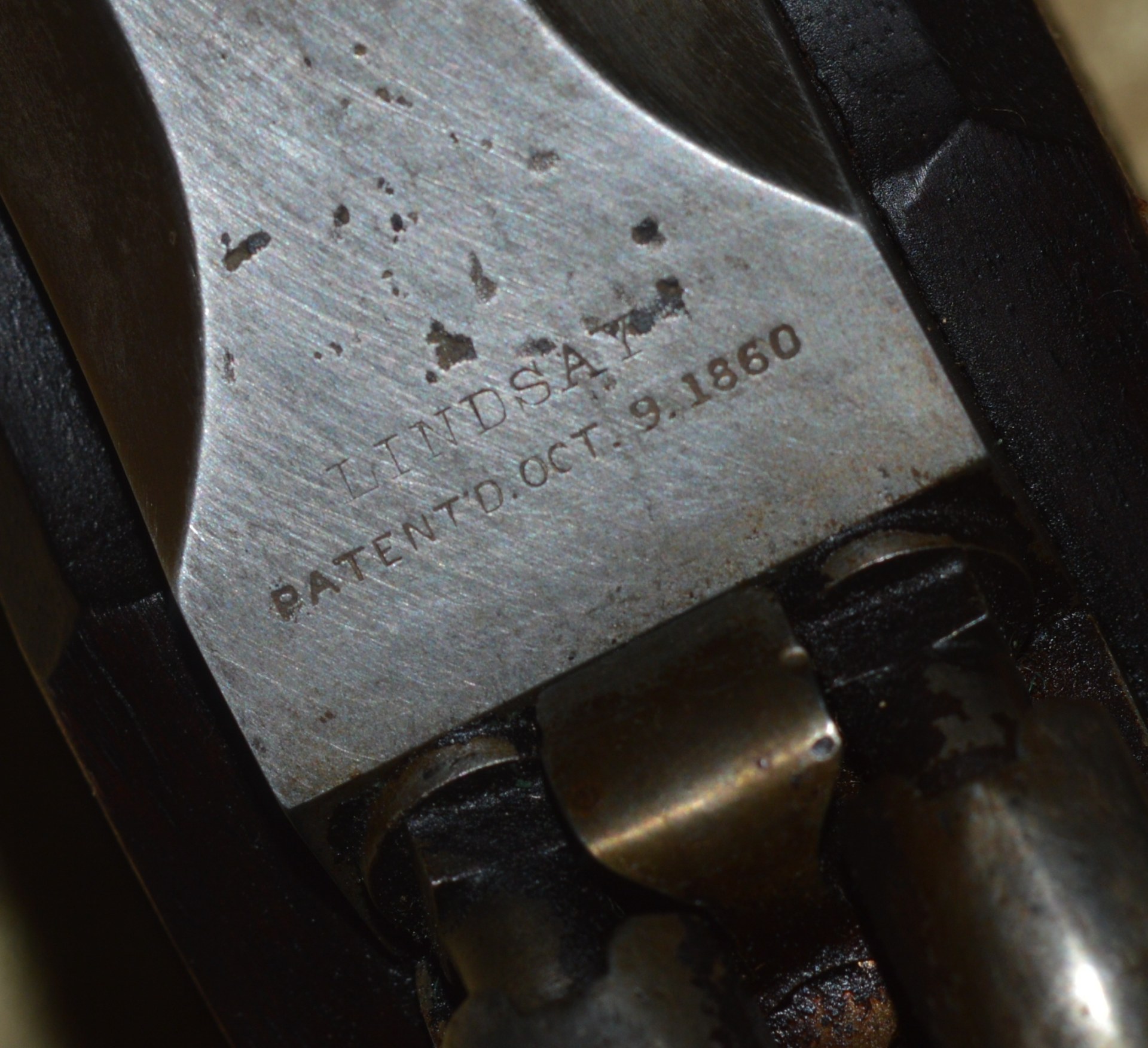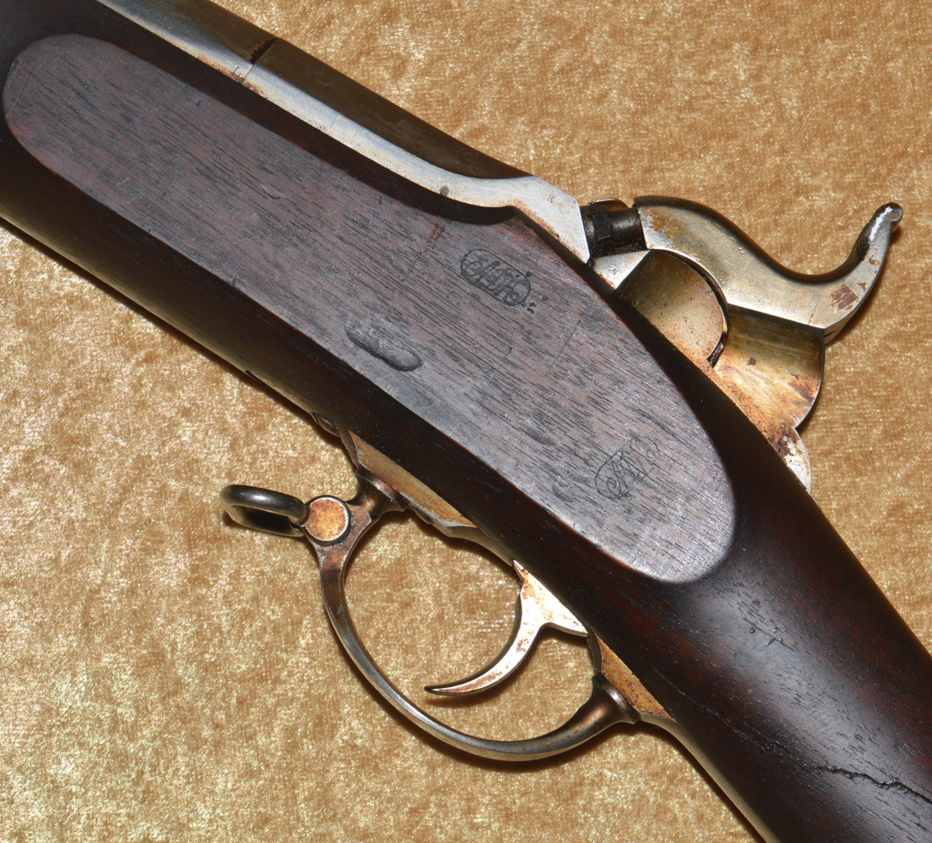 Patented on the eve of the Civil War by J. P. Lindsay in October, 1860, using the same principle as his earlier two-shot percussion pistols, the M1863 Double Rifle Musket was a novel idea, but ultimately proved ineffective in the field. It used a single rifled .58 caliber barrel, with twin hammers and percussion nipples operated by a single trigger to fire superimposed charges, one loaded atop the other. The principle was that the forward-most charge would be fired first, with the rear-most charge firing second. The idea was apparently well-received because the U.S. Ordnance Department contracted for 1,000 of them. In actuality, however, the mechanism proved somewhat involved and often resulted in both charges firing simultaneously, frequently causing damage and/or injury. They were not well received by the units issued them and ultimately their use was abandoned. It features a 41 1/8” round barrel with semi-octagonal breech stamped “LINDSAY/PATENT’D OCT. 9. 1860”; with 3-position folding rear sight and front blade sight that doubles as a bayonet lug. Rather than having a traditional lock and lockplate set in from the right side of the stock, the firing mechanism drops into a mortise from the top and is not exposed from the side. This made servicing the weapon more difficult than traditional muskets. Walnut full stock with two stamped ADK inspector cartouches (Andrew D. King) on the left flat and iron mounts, including 3 barrel bands, fore end cap, ramrod, and butt plate. Sling swivels mounted on the front of the trigger guard and middle barrel band. Included is an original angular socket bayonet, stamped “US” at the base of the blade. Overall length 56”. Metal is smooth and mostly bright, with remains of an old layer of grease. Walnut stock shows minor handling marks, but the left side has a crack running from the rear of the trigger guard to the back of the mechanism tang (not visible from the right side). This was possibly caused by both charges firing simultaneously.