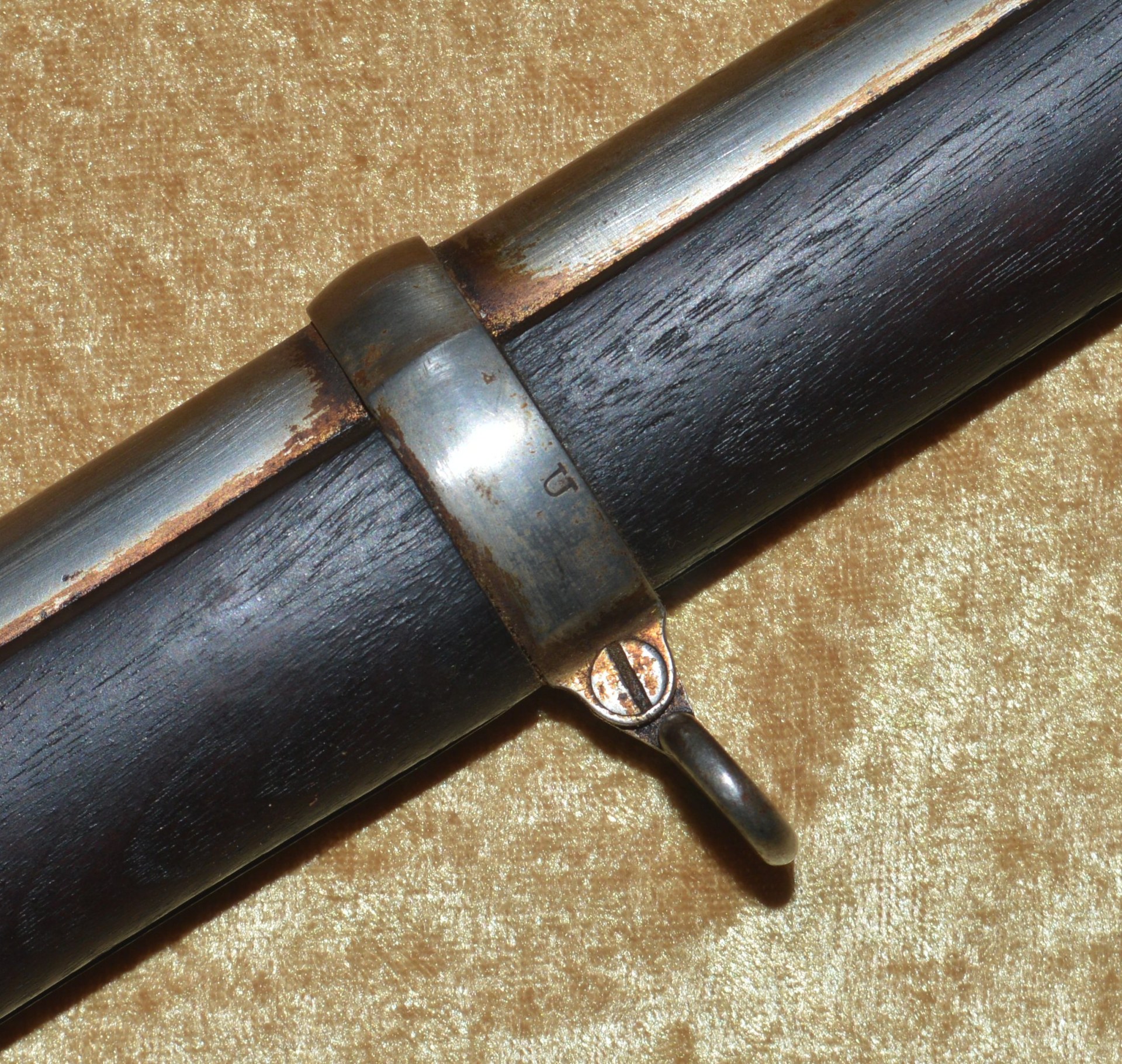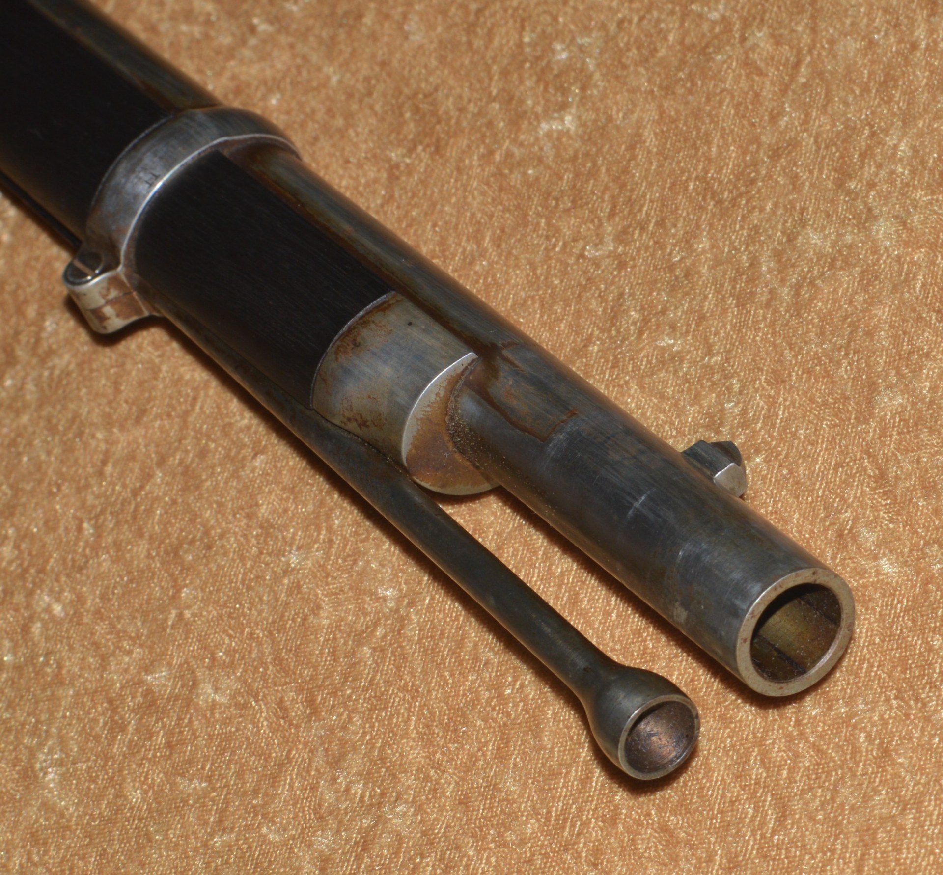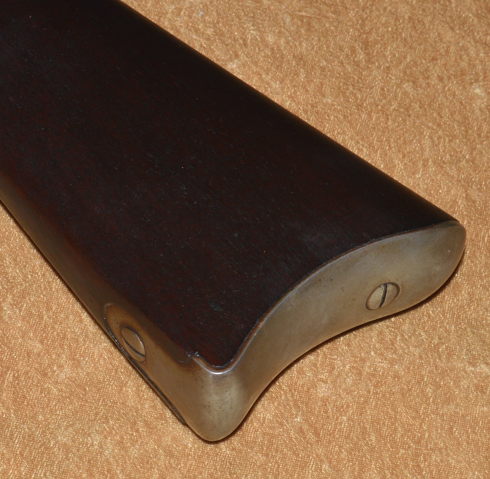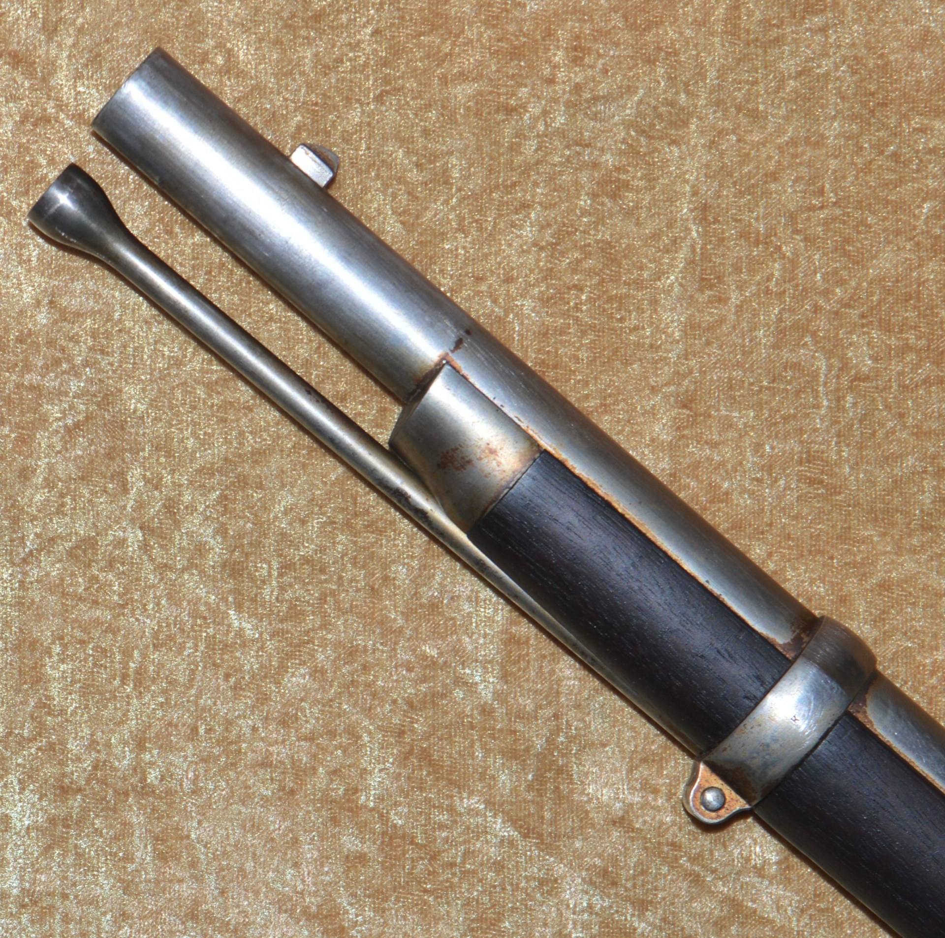 Patented on the eve of the Civil War by J. P. Lindsay in October, 1860, using the same principle as his earlier two-shot percussion pistols, the M1863 Double Rifle Musket was a novel idea, but ultimately proved ineffective in the field. It used a single rifled .58 caliber barrel, with twin hammers and percussion nipples operated by a single trigger to fire superimposed charges, one loaded atop the other. The principle was that the forward-most charge would be fired first, with the rear-most charge firing second. The idea was apparently well-received because the U.S. Ordnance Department contracted for 1,000 of them. In actuality, however, the mechanism proved somewhat involved and often resulted in both charges firing simultaneously, frequently causing damage and/or injury. They were not well received by the units issued them and ultimately their use was abandoned. It features a 41 1/8” round barrel with semi-octagonal breech stamped “LINDSAY/PATENT’D OCT. 9. 1860”; with 3-position folding rear sight and front blade sight that doubles as a bayonet lug. Rather than having a traditional lock and lockplate set in from the right side of the stock, the firing mechanism drops into a mortise from the top and is not exposed from the side. This made servicing the weapon more difficult than traditional muskets. Walnut full stock with two stamped ADK inspector cartouches (Andrew D. King) on the left flat and iron mounts, including 3 barrel bands, fore end cap, ramrod, and butt plate. Sling swivels mounted on the front of the trigger guard and middle barrel band. Included is an original angular socket bayonet, stamped “US” at the base of the blade. Overall length 56”. Metal is smooth and mostly bright, with remains of an old layer of grease. Walnut stock shows minor handling marks, but the left side has a crack running from the rear of the trigger guard to the back of the mechanism tang (not visible from the right side). This was possibly caused by both charges firing simultaneously.