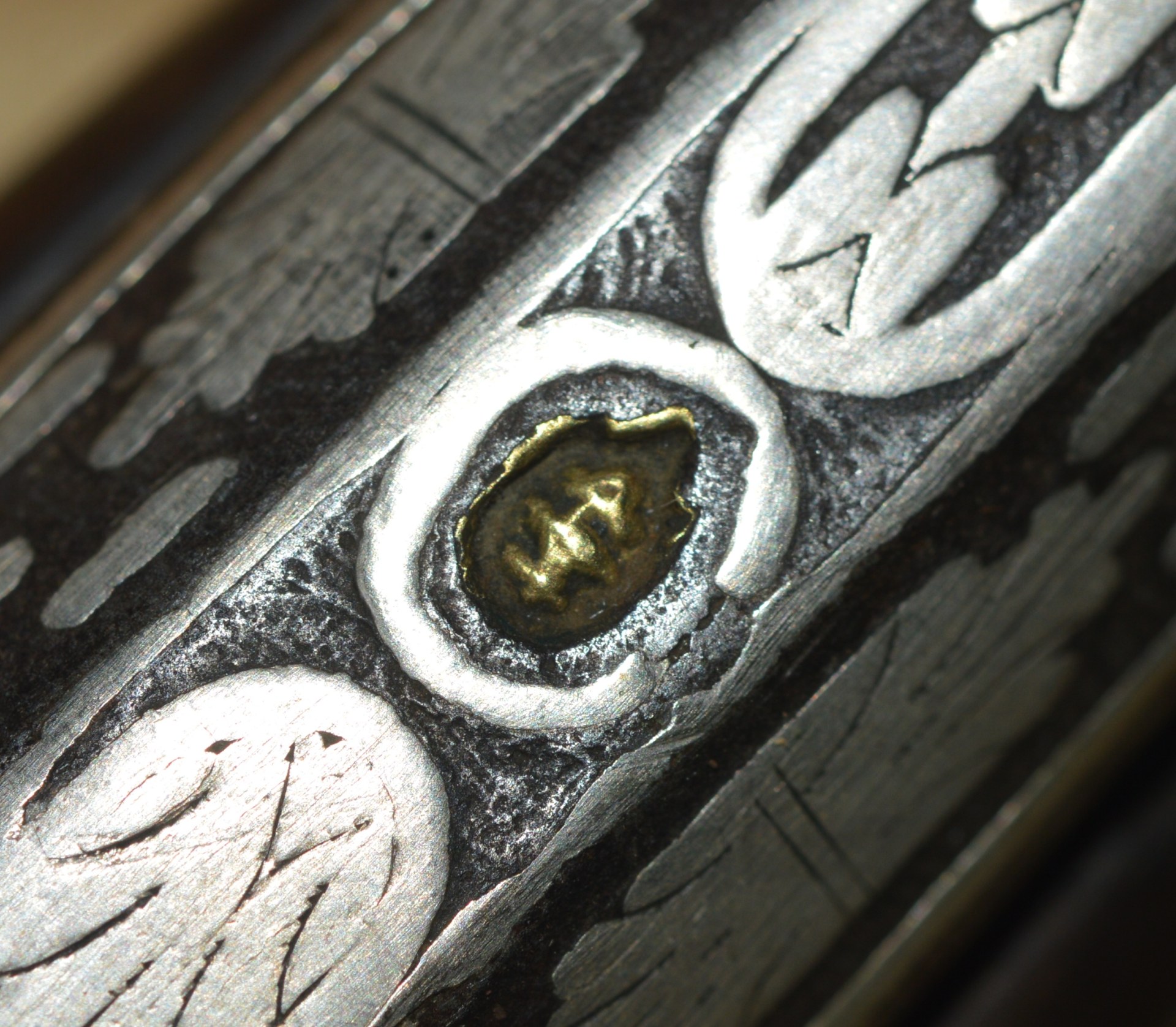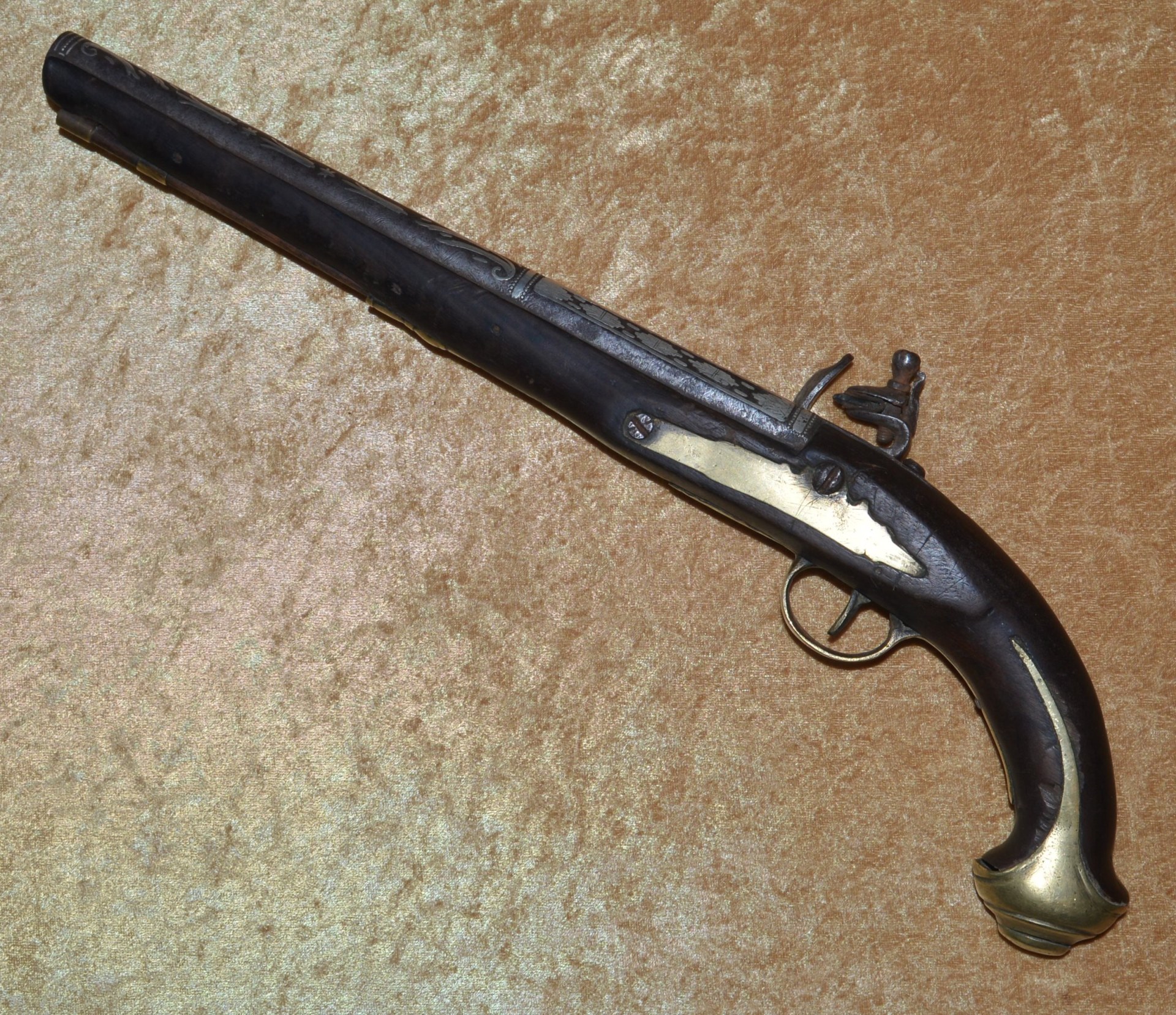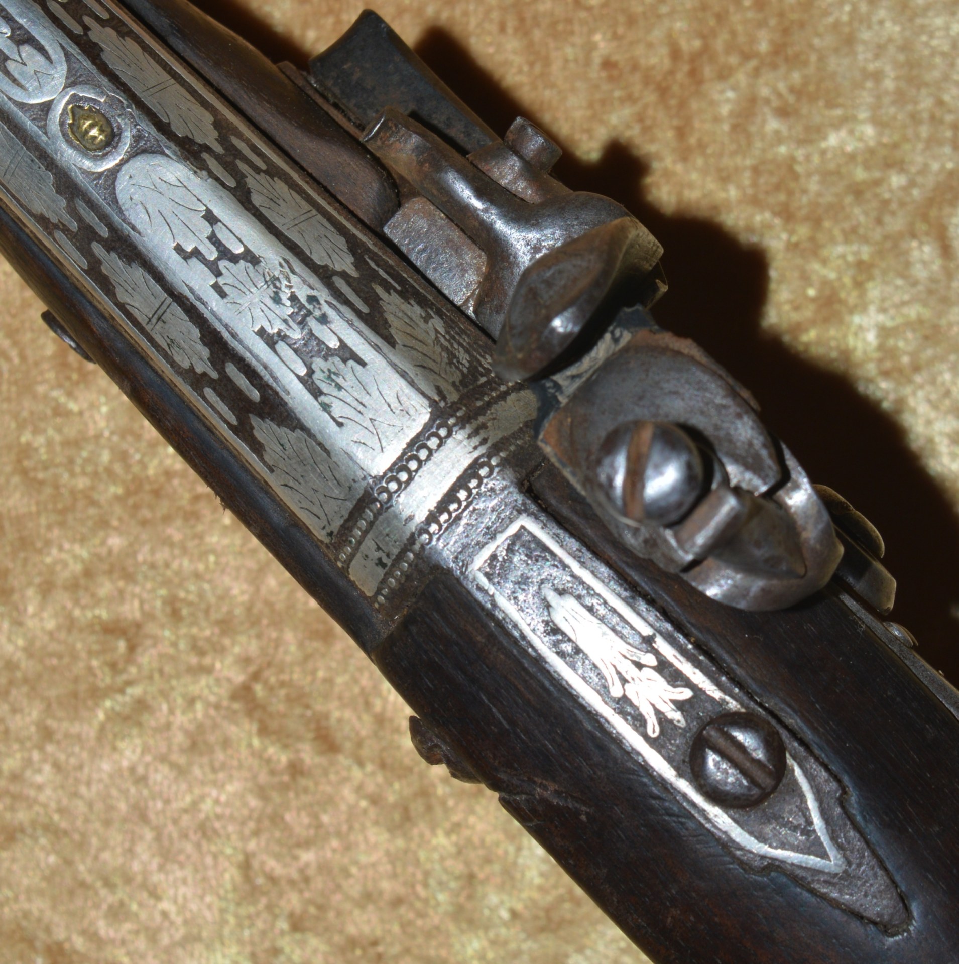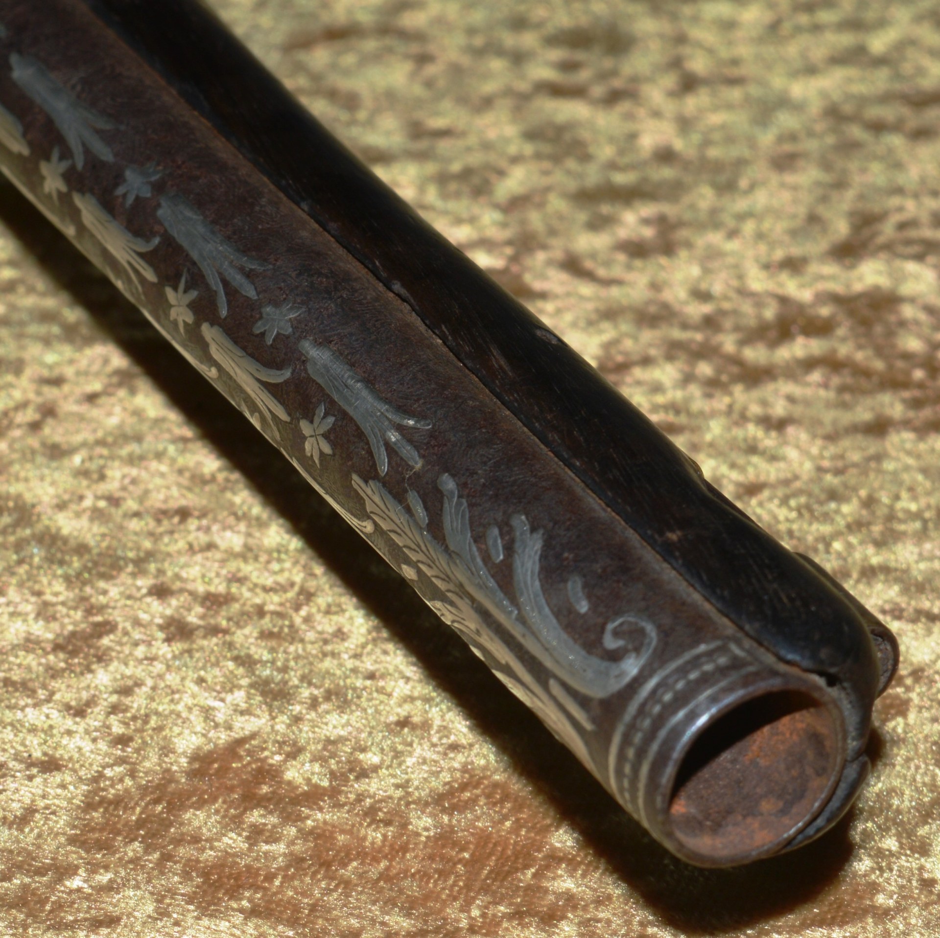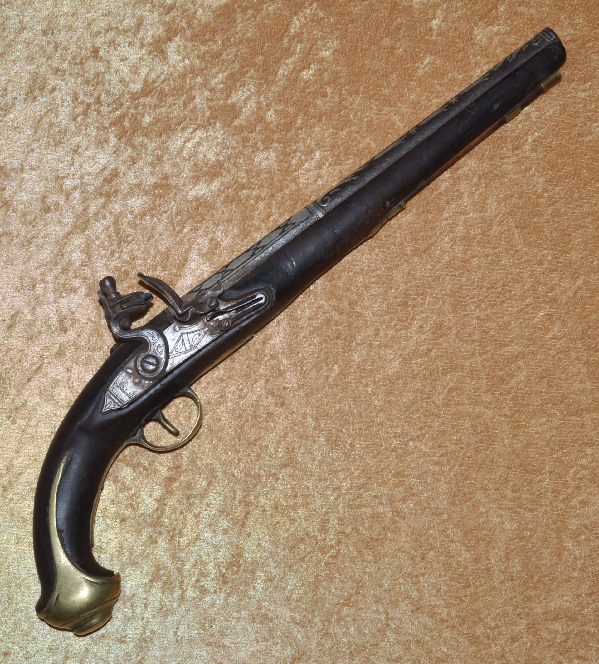 approximately .58 caliber, with false Damascus pattern and latten inlaid maker’s mark; the