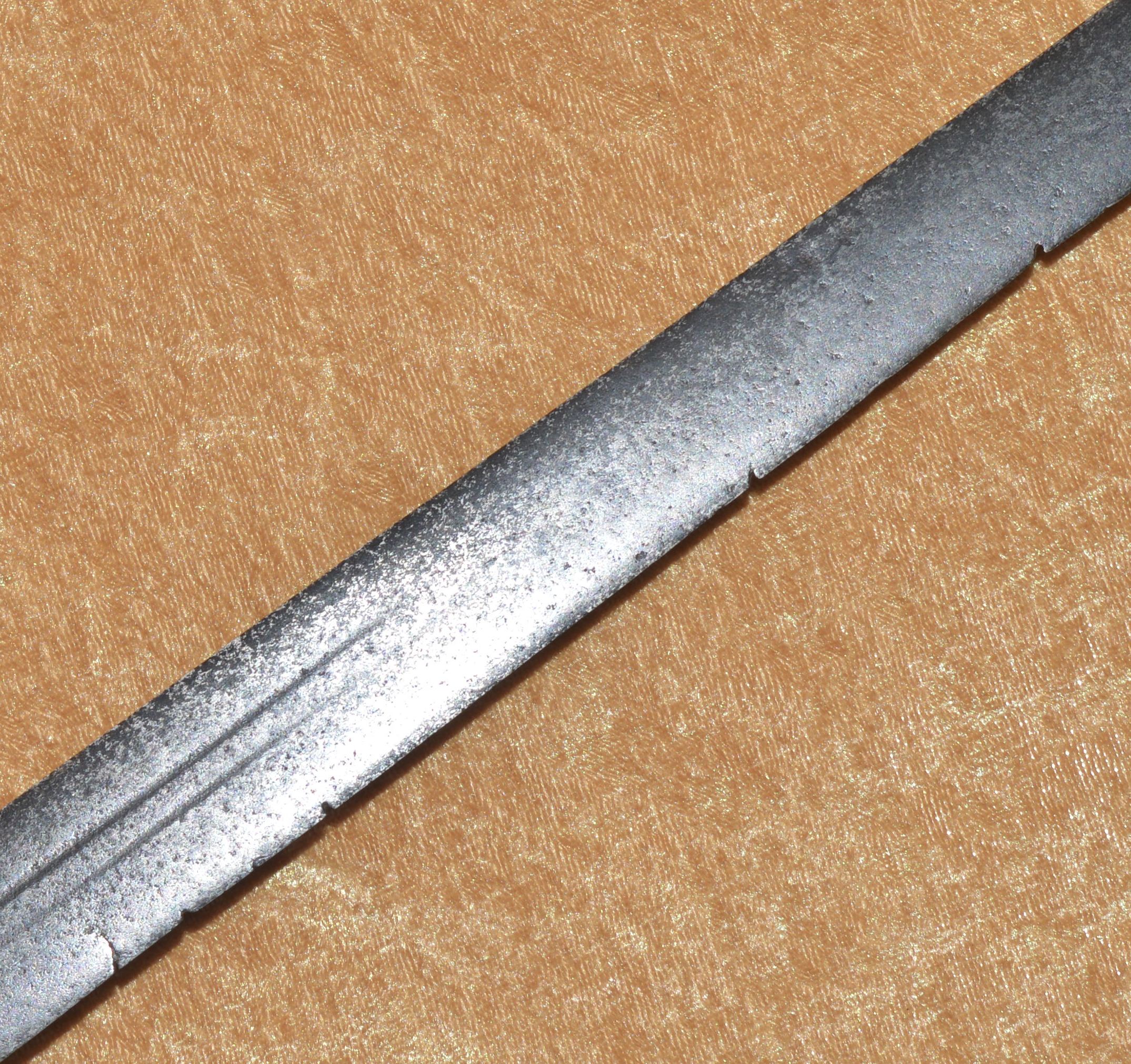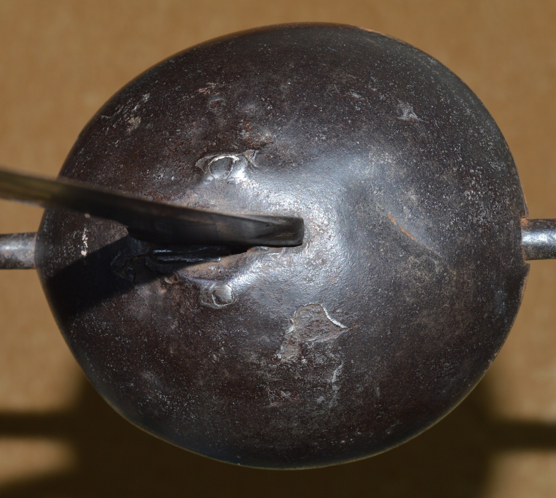 The bilbo was a type of cup-hilted sword carried primarily by the Spanish and Portuguese from the 17th to the 19th Centuries, and thought to be a favorite weapon of pirates. It’s heyday covered the era of the Golden Age of Piracy. This example featuring plain hemispherical cup guard; thick, straight quillons with ball finials; integrally forged knuckle bow joining the base of the small capstan pommel with a ring fitting over the blade tang. Original bulbous wood grip with incised vertical lines and iron base ferrule, split through and held together with brass wire at the top. Tapering 25 1/4” (64 cm) double-edged blade of lens section with three shallow fullers (worn). Blade with signs of significant use, showing evidence of multiple sharpenings and a number of edge nicks from blade strikes. The relatively short blade of this sword is designed for the close quarters fighting aboard ship. Metal with dark patina and scattered pitting; cup with dents and forging flaws (see photo). Overall length 31” (78.4 cm). Formerly in the War Museum Collection, this exact sword is pictured in TREASURES OF THE CARIBBEAN”, by Rodney Hilton Brown, on page 313.