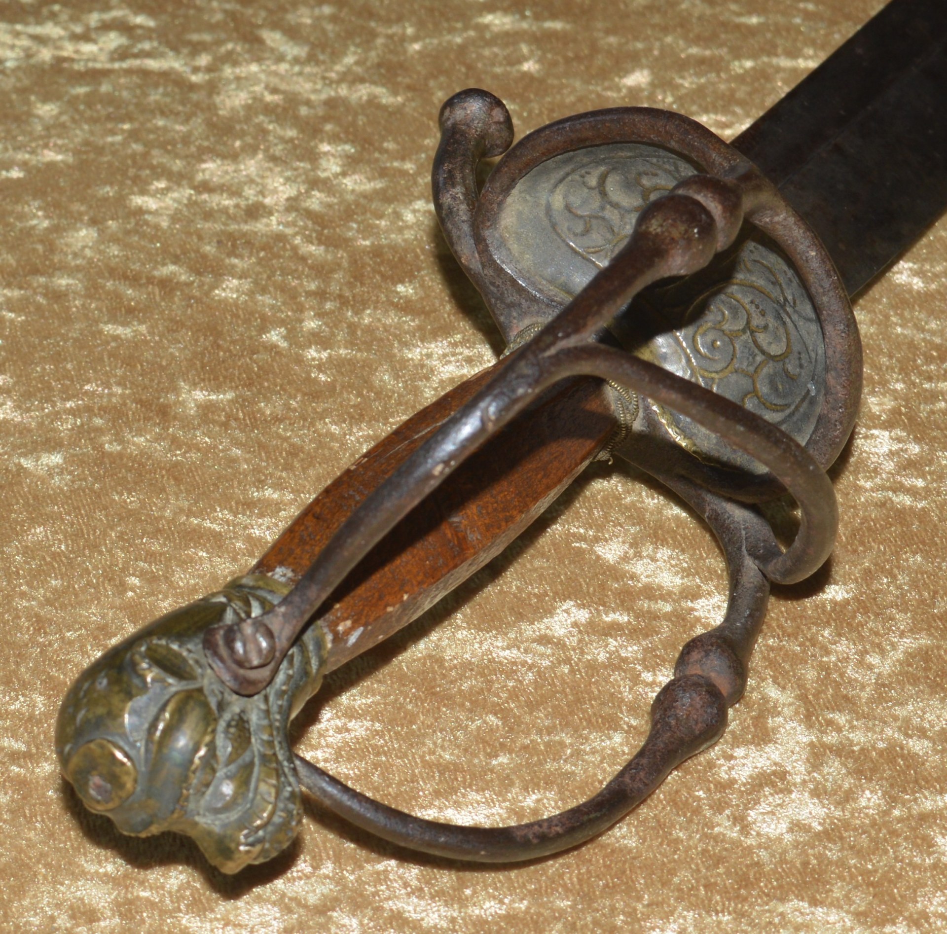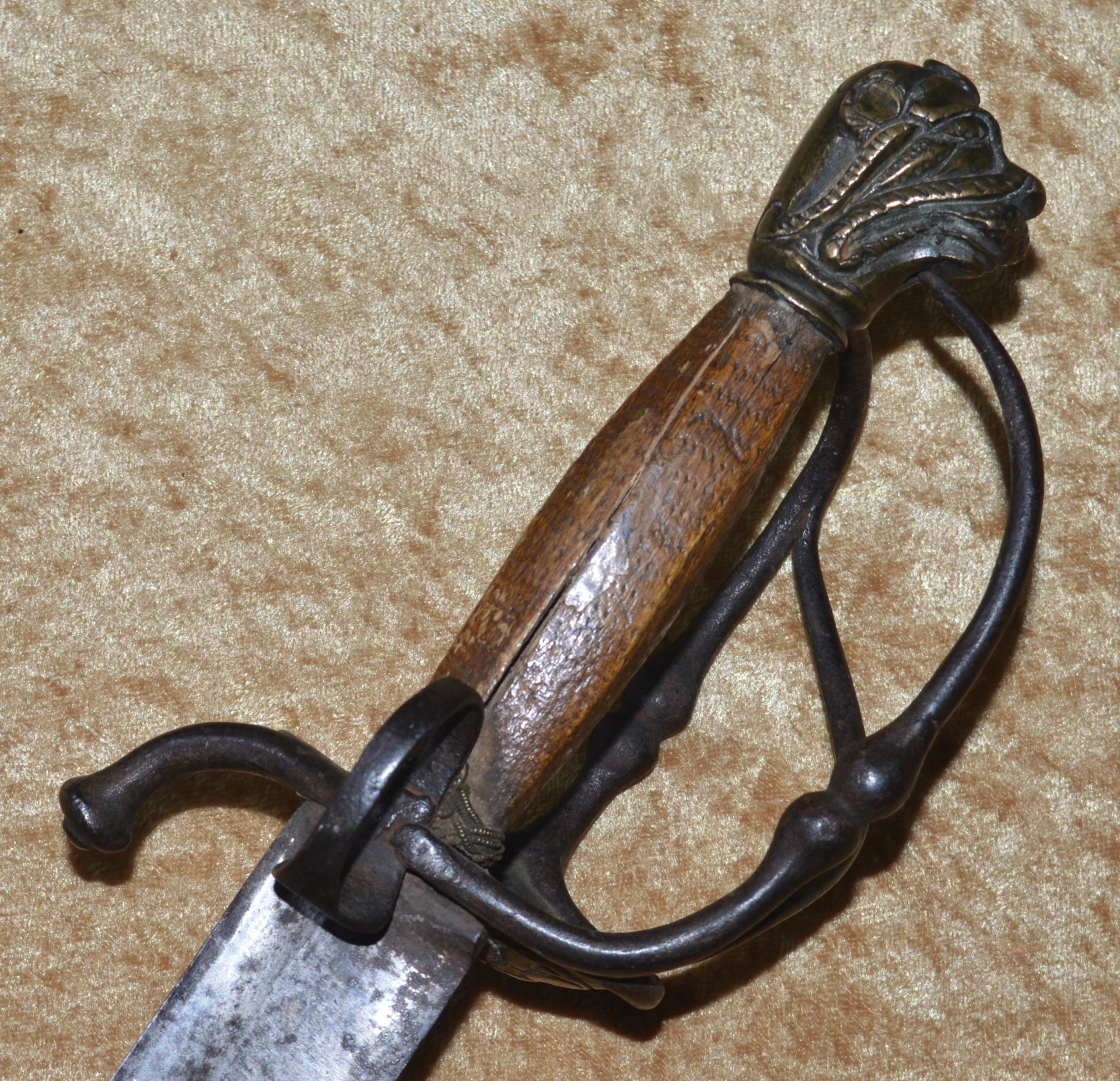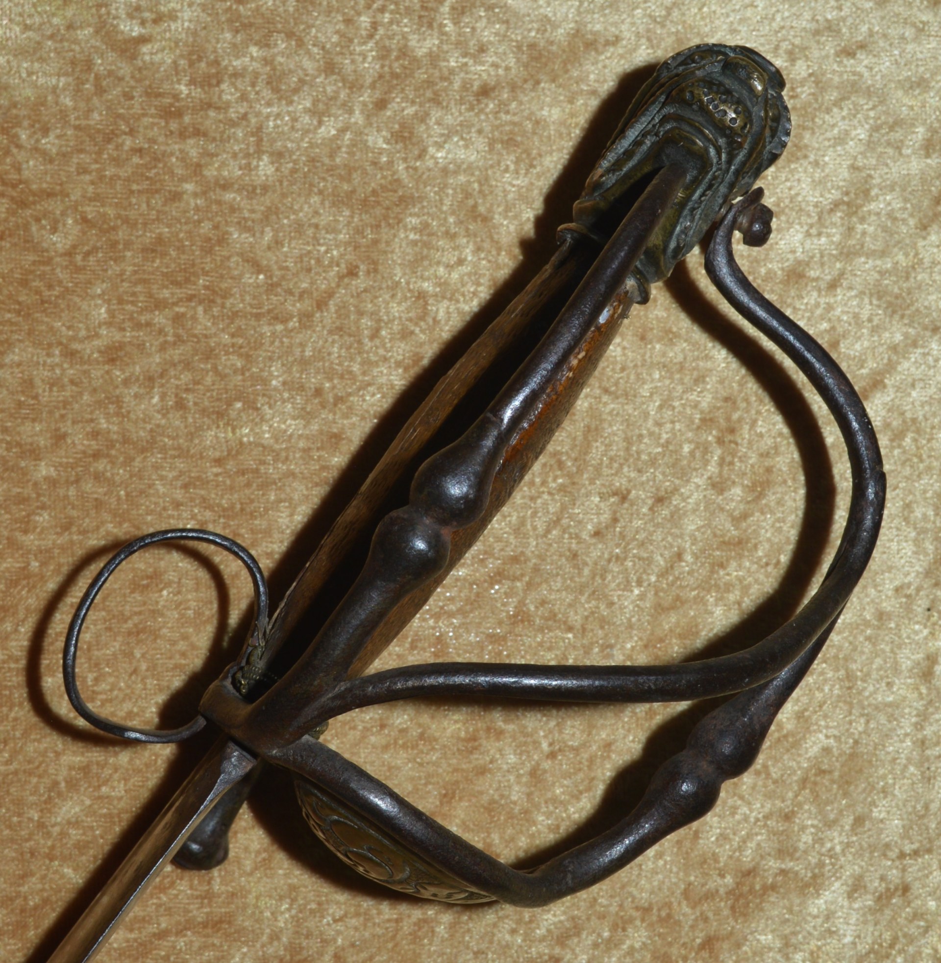 Featuring iron guard comprising single side ring, reverse scroll quillon with acorn finial,