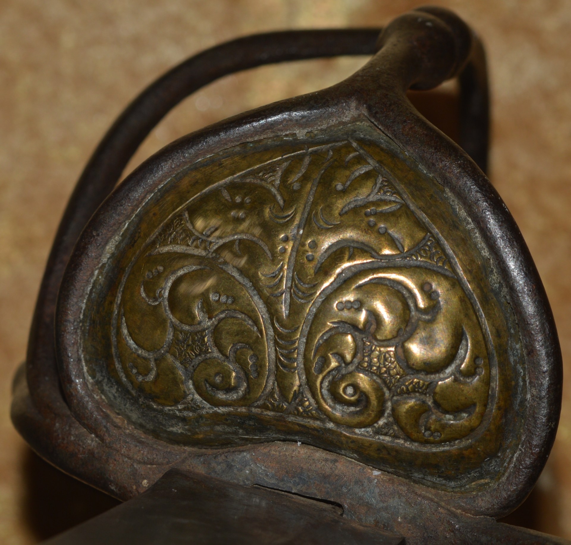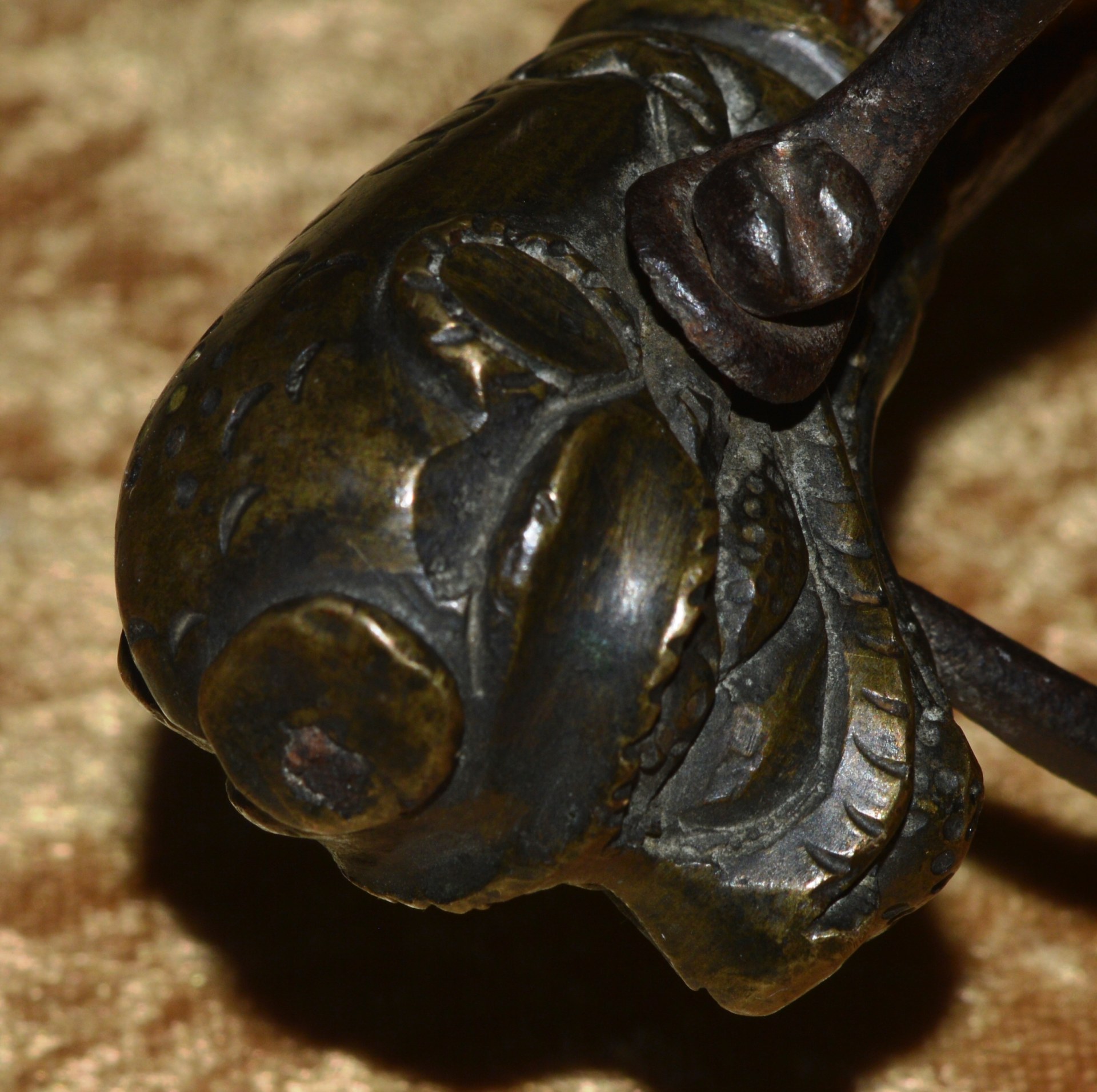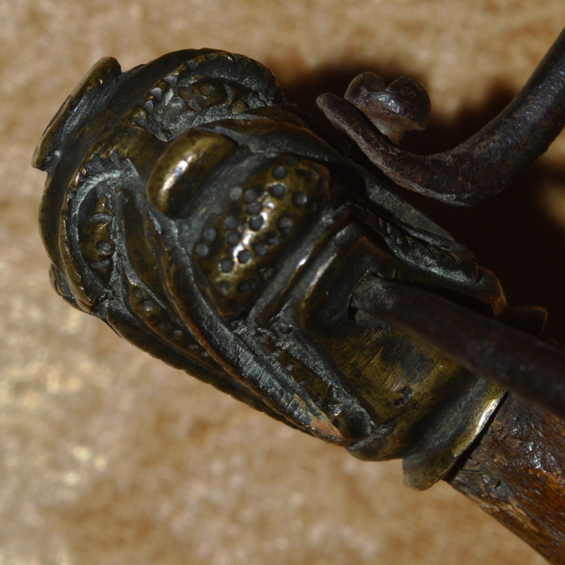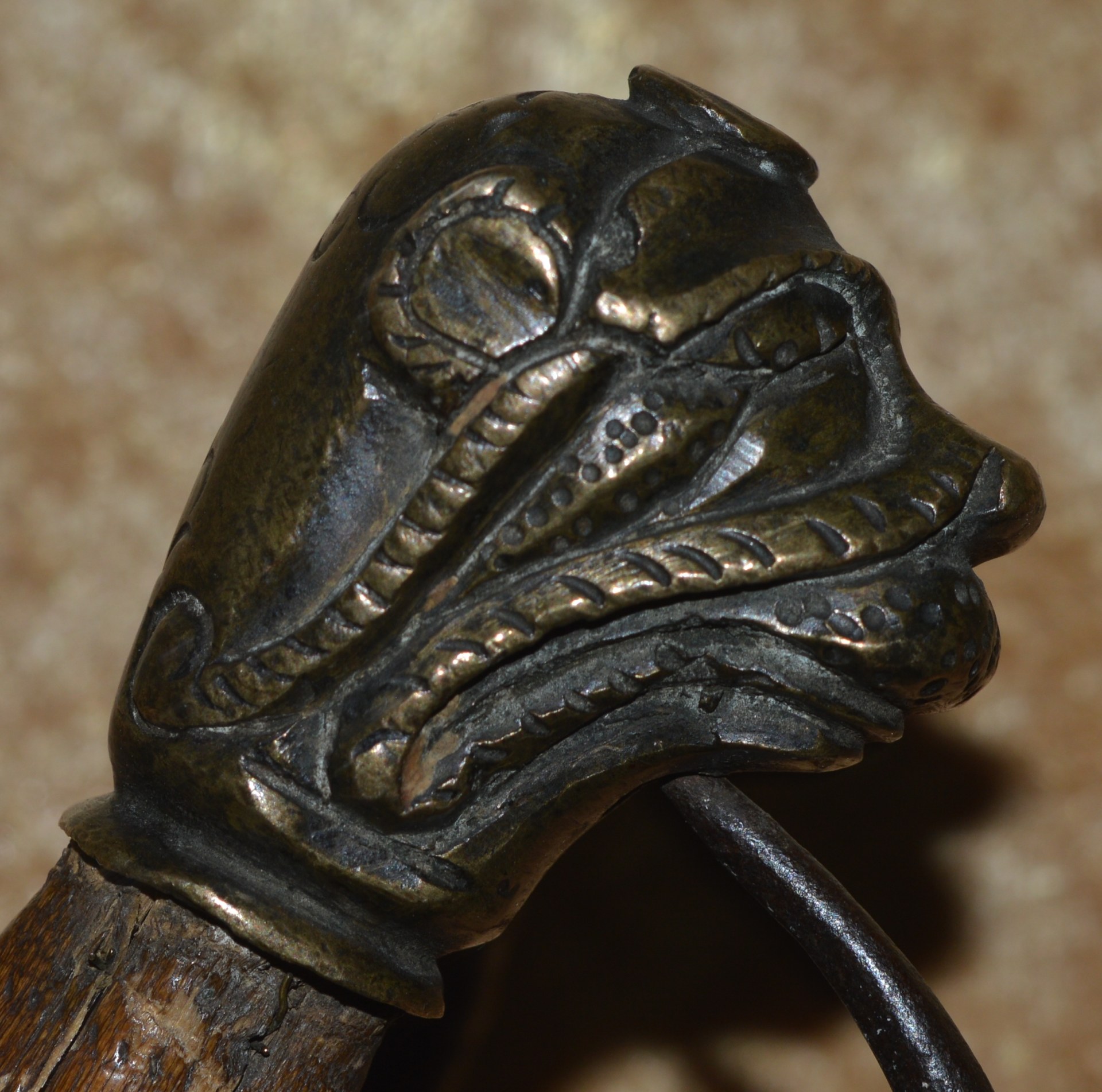 the brass dog-head pommel; thumb ring on reverse. Side ring filled with brass plate