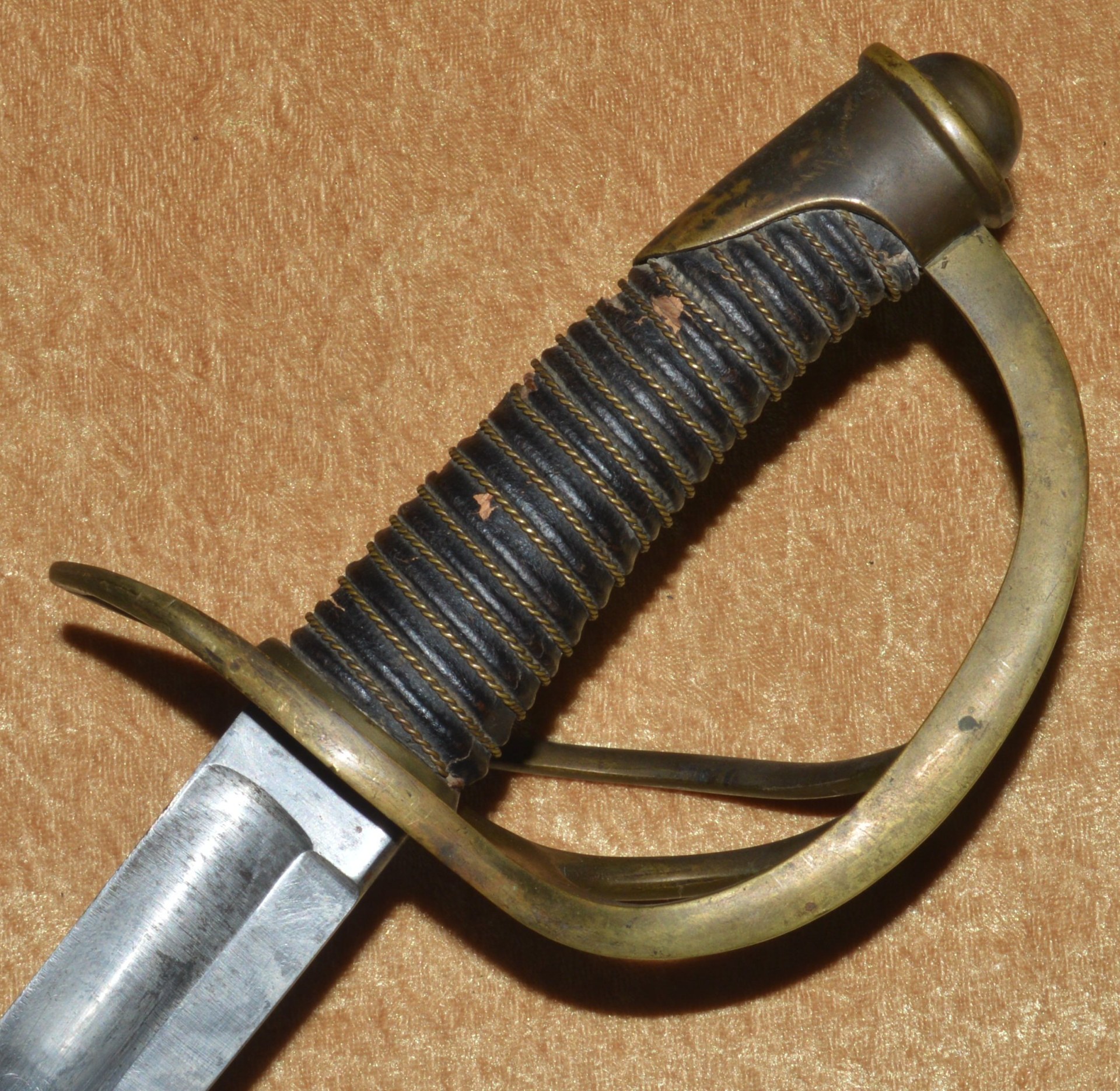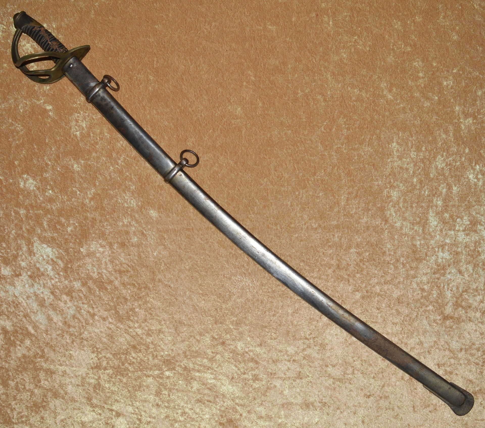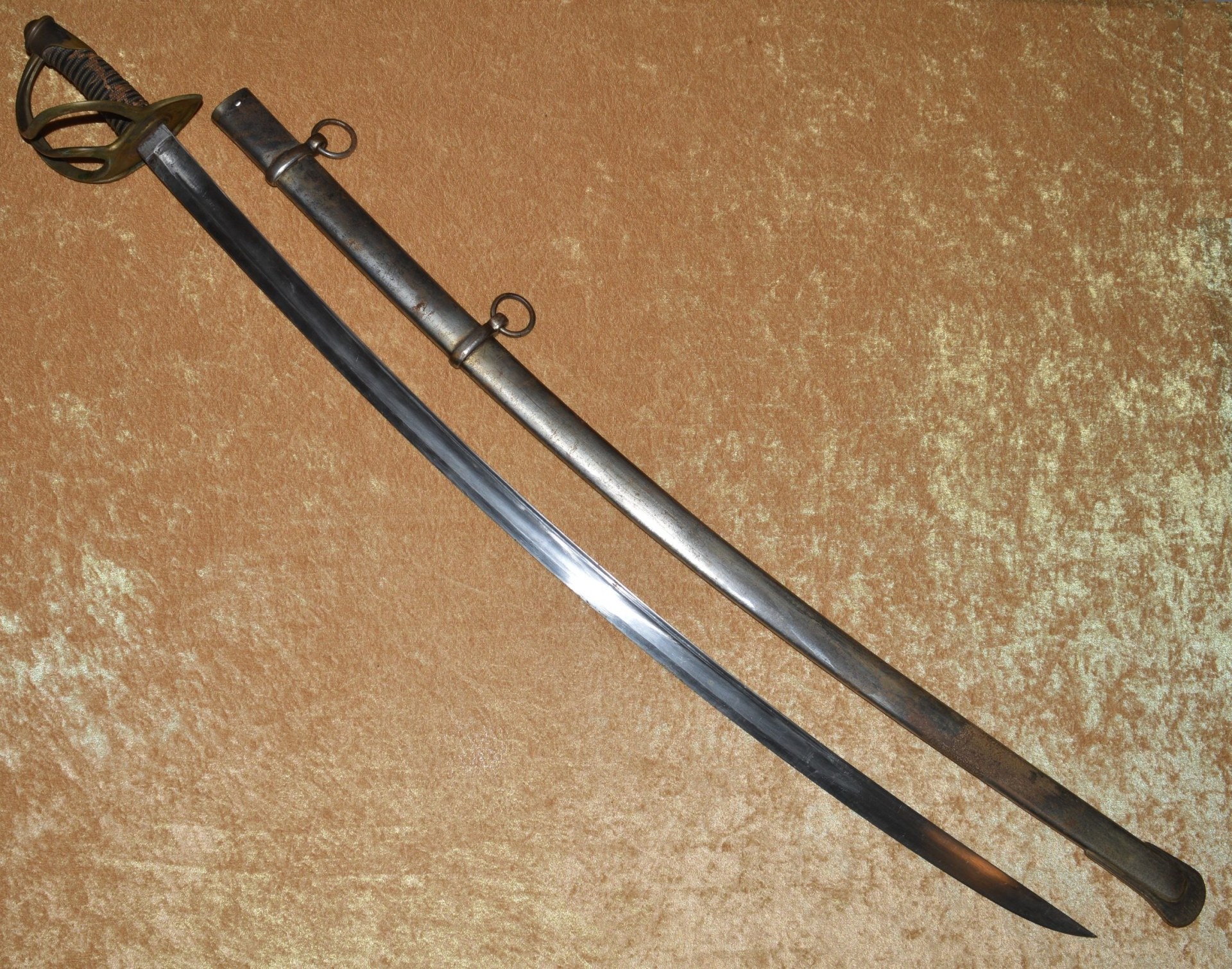 This model was the standard issue cavalry trooper=s sword until the lighter M1860 was introduced, but continued in use throughout the Civil War by both sides. Affectionately known as AOld Wristbreaker@ by the troops due to its size and weight, it was basically a US version of the French M1822 light cavalry saber. During most of the 19th C the French set the styles for swords, which were copied by most of Europe and the United States. The US M1840 was made by many firms and many were imported or used imported blades, primarily from Germany. This example featuring curved unmarked 35 5/8” single-edged blade with two fullers. Standard brass hilt with knuckle bow and two branches joining the Phrygian helmet style pommel. Wood grip with about 80% original leather and twisted brass wire wrap. Iron scabbard with twin carry rings, lacking throat ring. Blade bright, with scratches and nick free; scabbard with patches of rust. Overall length 41”, not including scabbard. Almost certainly a European import, and could have been used by either side during the Civil War.
