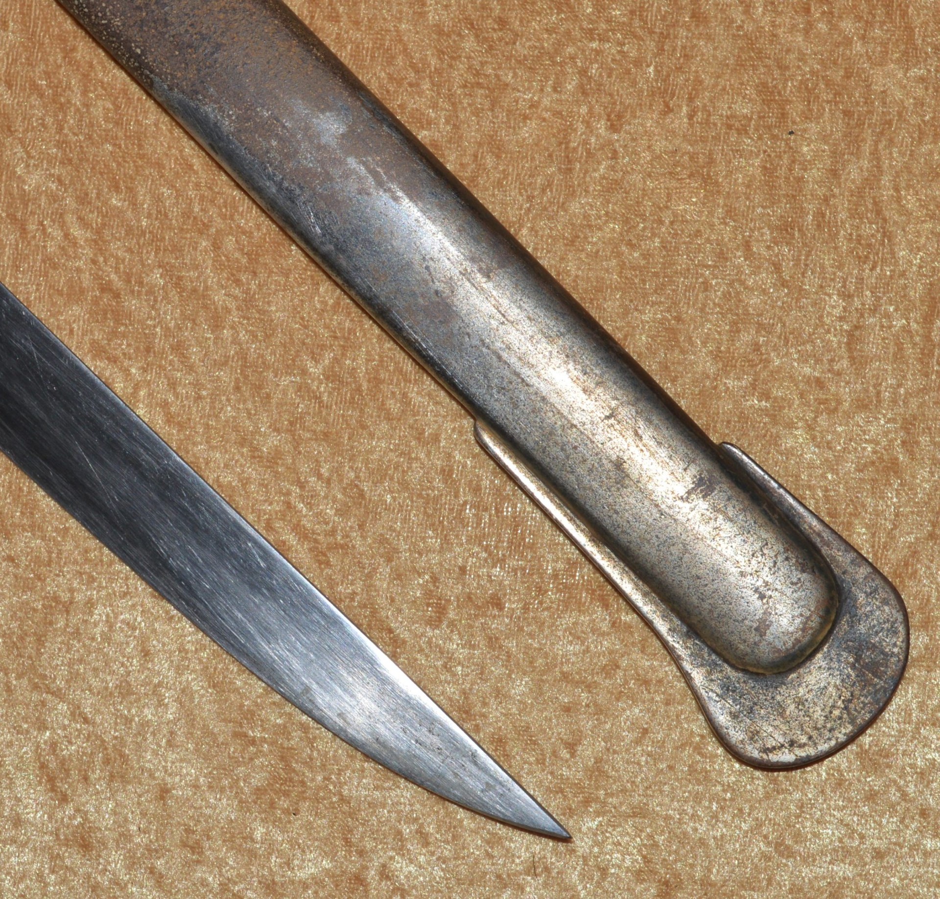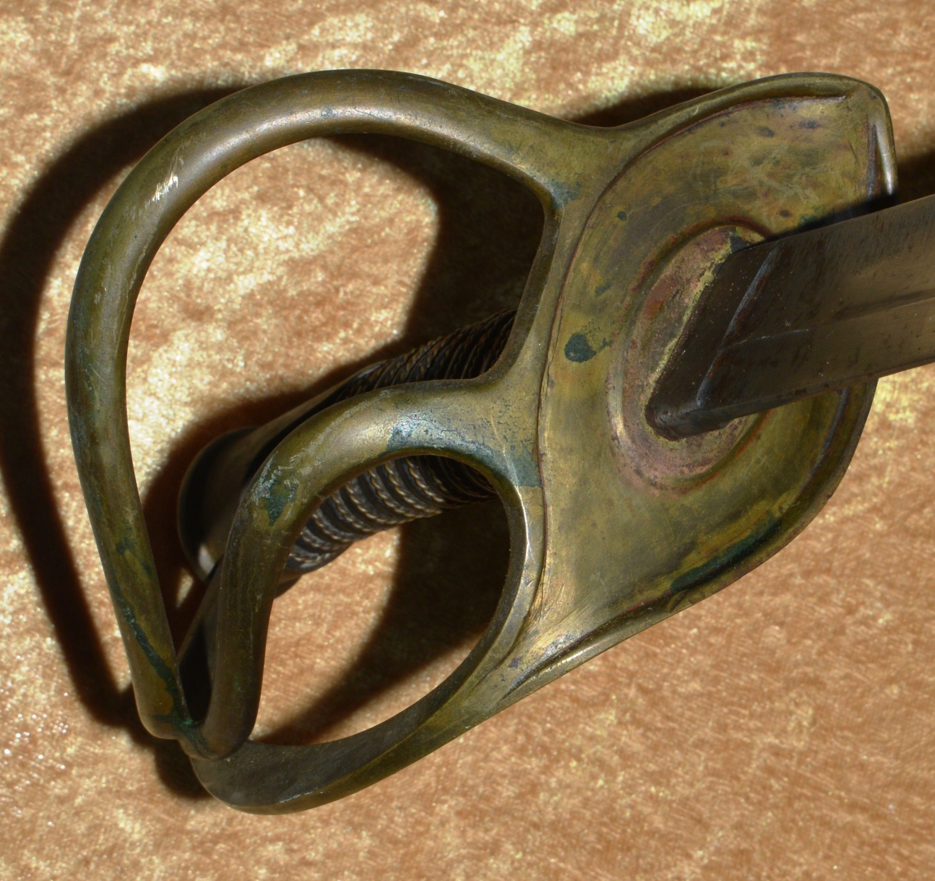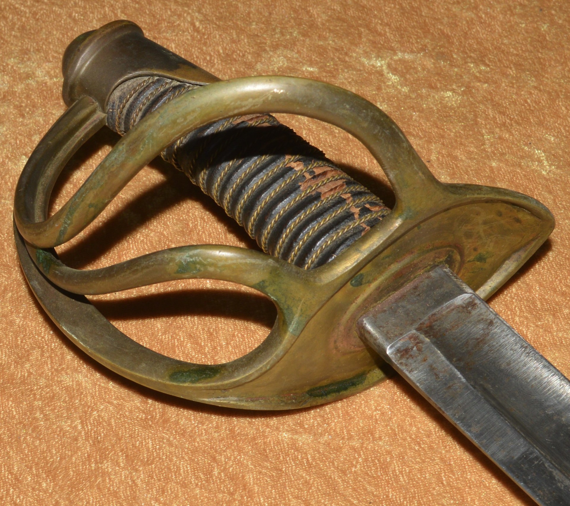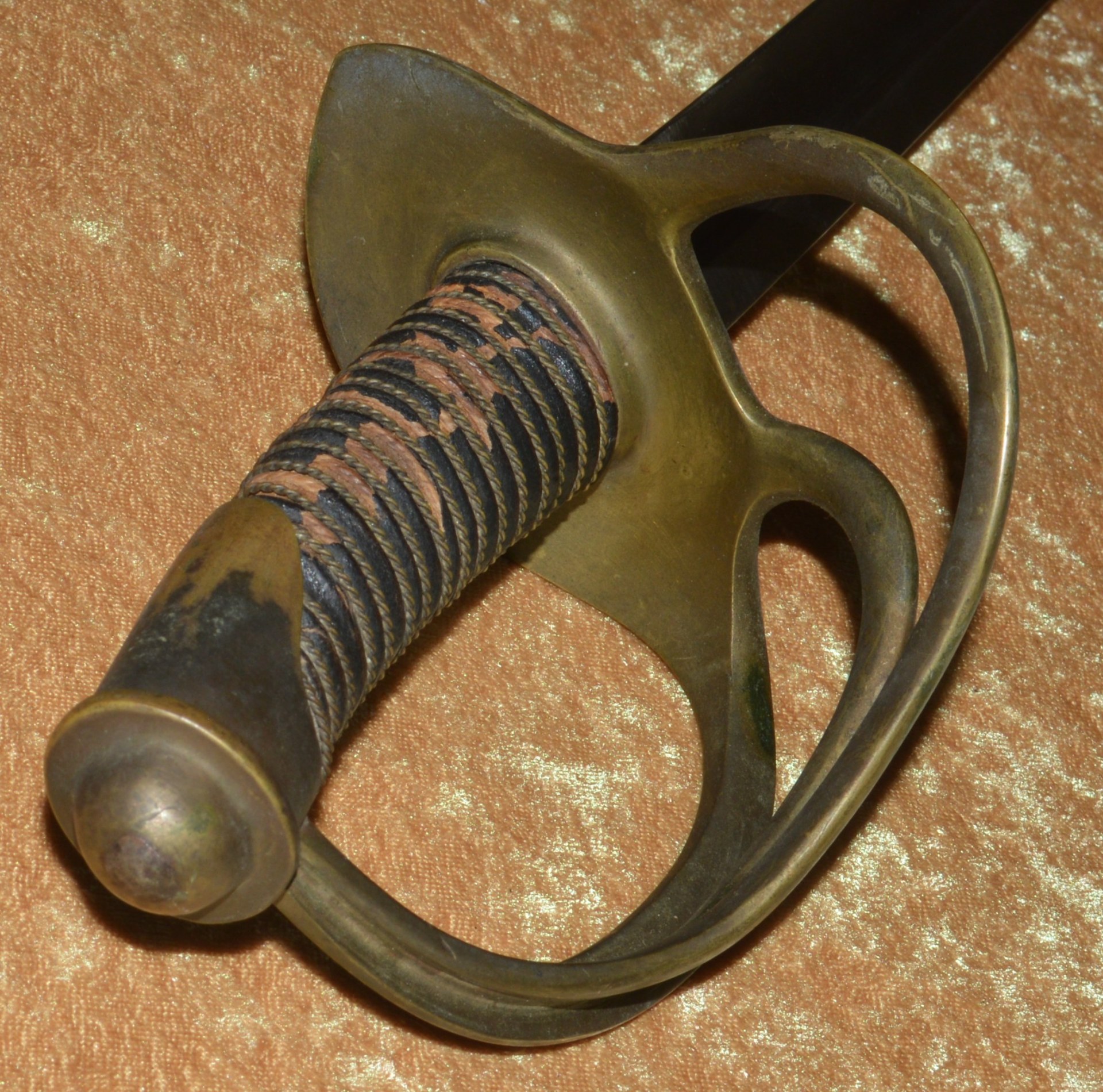 This model was the standard issue cavalry trooper=s sword until the lighter M1860 was introduced, but continued in use throughout the Civil War by both sides. Affectionately known as AOld Wristbreaker@ by the troops due to its size and weight, it was basically a US version of the French M1822 light cavalry saber. During most of the 19th C the French set the styles for swords, which were copied by most of Europe and the United States. The US M1840 was made by many firms and many were imported or used imported blades, primarily from Germany. This example featuring curved unmarked 35 5/8” single-edged blade with two fullers. Standard brass hilt with knuckle bow and two branches joining the Phrygian helmet style pommel. Wood grip with about 80% original leather and twisted brass wire wrap. Iron scabbard with twin carry rings, lacking throat ring. Blade bright, with scratches and nick free; scabbard with patches of rust. Overall length 41”, not including scabbard. Almost certainly a European import, and could have been used by either side during the Civil War.