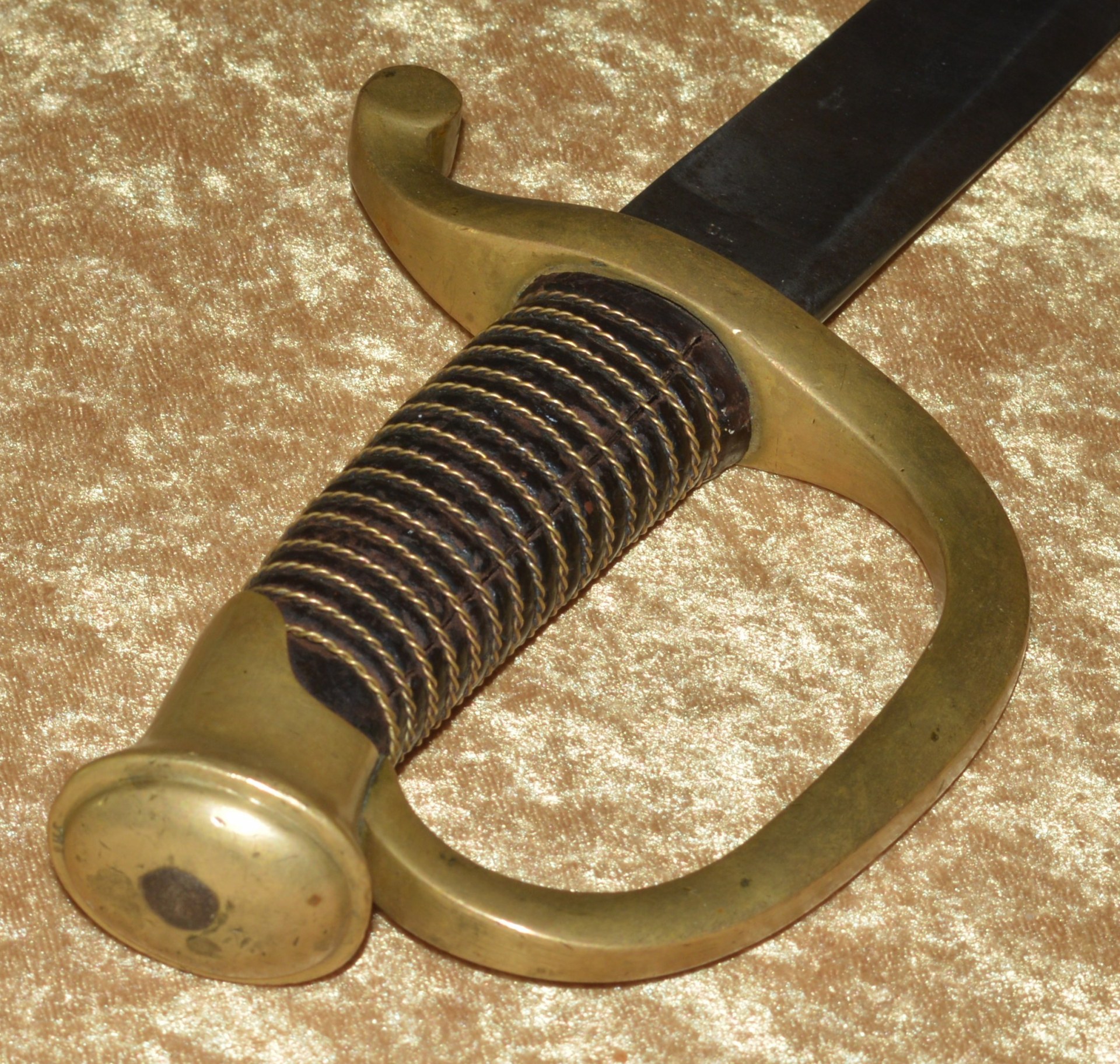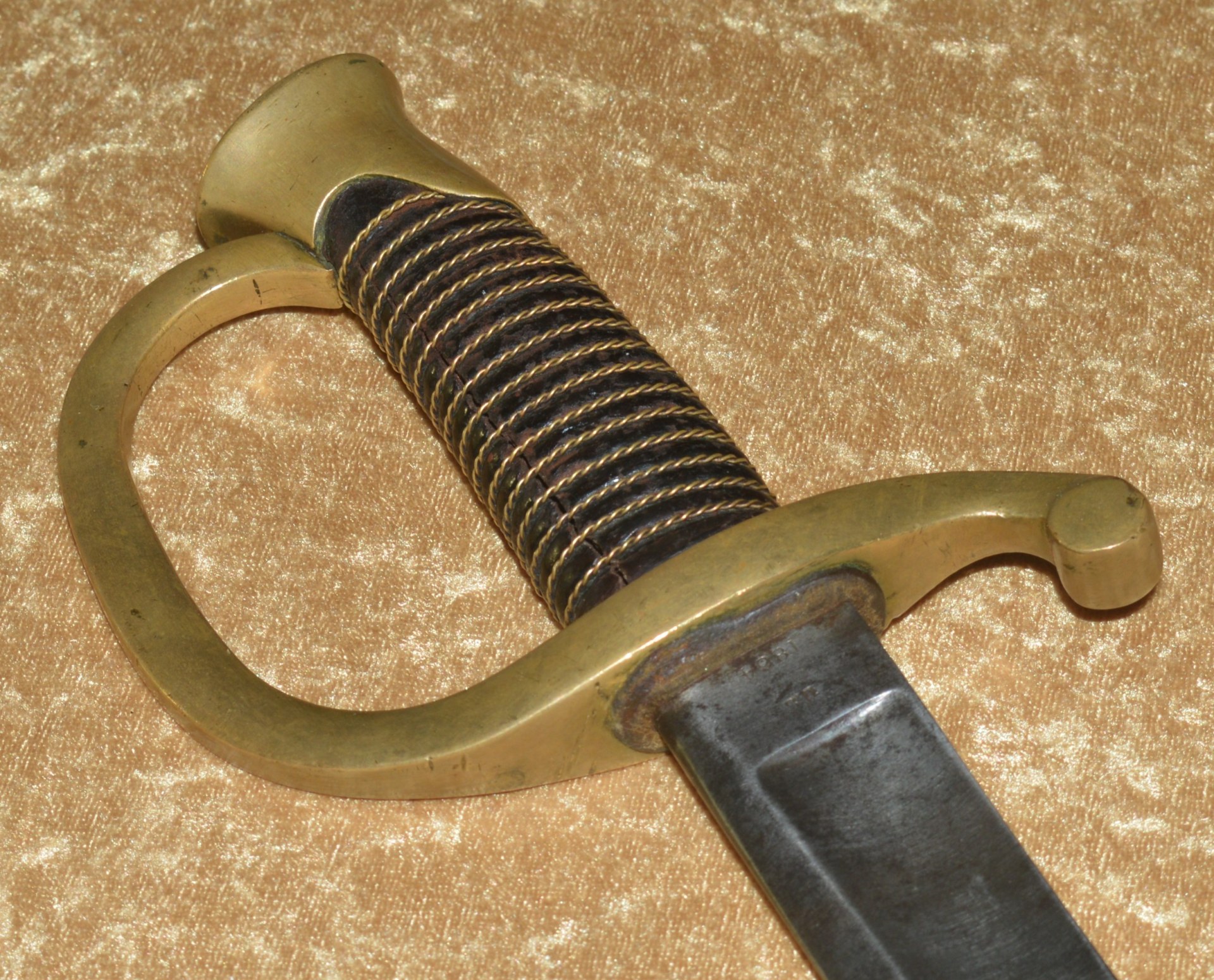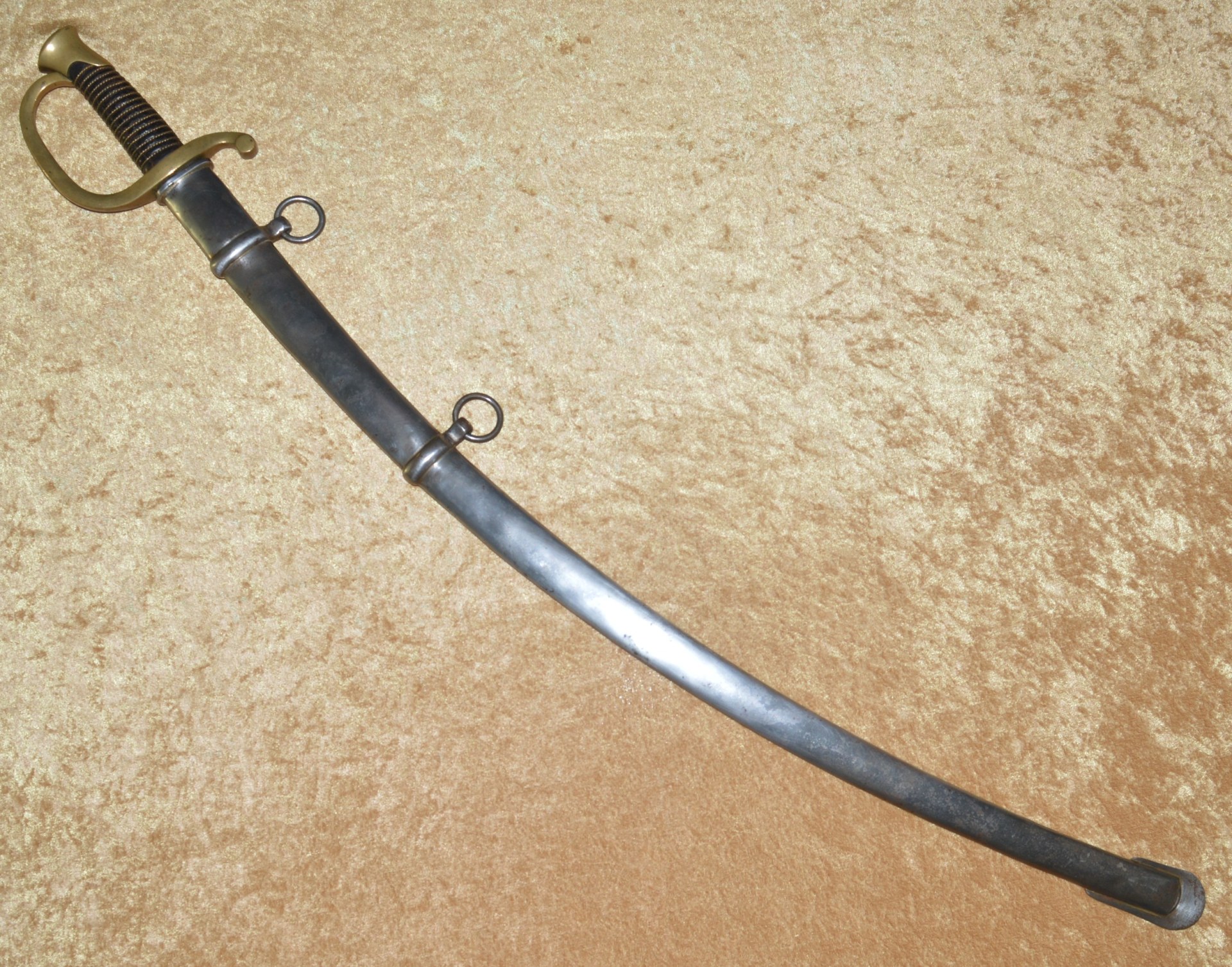Like most US swords of the 19th C, the US M1840 Light (Horse) Artillery Saber was patterned after a French model, in this case the M1829 Mounted Gunner’s Saber. On August 26, 1844, Nathan P. Ames, Jr. received his first contract for these new sabers. Ames made two versions of this saber and they were the only company contracted with the Ordnance Department to make them until 1861. The first version was patterned directly from the French M1829 and had no reinforced scabbard throat body, with the throat fitting into a raised casting at the bottom of the guard. These have been found as late as 1860. The second version, dated between 1861 and 1865, had the scabbard throat reinforced with a collar and the sword hilt had no recess. Instead, the scabbard fit against a leather washer on the base of the hilt to provide a waterproof seal. In all, 24,602 of these sabers were made by Ames between 1844 and 1865. This example with 32 1/4” curved single-edged blade with broad single fuller; the ricasso stamped on one side with “U.S./M.M./1864” (M. Moulton, civilian inspector), the other side with worn markings, now showing only a few faint letters and “MASS”, but certainly of Ames manufacture. Brass hilt with knuckle bow and reverse scroll quillon, attaching to the Phrygian helmet style pommel. Pommel with small “JH” stamp on top (either inspector John Hannis or Joseph Hannis, arsenal inspectors from 1844-1864). Leather-covered wood grip with twisted wire wrap. Steel scabbard with two carry rings, reinforced throat, and brazed drag. Very good condition, the blade bright with shallow edge nicks; brass guard with pleasing even patina; grip very good plus. Scabbard cleaned and showing some rust marking. Overall length 37 3/4”, not including scabbard.