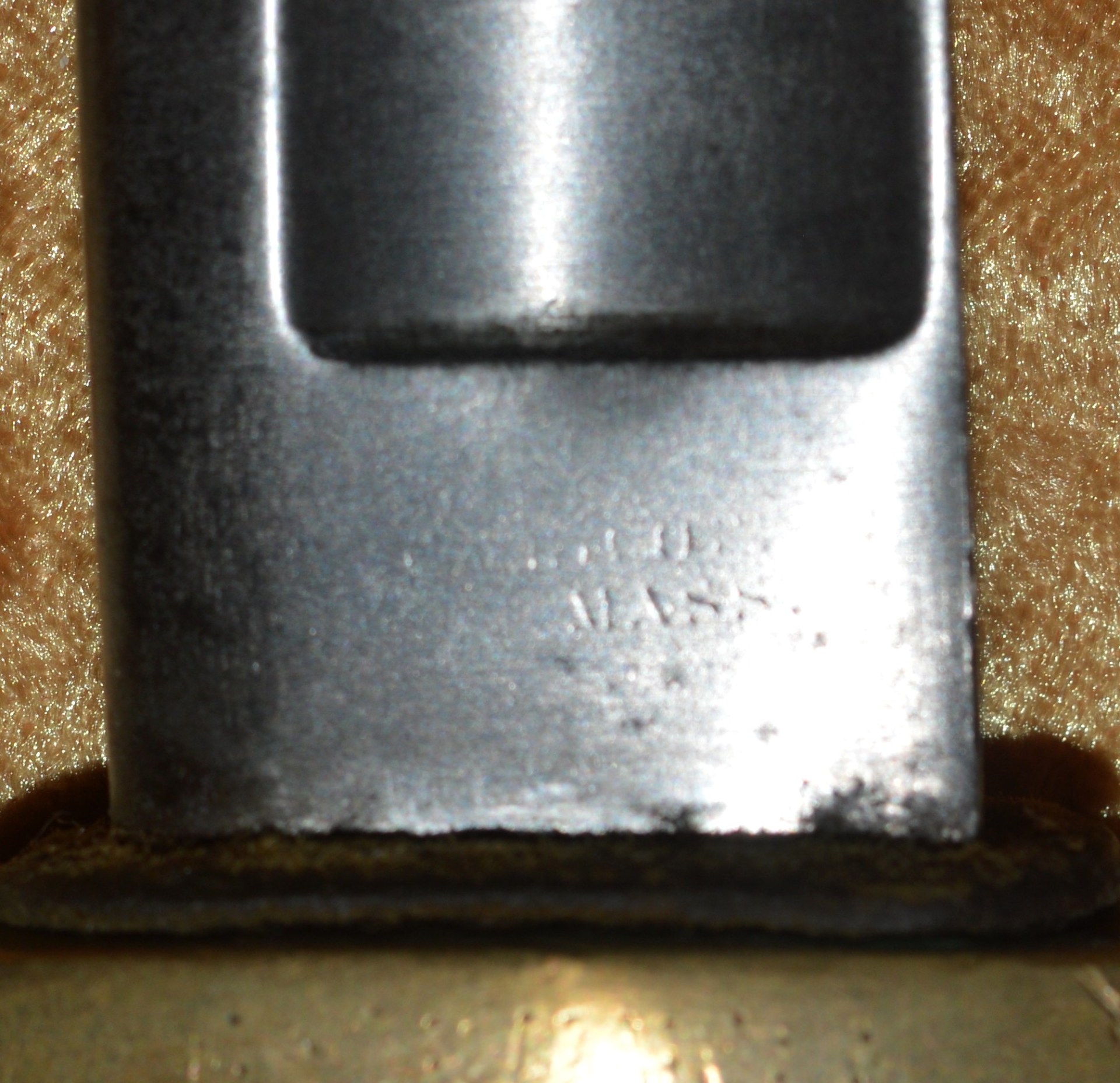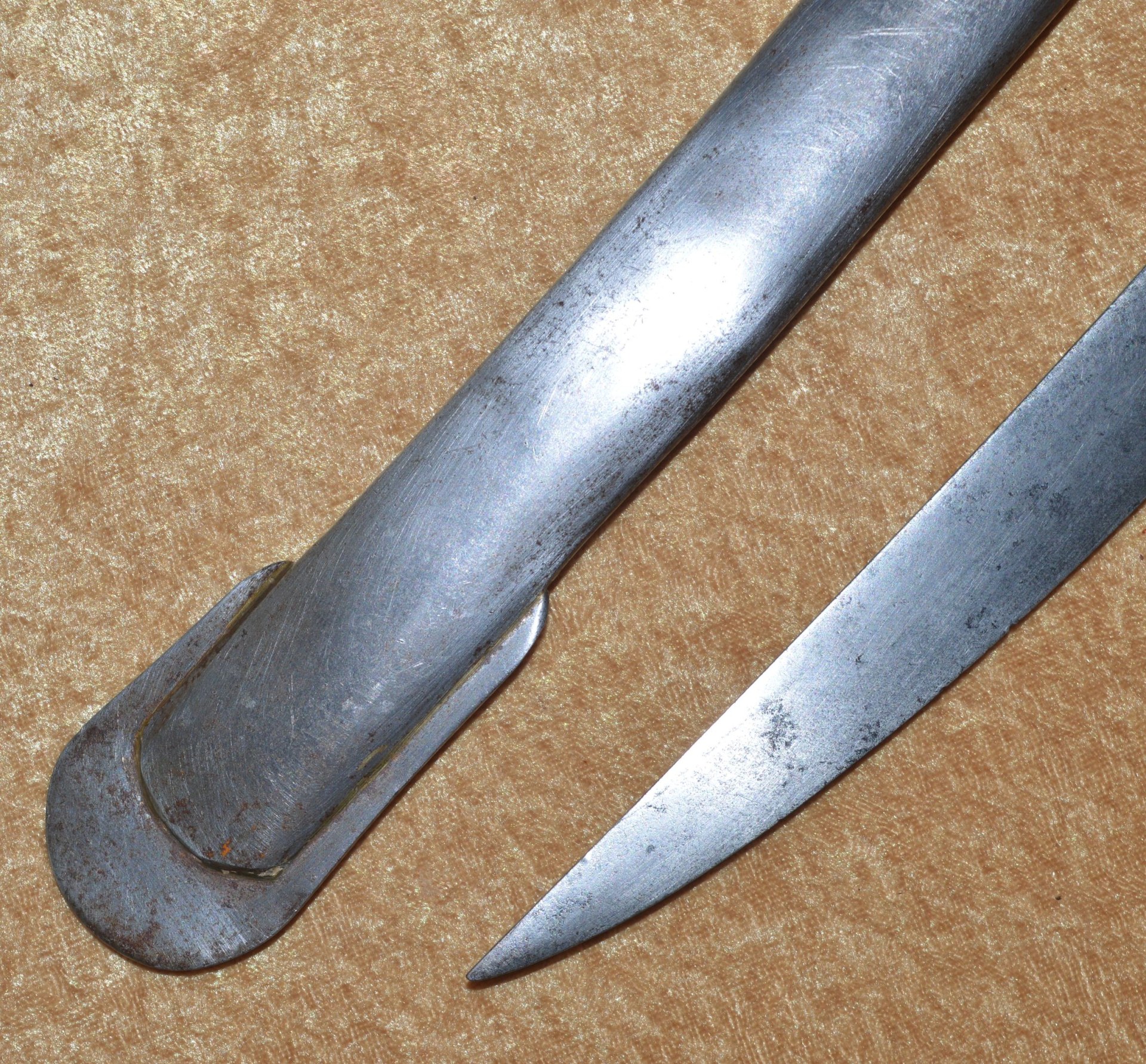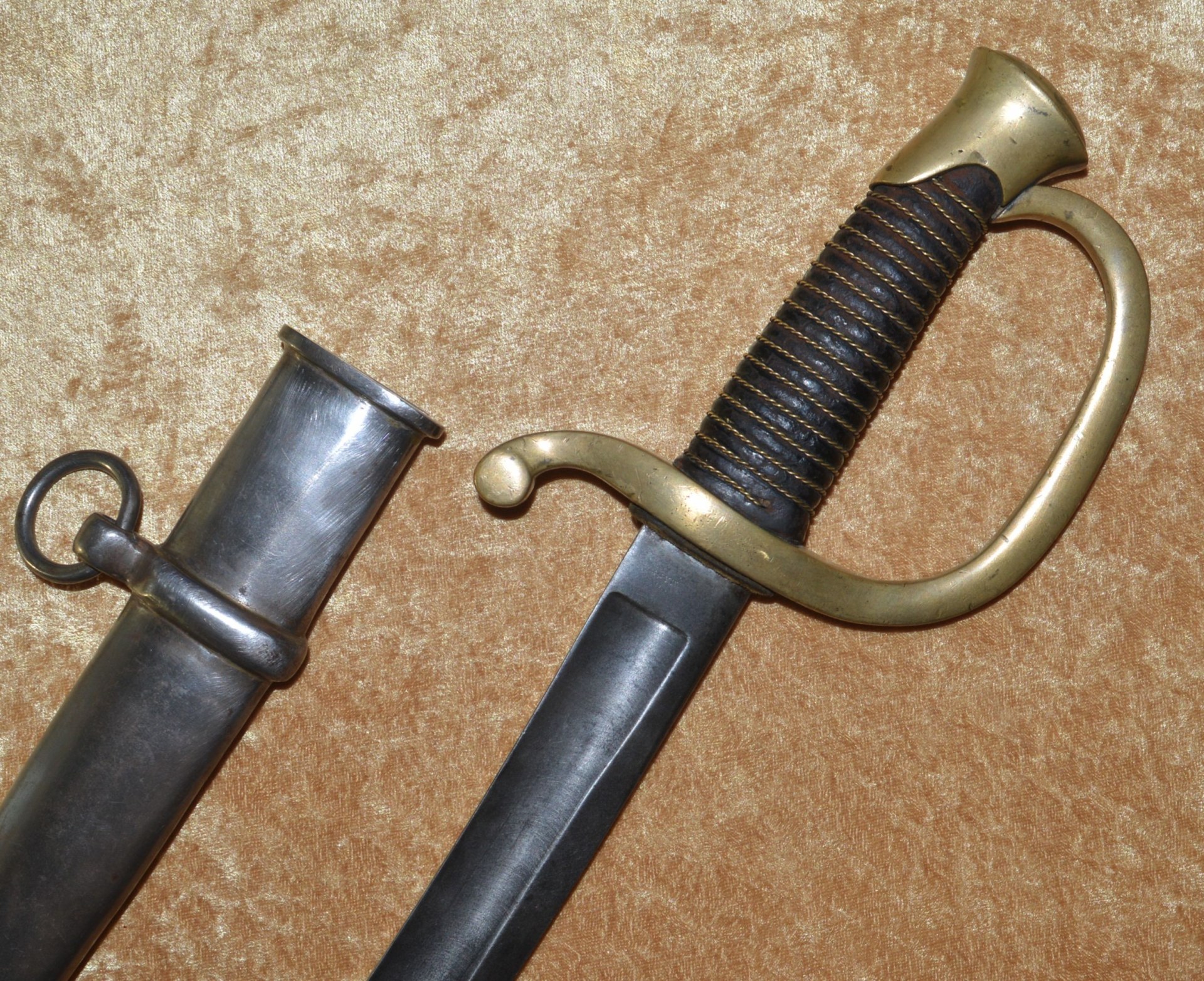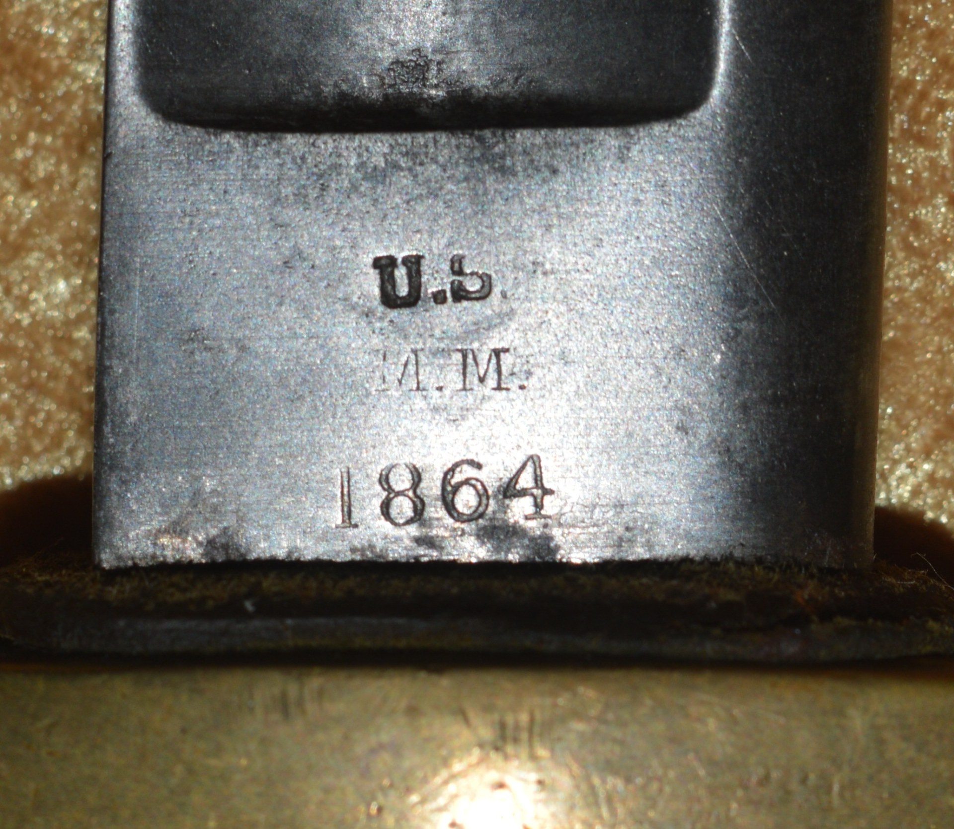 Like most US swords of the 19th C, the US M1840 Light (Horse) Artillery Saber was patterned after a French model, in this case the M1829 Mounted Gunner’s Saber. On August 26, 1844, Nathan P. Ames, Jr. received his first contract for these new sabers. Ames made two versions of this saber and they were the only company contracted with the Ordnance Department to make them until 1861. The first version was patterned directly from the French M1829 and had no reinforced scabbard throat body, with the throat fitting into a raised casting at the bottom of the guard. These have been found as late as 1860. The second version, dated between 1861 and 1865, had the scabbard throat reinforced with a collar and the sword hilt had no recess. Instead, the scabbard fit against a leather washer on the base of the hilt to provide a waterproof seal. In all, 24,602 of these sabers were made by Ames between 1844 and 1865. This example with 32 1/4” curved single-edged blade with broad single fuller; the ricasso stamped on one side with “U.S./M.M./1864” (M. Moulton, civilian inspector), the other side with worn markings, now showing only a few faint letters and “MASS”, but certainly of Ames manufacture. Brass hilt with knuckle bow and reverse scroll quillon, attaching to the Phrygian helmet style pommel. Pommel with small “JH” stamp on top (either inspector John Hannis or Joseph Hannis, arsenal inspectors from 1844-1864). Leather-covered wood grip with twisted wire wrap. Steel scabbard with two carry rings, reinforced throat, and brazed drag. Very good condition, the blade bright with shallow edge nicks; brass guard with pleasing even patina; grip very good plus. Scabbard cleaned and showing some rust marking. Overall length 37 3/4”, not including scabbard.