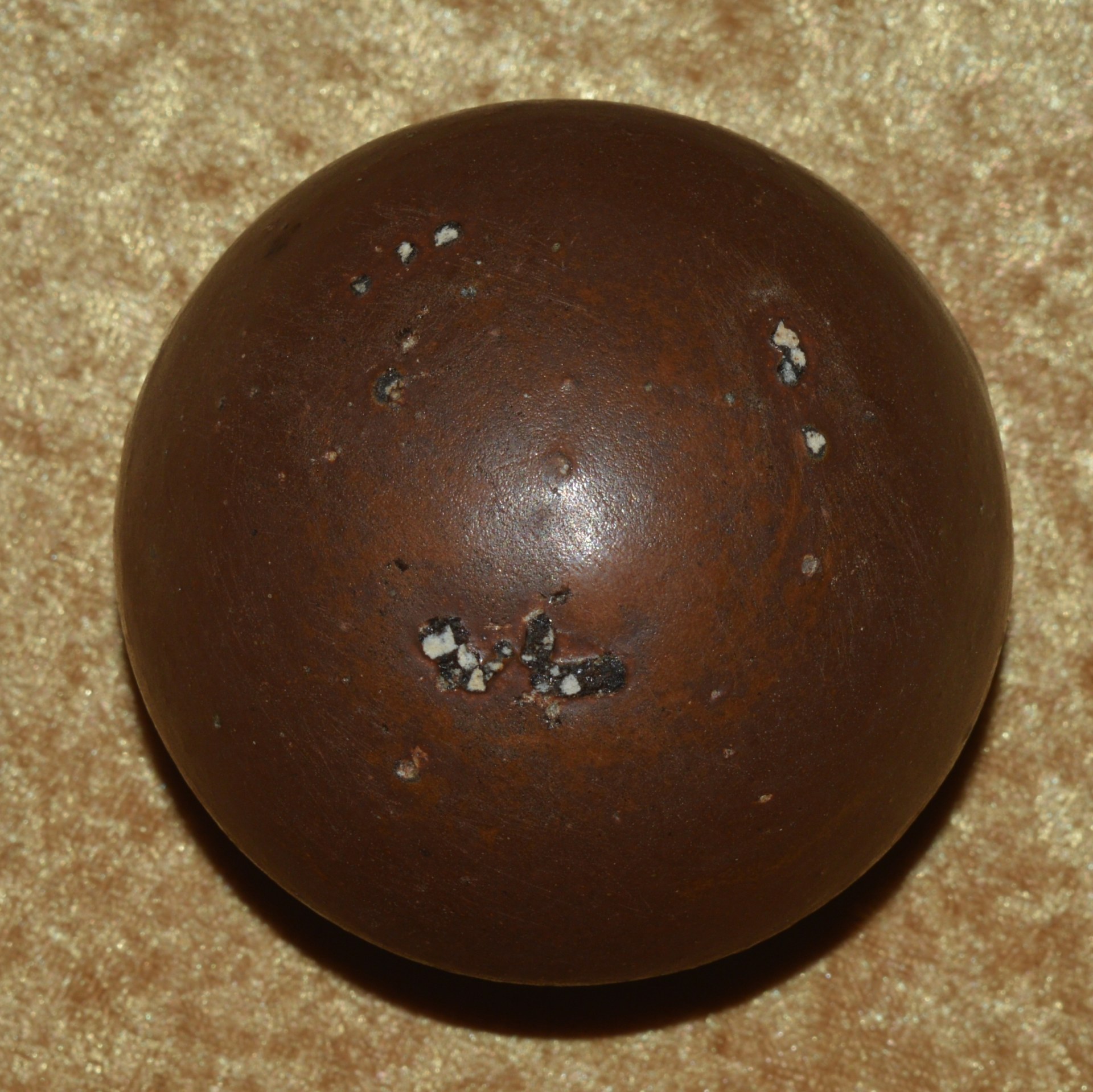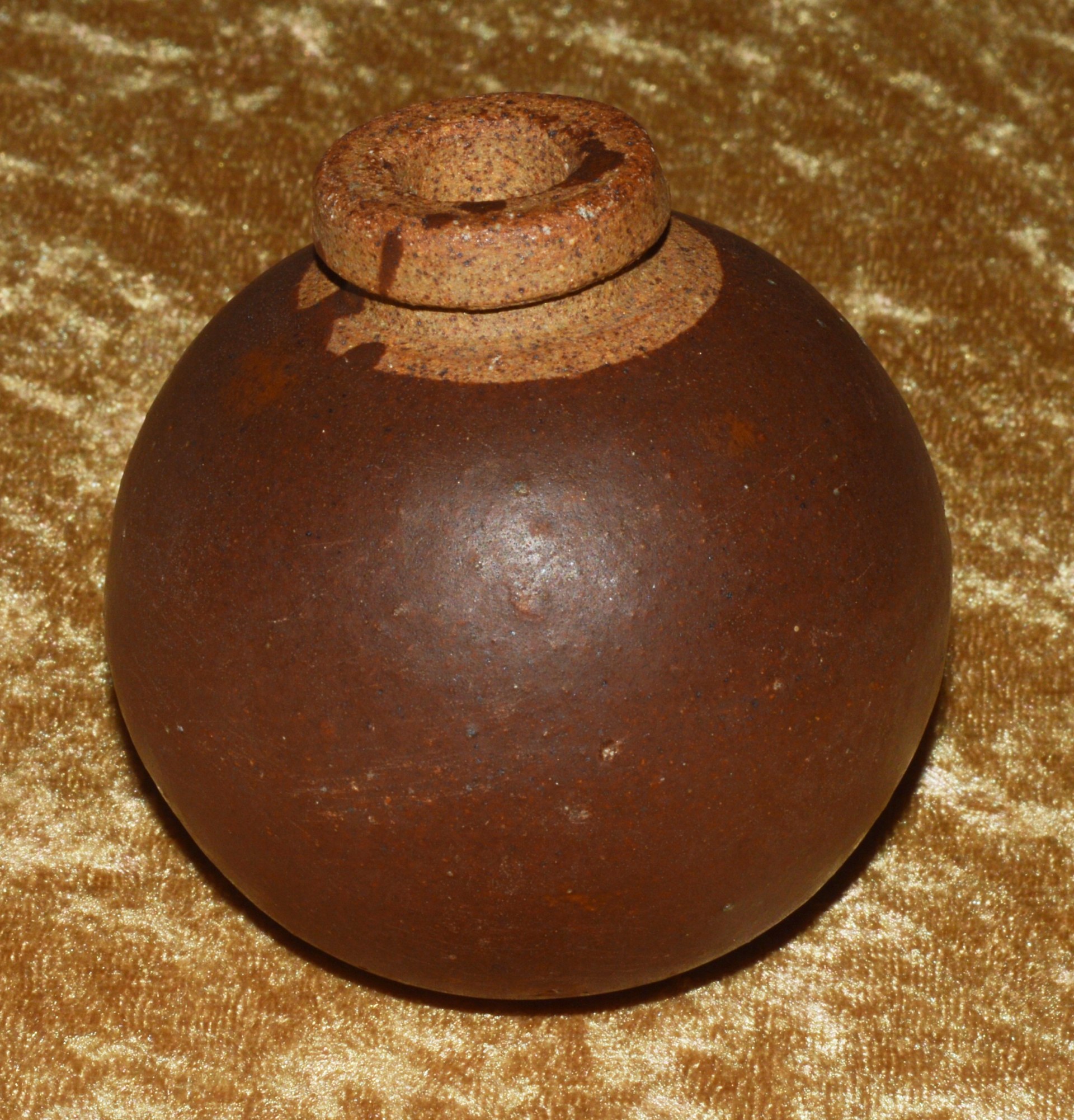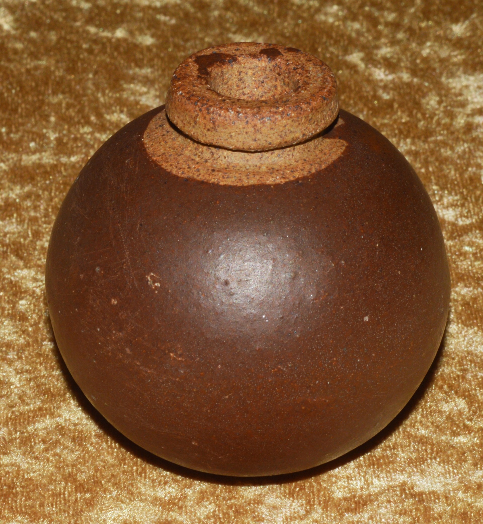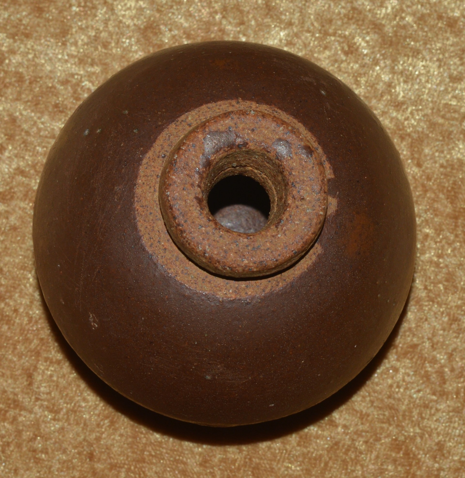 By late 1944, the Japanese industrial complex was so depleted by Allied strategic bombing that many “last ditch” weapons were introduced, which could be produced quickly, cheaply, and with minimal raw materials or infrastructure. The Type 4 Ceramic Grenade was one such weapon developed by the Japanese Navy Technical Bureau, and a logical choice because of the many kilns employed in Japanese pottery. Based on a centuries-old design, they incorporated a hollow, spherical terra cotta or porcelain fragmentation body with open round neck. They used a blasting cap crimped on to a 5-second fuze. On the other end of the fuze was a match-like composition, which could be ignited by rubbing with the loosely attached abrasive wood block. This assembly was then covered with a rubber cap to prevent accidental ignition or water damage. They were produced in large quantities and distributed to civil defense organizations in anticipation of an Allied invasion of the Japanese home islands, and also to front line combat troops. They were known to have been used by Japanese troops on Iwo Jima and Okinawa. Due to the many different kilns employed in their manufacture, they varied greatly in size, shape, and color. This example is approximately 3 1/8” (79 mm) diameter and painted brown with an tan neck. With a 1/2” (13 mm) opening for the fuze. Weight 11.25 ounces (319 g). No fuze or rubber cap; a few chips to the paint on the bottom. Price includes US Continental shipping.